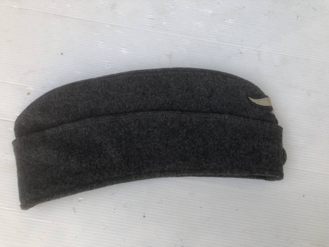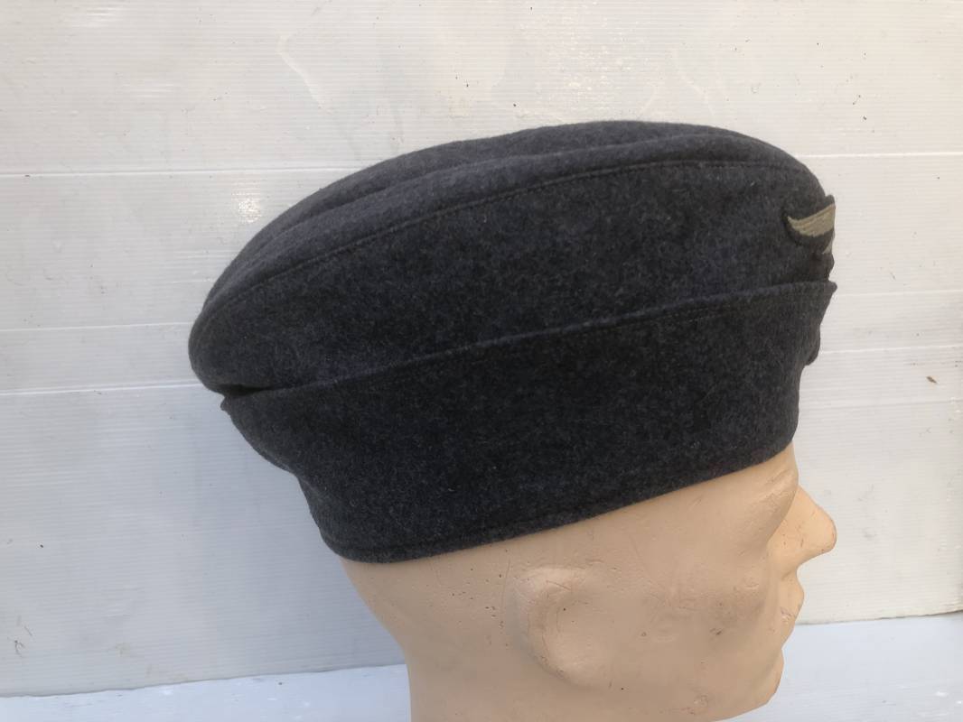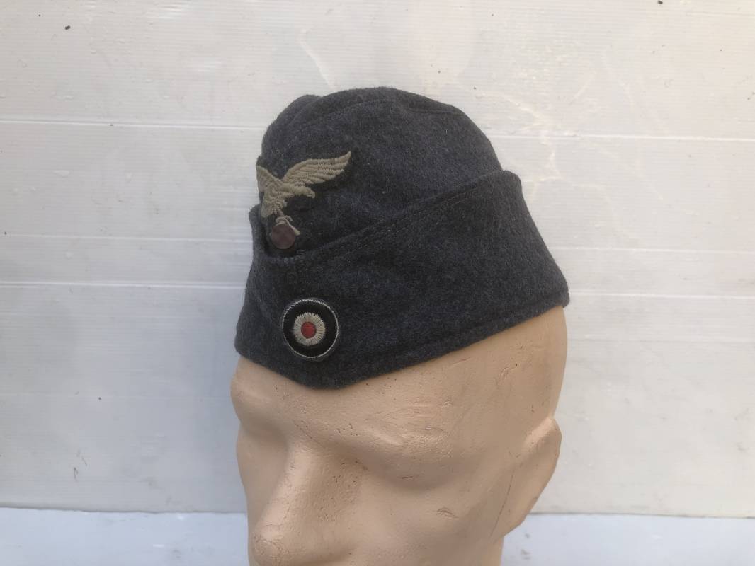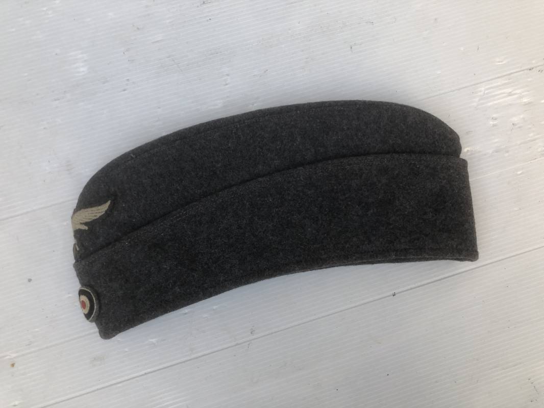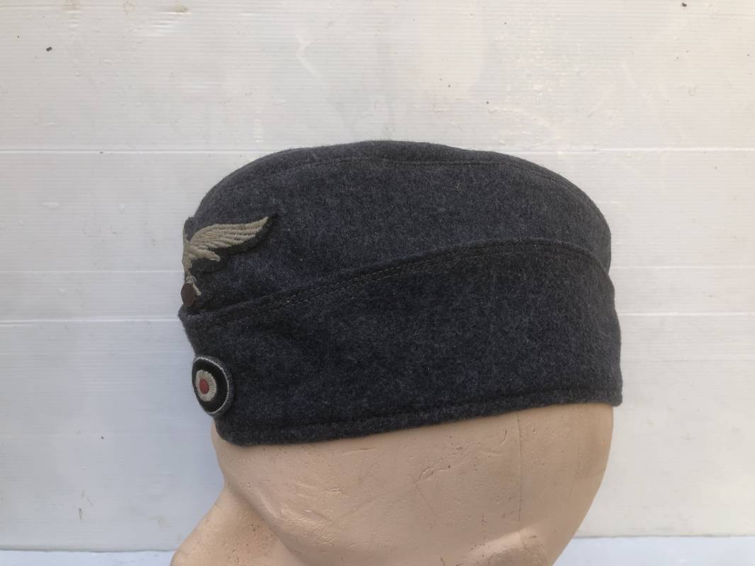 Trés beau calot troupe modéle 1935 de la Luftwaffe . Calot de dotation en drap gris bleu . Rabats , insigne brodés coton aigle et cocarde . Intérieur doublé en coton gris bleu , marquage encre balnc code fabricant Rbnr . Taille 56 . Légèrement porté en trés bel état 1935/45 Ref 19684