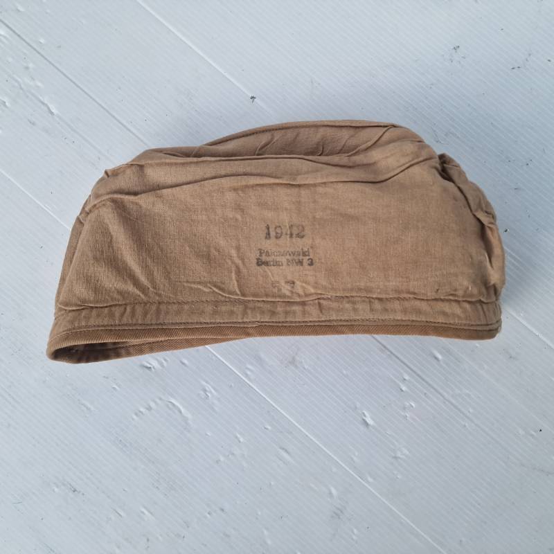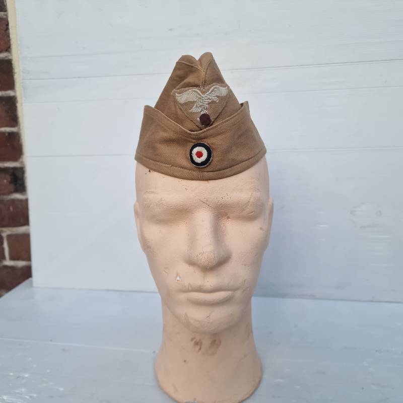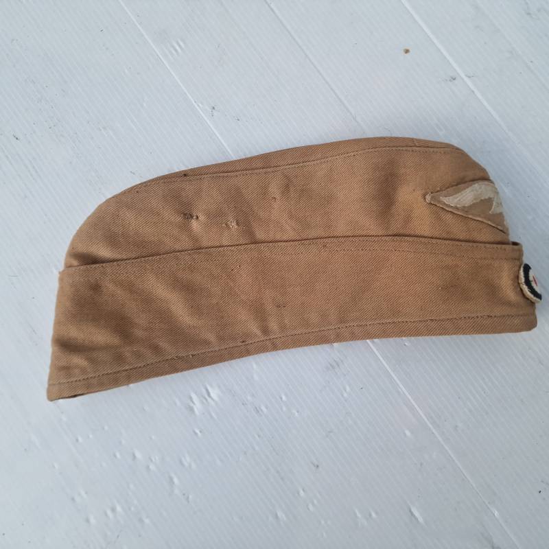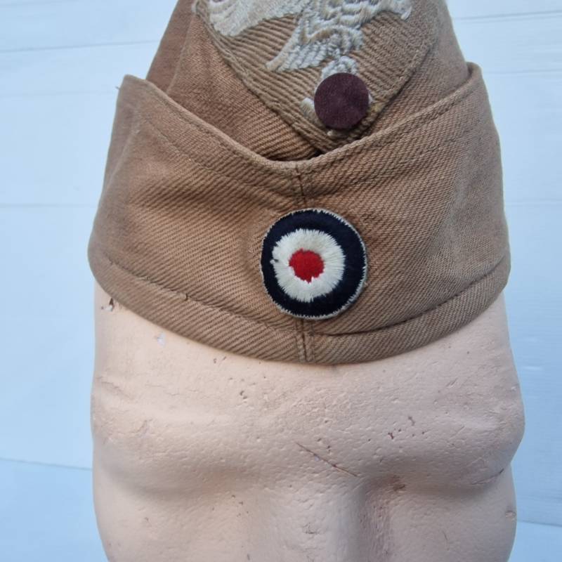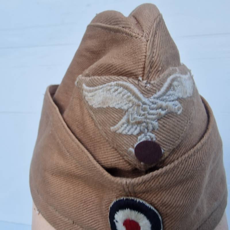 Rare calot trpopical modéle 1941 de la luftwaffe . Calot en toile de coton jaune sable . Rabats en toile . Aigle et cocarde du modéle tropical brodés coton . Intérieur doublé en toile de coton jaune , marquage fabricant Paischwick Berlin 1942 Taille 57 . Calot de dotation légérement porté en bel état 19141/43 Ref 19632