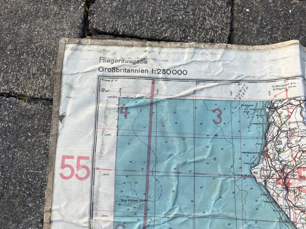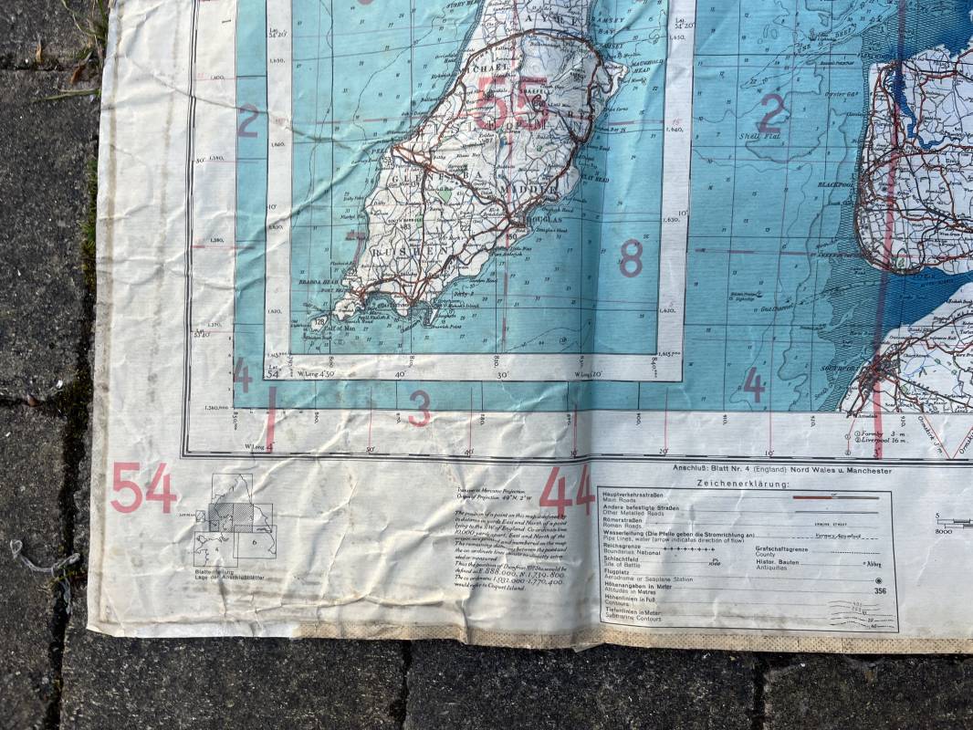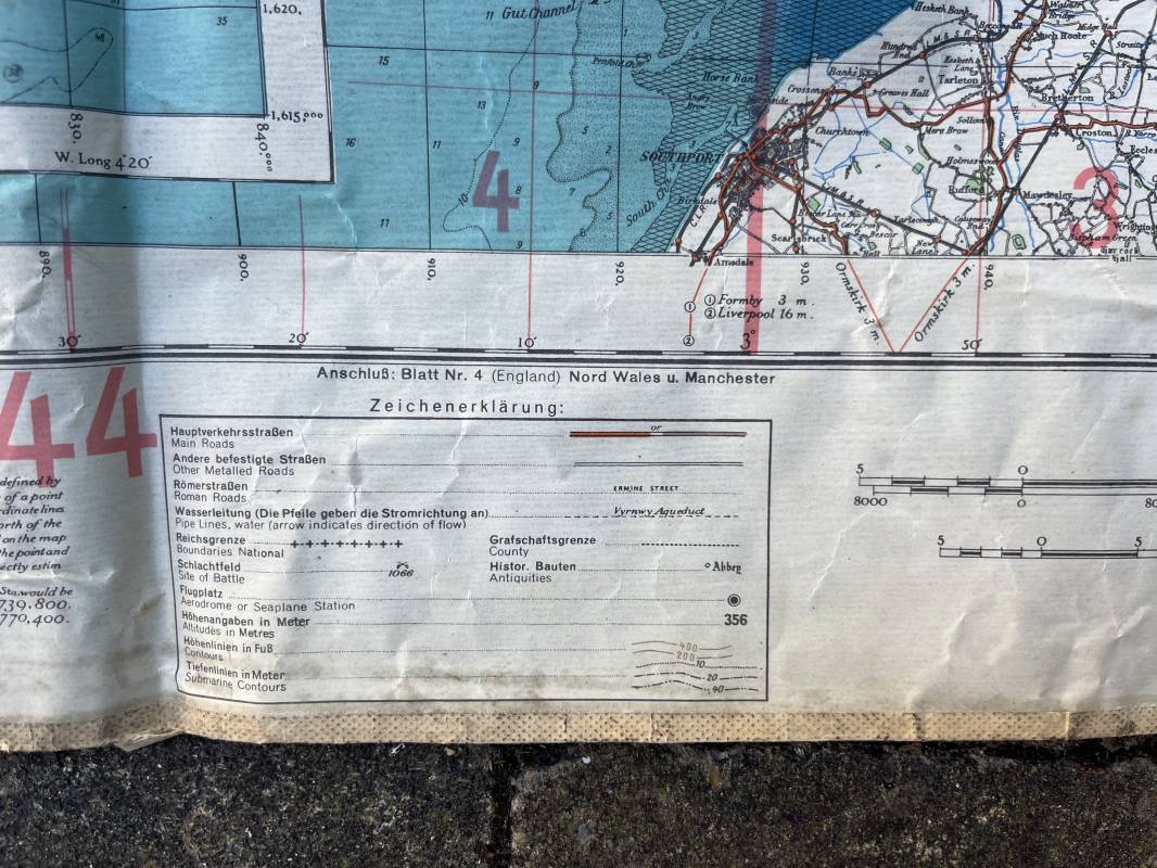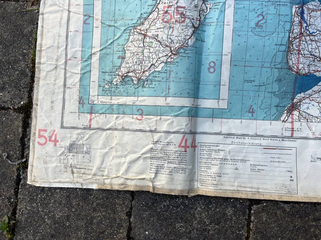 Rare carte de vol d'un navigant de la Luftwaffe . Carte en toile plastifiée dimensions 900X620 mm . Angleterre Centre ' . Secteur ville Preston . Beles couleurs . Utilisé en bel état . Ref 18181