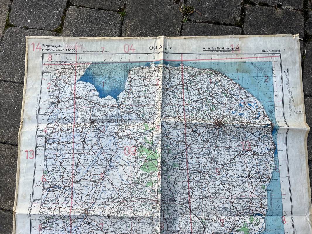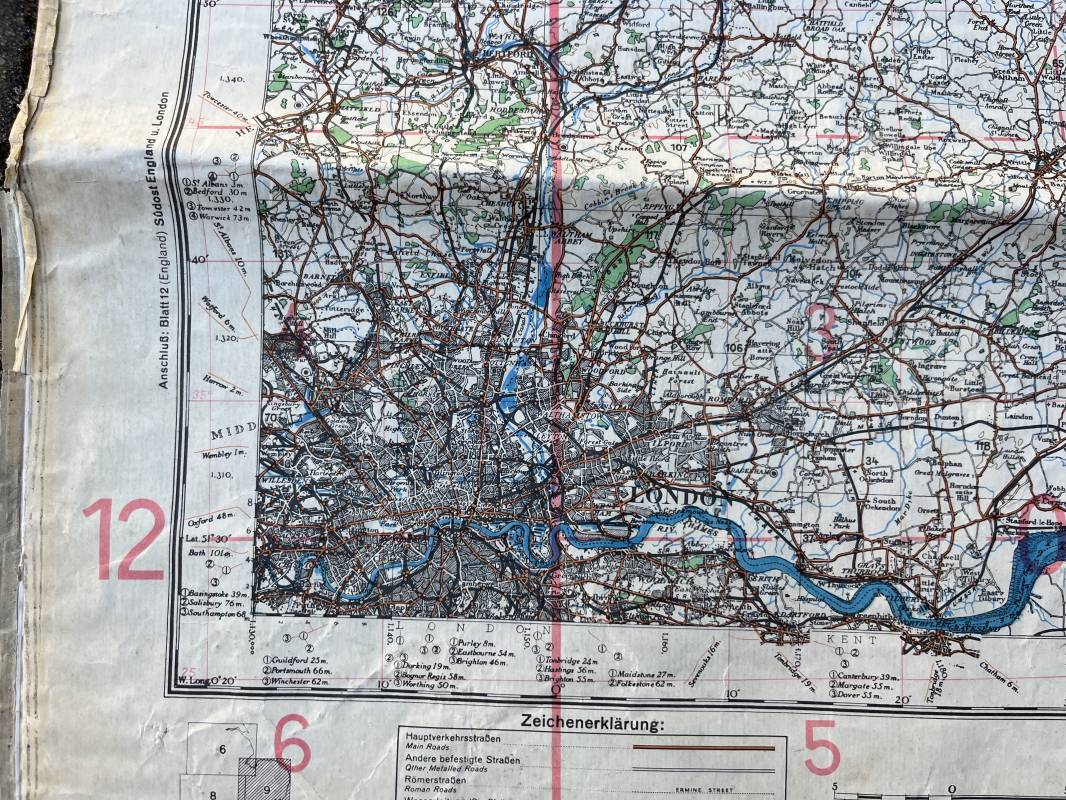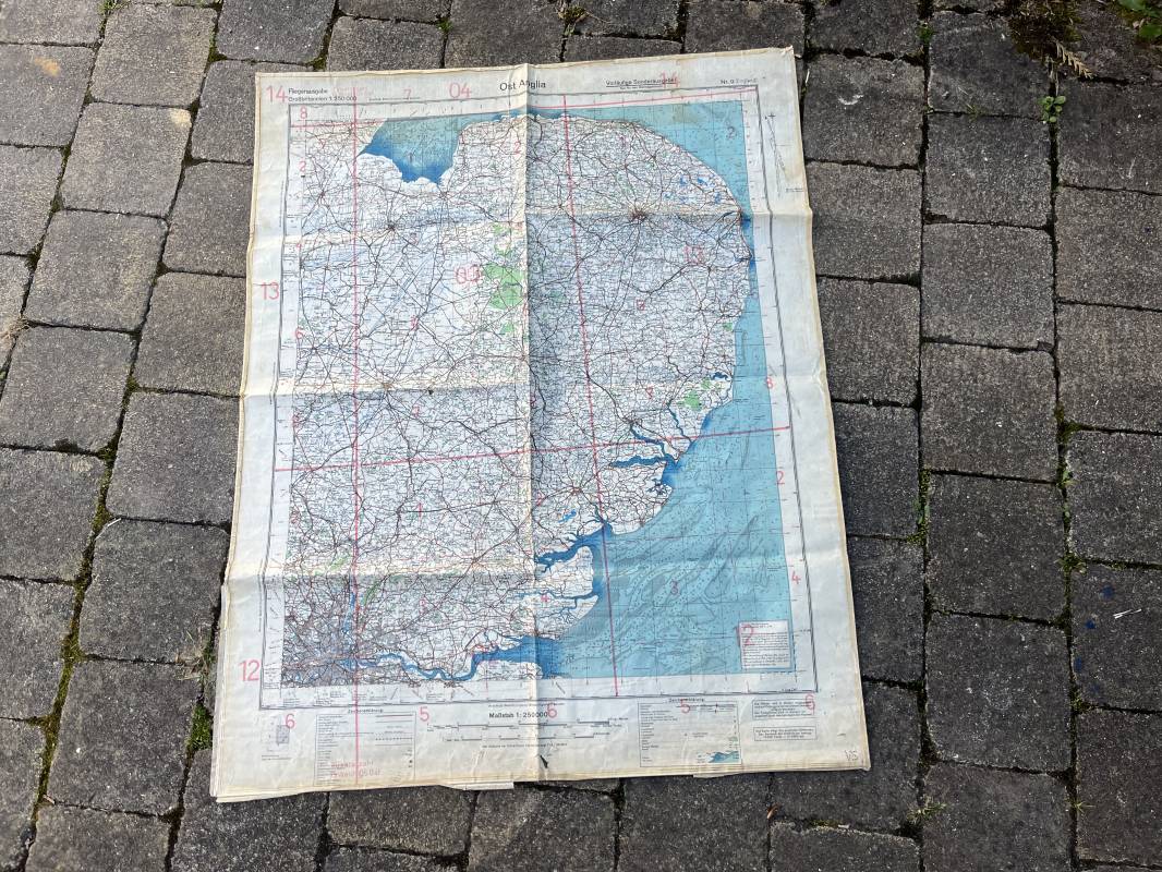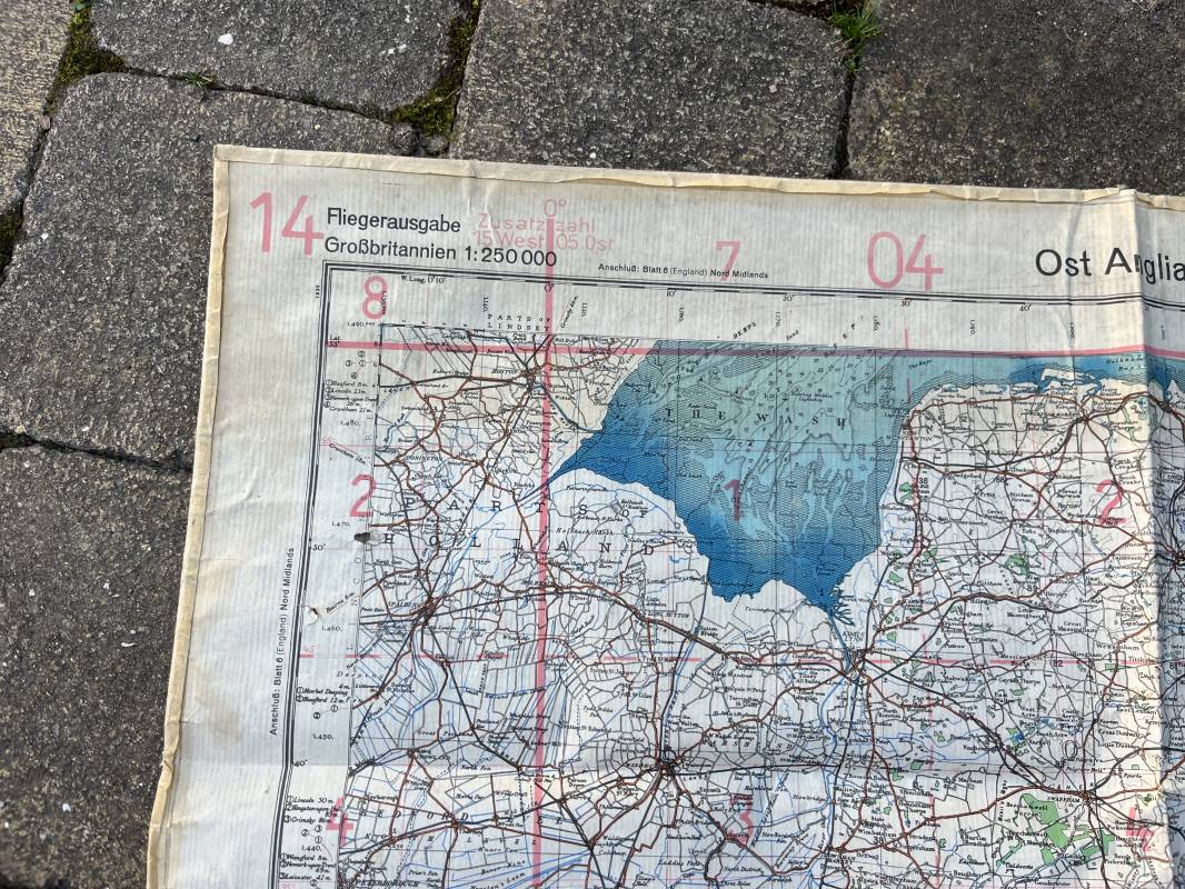 Rare carte de vol d'un navigant de la Luftwaffe . Carte en toile plastifiée dimensions 860X680 mm . Ost Anglia ' Angleterre EST . Secteur nord ouest de Londres . Beles couleurs . Utilisé en bel état . Ref 19023