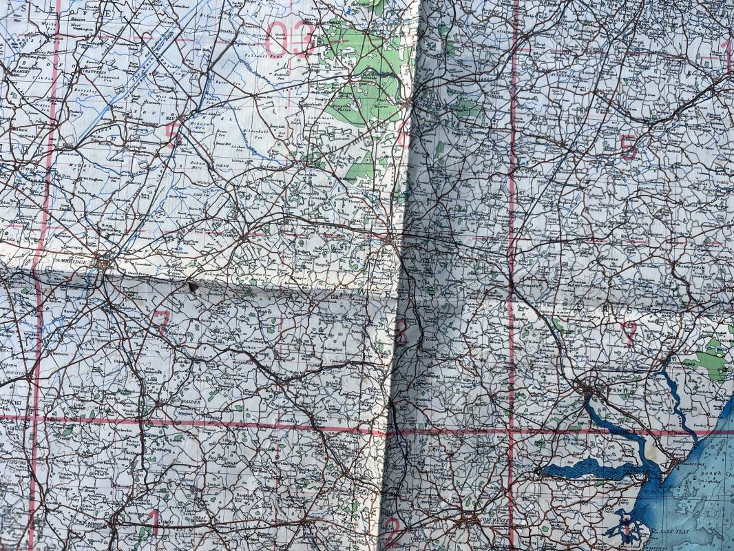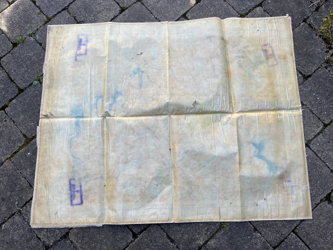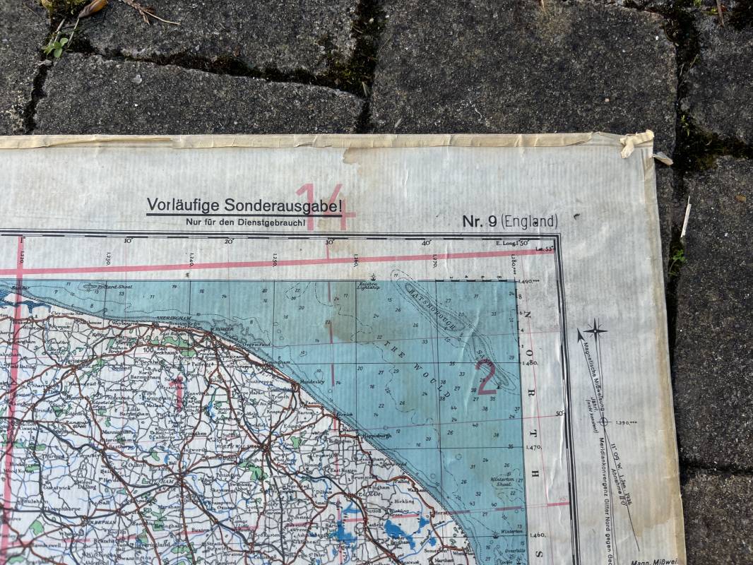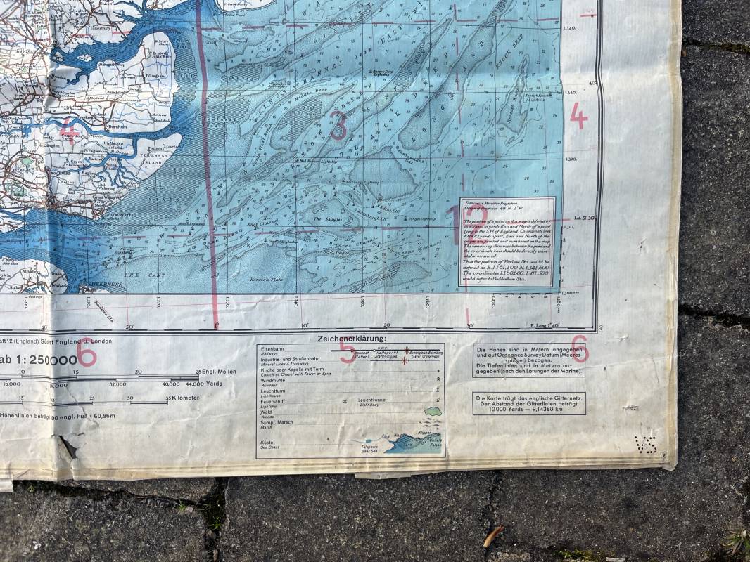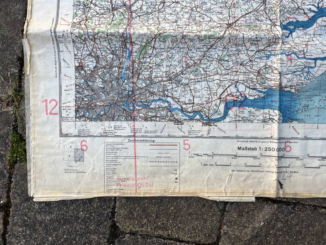 Rare carte de vol d'un navigant de la Luftwaffe . Carte en toile plastifiée dimensions 860X680 mm . Ost Anglia ' Angleterre EST . Secteur nord ouest de Londres . Beles couleurs . Utilisé en bel état . Ref 19023