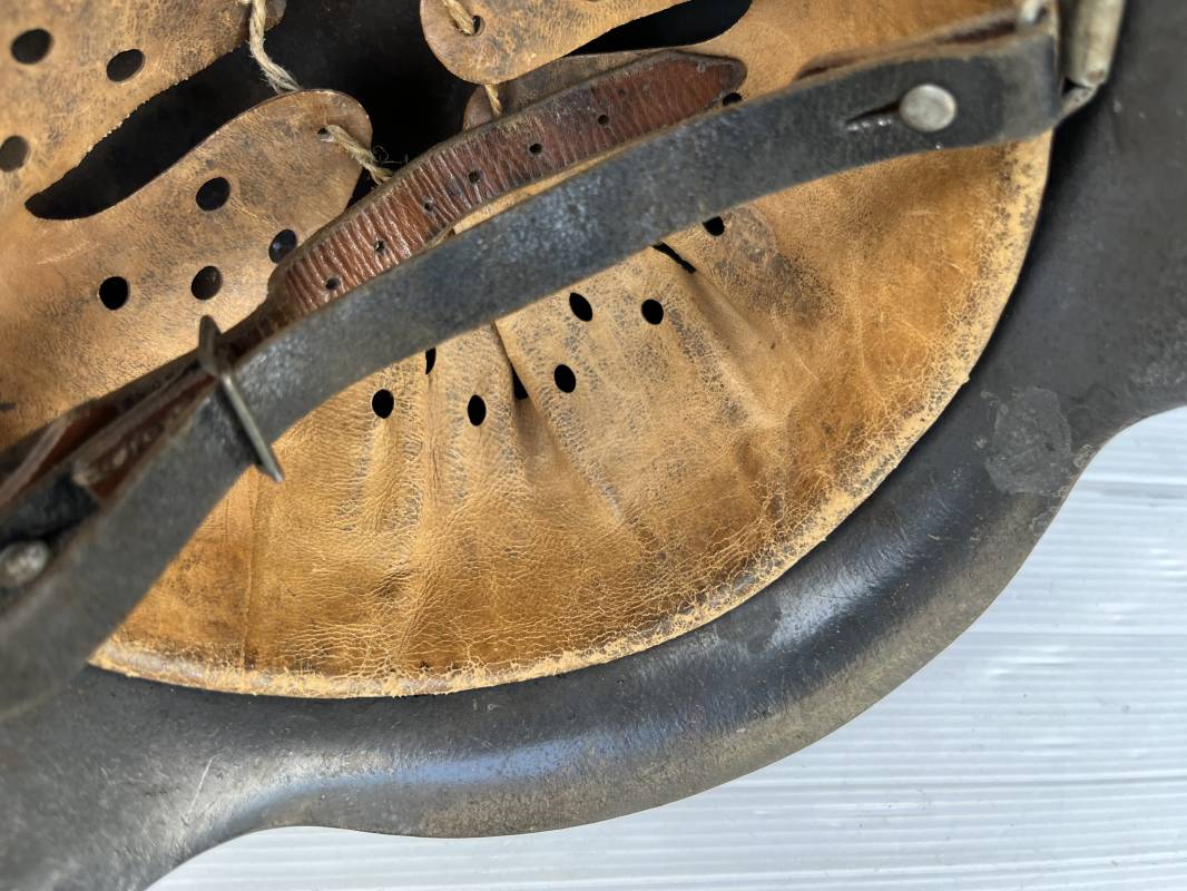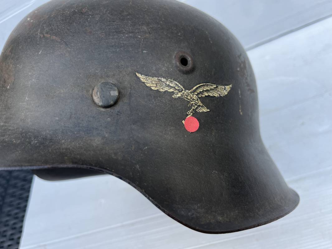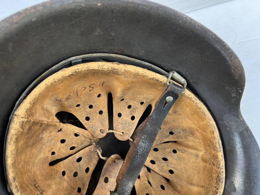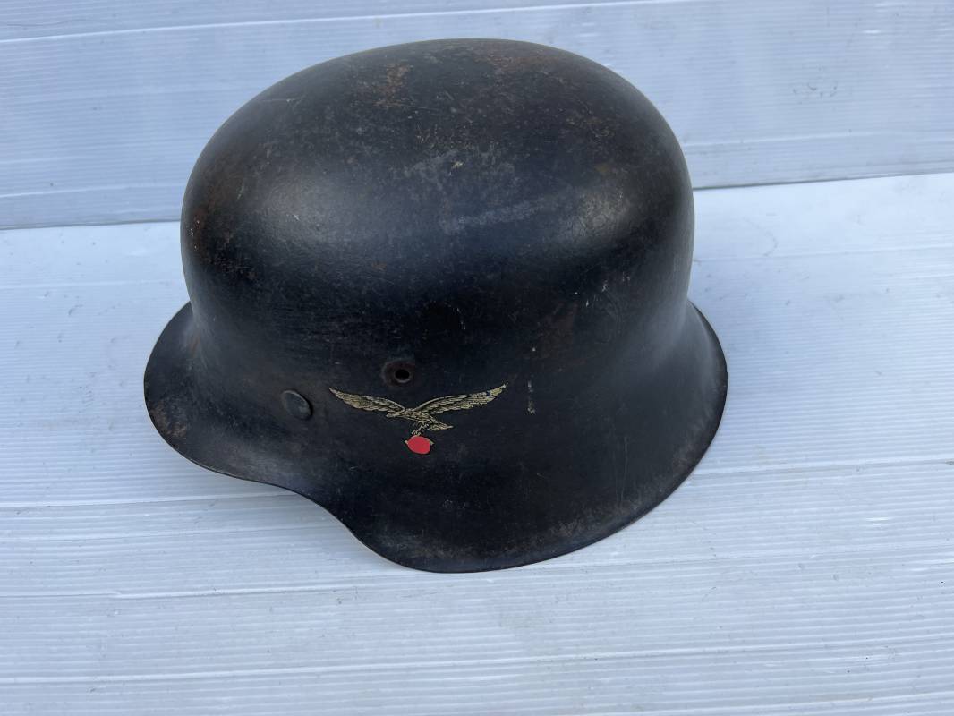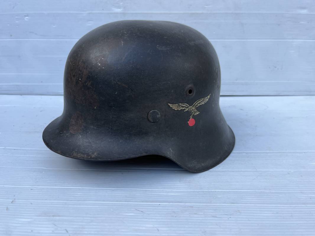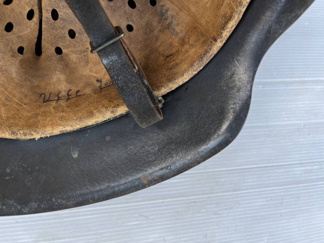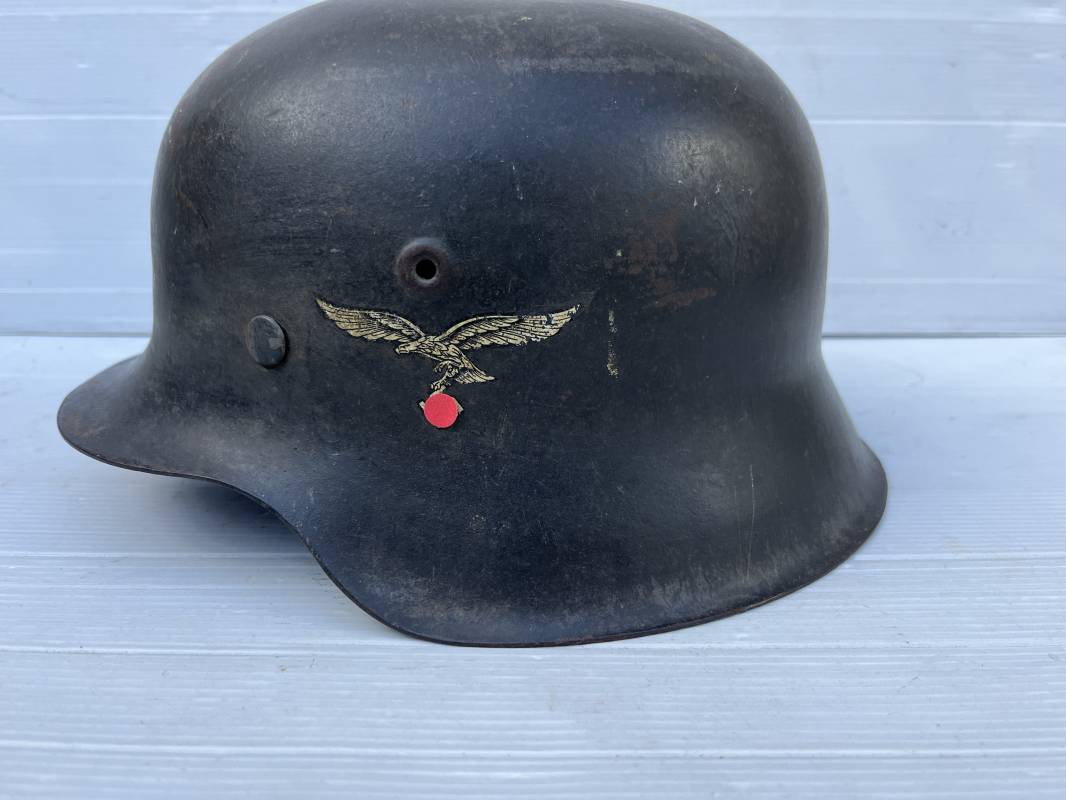 Trés beau casque modéle 1942 de la Luftwaffe . Casque avec insigne a 100 % . Belle peinture gris BLEU d'usinage . Marquage fabricant EF 66 Nuquière 1118 . Trés belle peinture non frottée . Casque non nettoyé ni démonté . Coiffe intérieure en cuir fauve non ciré , Nom du soldat manuscri dans la coiffe . Cuir souple . Lacet en coton d'origine . Taille 57 . Cerclage en zinc . Rivets fixés d'origine . Jugulaire en cuir noir retourné , boucle fer . Treize trous . Trés beau casque trouvé a Rouen ( 76 ) il y a 40 ans . Piéce définitive dans une collection . 1943/44 Ref 19826