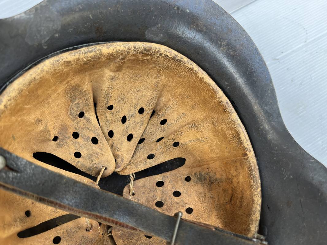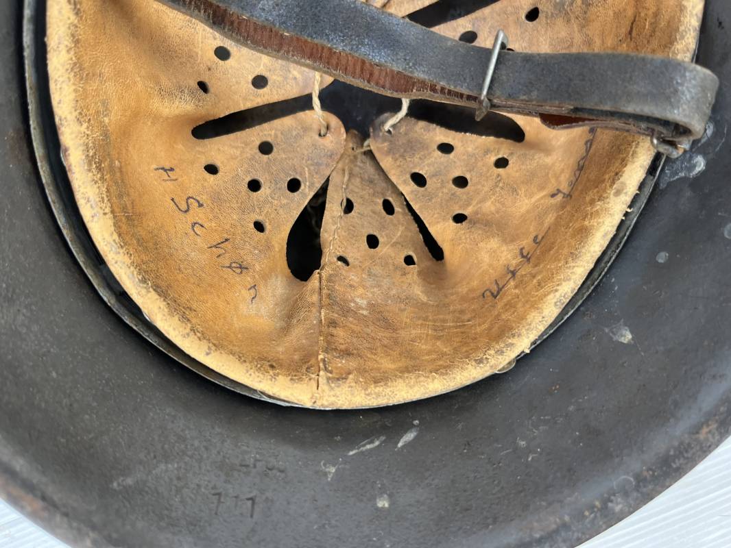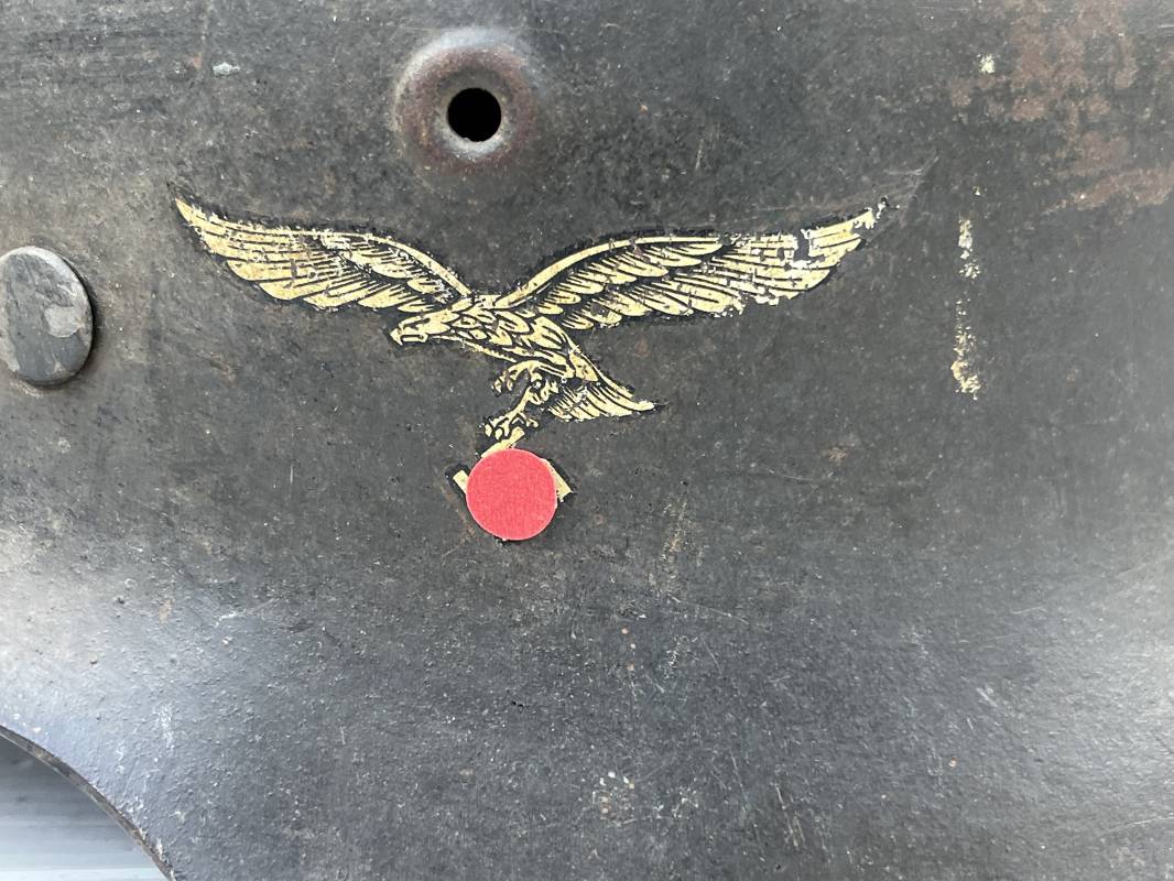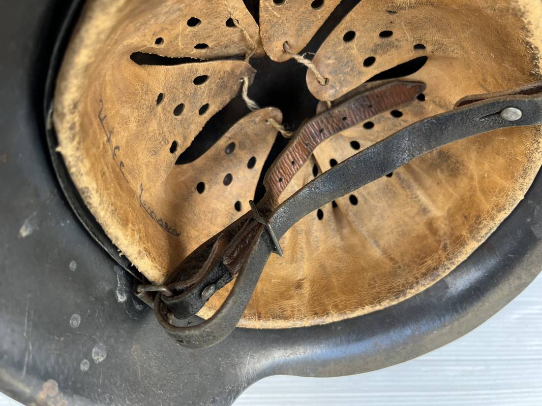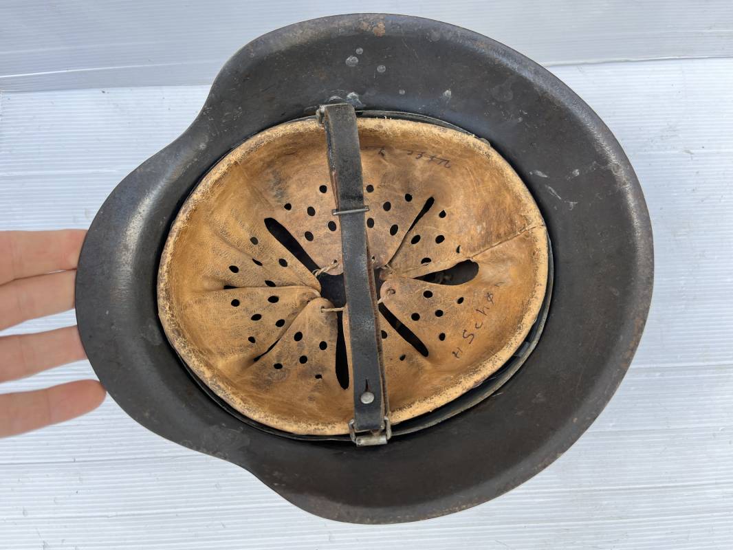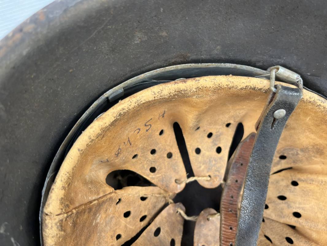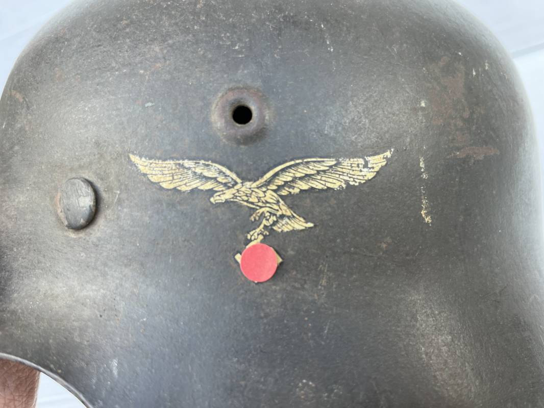 Trés beau casque modéle 1942 de la Luftwaffe . Casque avec insigne a 100 % . Belle peinture gris BLEU d'usinage . Marquage fabricant EF 66 Nuquière 1118 . Trés belle peinture non frottée . Casque non nettoyé ni démonté . Coiffe intérieure en cuir fauve non ciré , Nom du soldat manuscri dans la coiffe . Cuir souple . Lacet en coton d'origine . Taille 57 . Cerclage en zinc . Rivets fixés d'origine . Jugulaire en cuir noir retourné , boucle fer . Treize trous . Trés beau casque trouvé a Rouen ( 76 ) il y a 40 ans . Piéce définitive dans une collection . 1943/44 Ref 19826