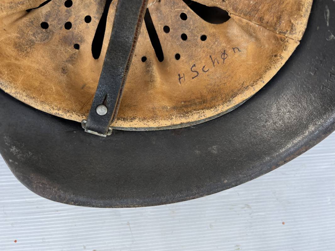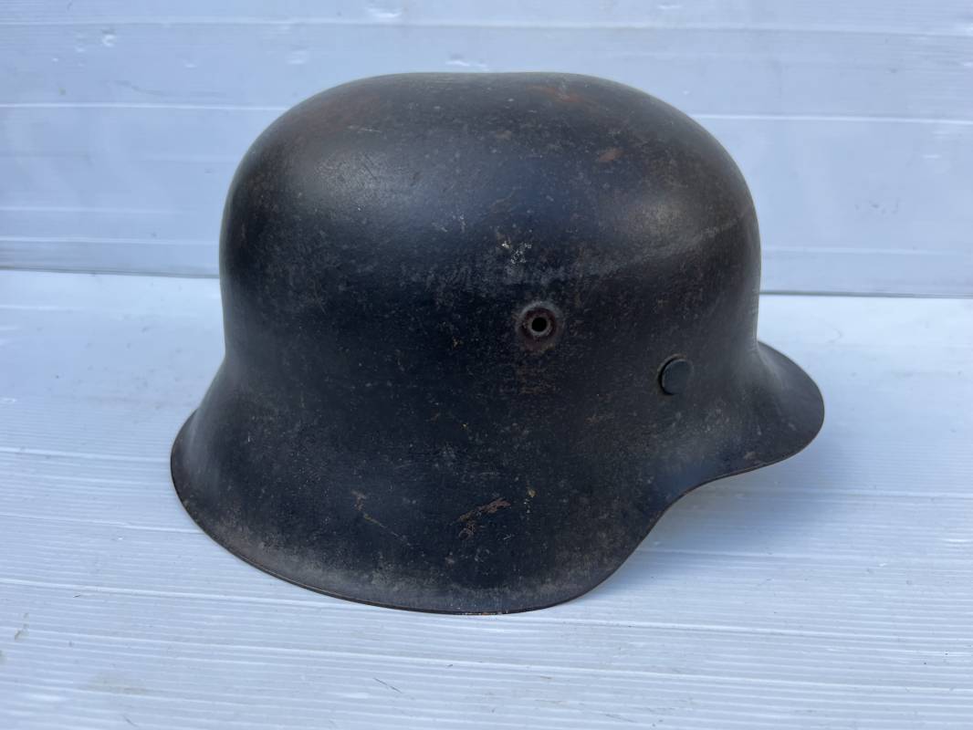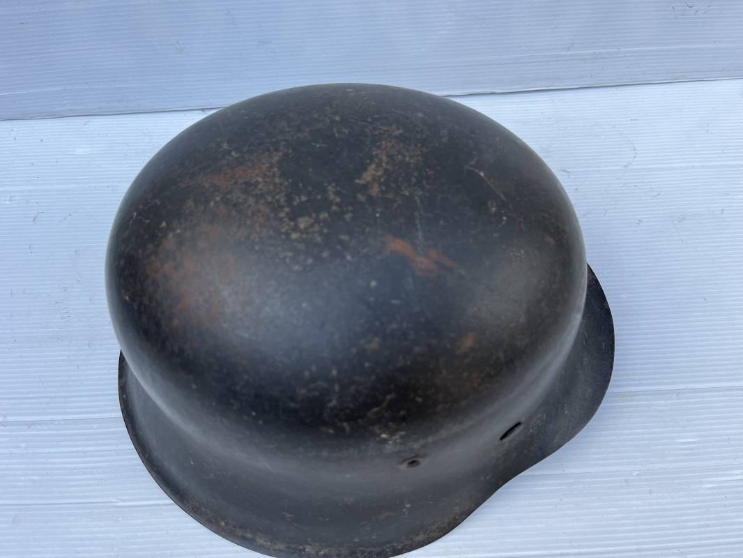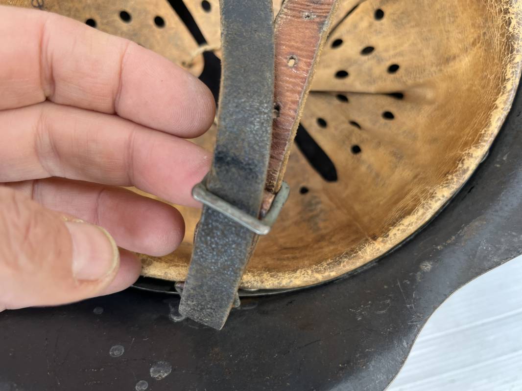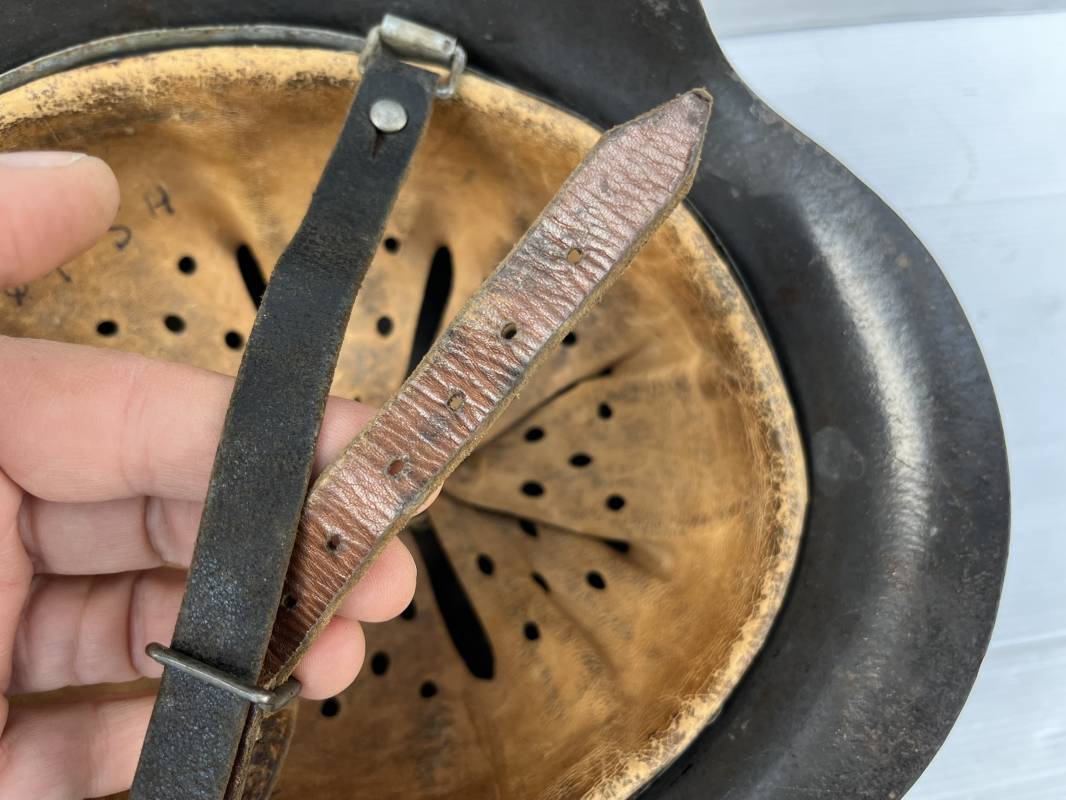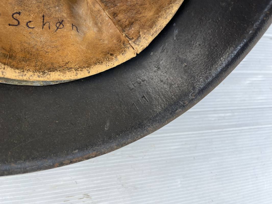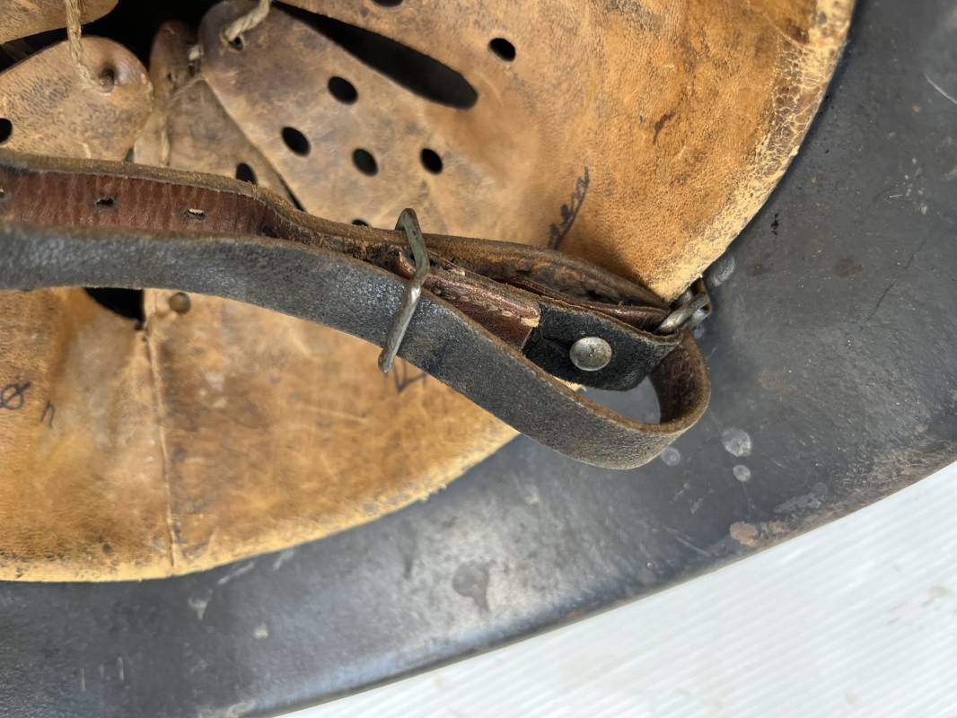 Trés beau casque modéle 1942 de la Luftwaffe . Casque avec insigne a 100 % . Belle peinture gris BLEU d'usinage . Marquage fabricant EF 66 Nuquière 1118 . Trés belle peinture non frottée . Casque non nettoyé ni démonté . Coiffe intérieure en cuir fauve non ciré , Nom du soldat manuscri dans la coiffe . Cuir souple . Lacet en coton d'origine . Taille 57 . Cerclage en zinc . Rivets fixés d'origine . Jugulaire en cuir noir retourné , boucle fer . Treize trous . Trés beau casque trouvé a Rouen ( 76 ) il y a 40 ans . Piéce définitive dans une collection . 1943/44 Ref 19826