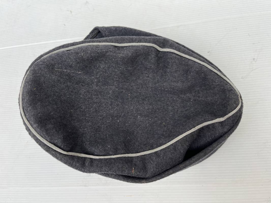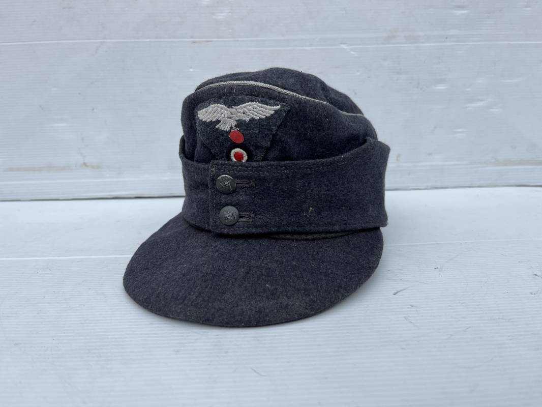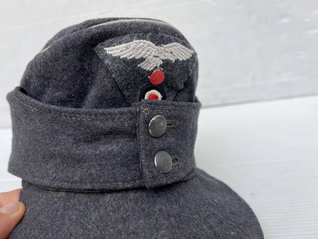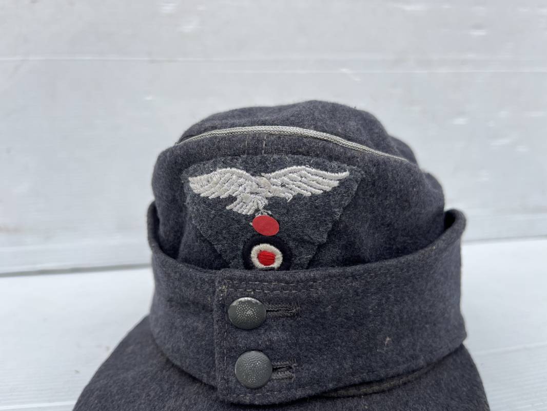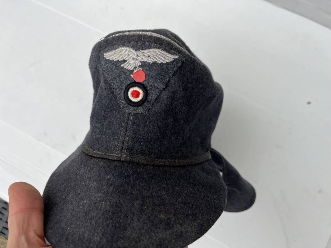 rés belle casquette modéle 1943 d'un officier de la Luftwaffe . Casquette en drap gris bleu . Visière tissu . Deux petits boutons grenelés peint en gris bleu sur le devant . Rabats en tissu avec renfort sur le devant . Liseré argent toute arme pour officier . Aigle et cocarde trapézoidal modéle 1943 du modéle général bordé coton . Intérieur doublé en satinette gris bleu . Demi lune en cuir gris sur le devant . Taille 57 . Tamon encre blanc Casquette légérement portée en parfait état 1943/45 . Belle coiffure peu courante Ref 21548