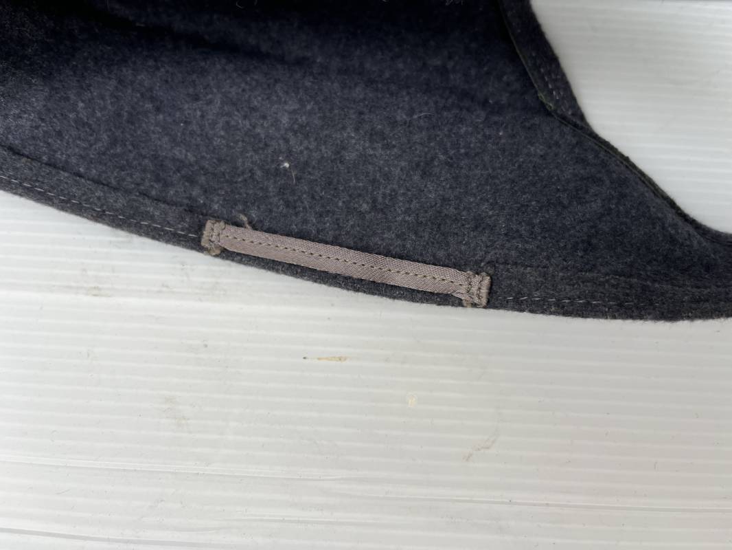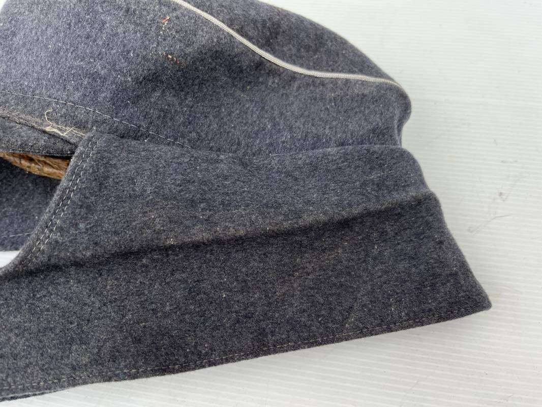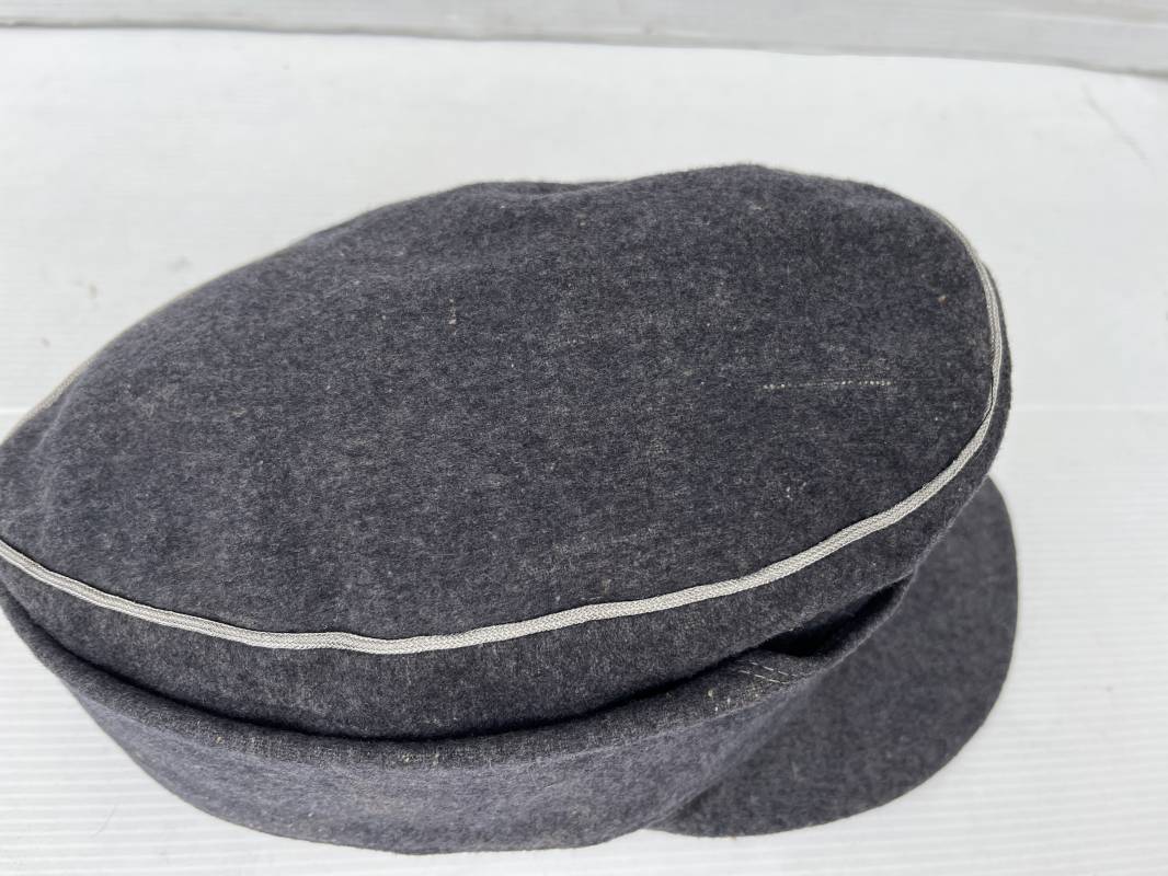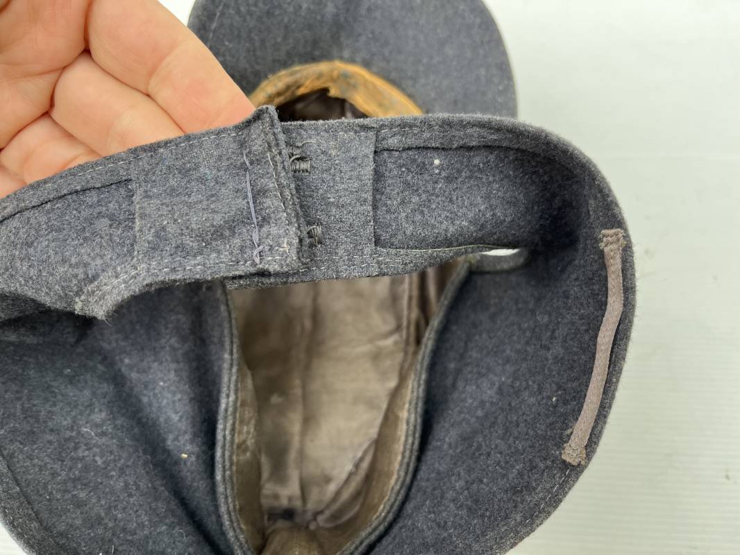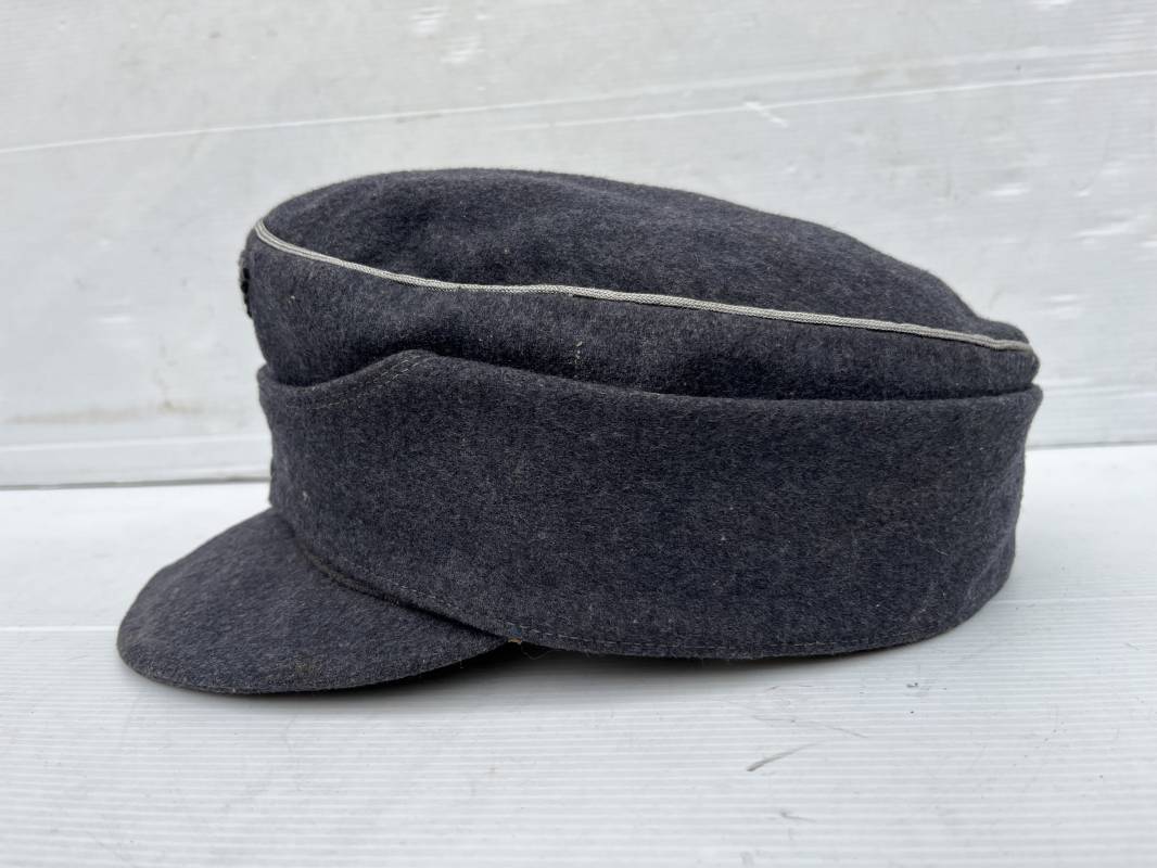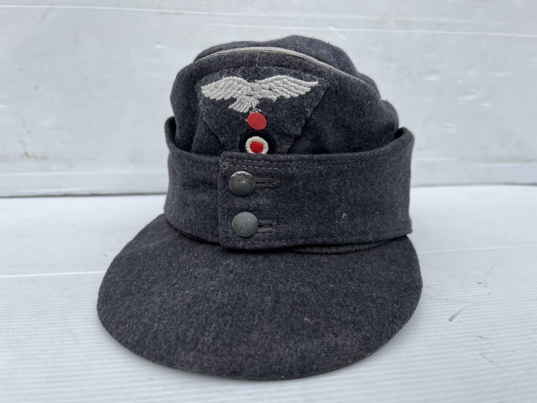 rés belle casquette modéle 1943 d'un officier de la Luftwaffe . Casquette en drap gris bleu . Visière tissu . Deux petits boutons grenelés peint en gris bleu sur le devant . Rabats en tissu avec renfort sur le devant . Liseré argent toute arme pour officier . Aigle et cocarde trapézoidal modéle 1943 du modéle général bordé coton . Intérieur doublé en satinette gris bleu . Demi lune en cuir gris sur le devant . Taille 57 . Tamon encre blanc Casquette légérement portée en parfait état 1943/45 . Belle coiffure peu courante Ref 21548