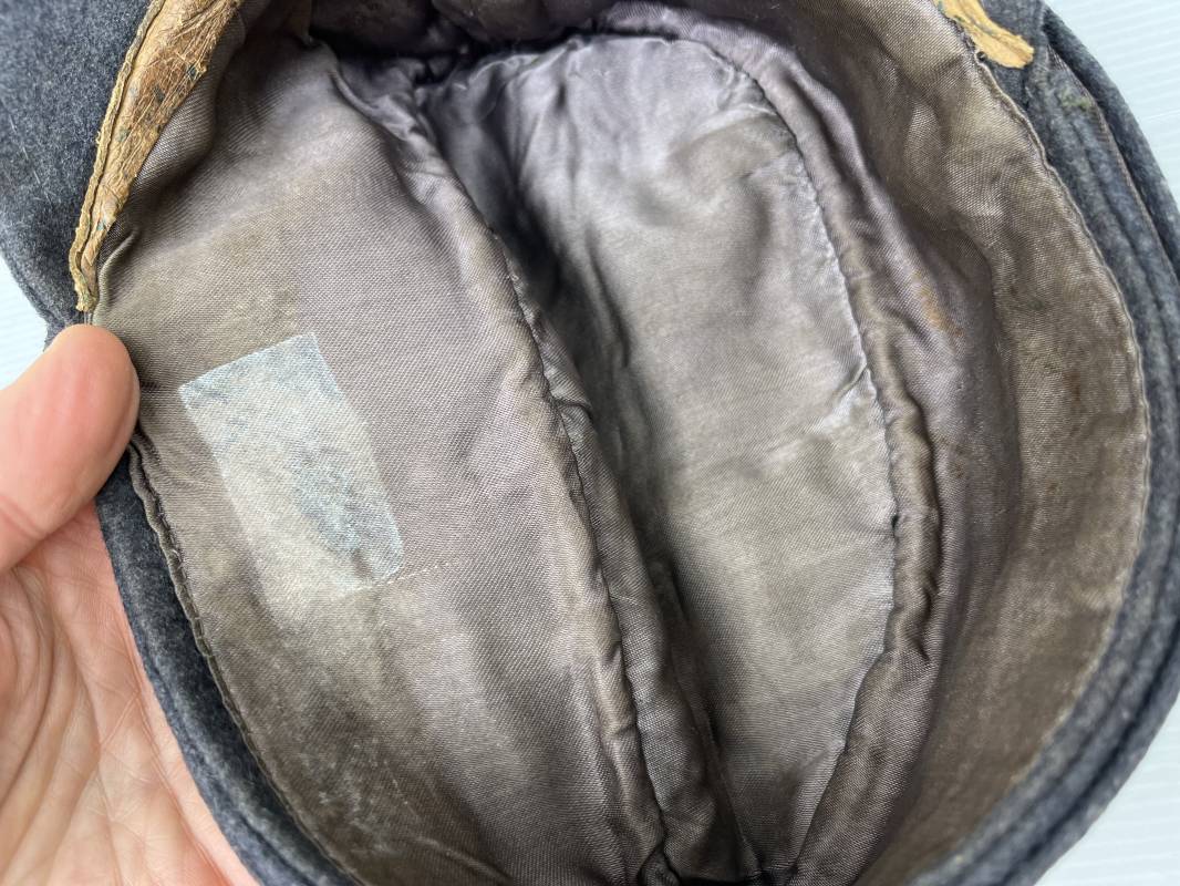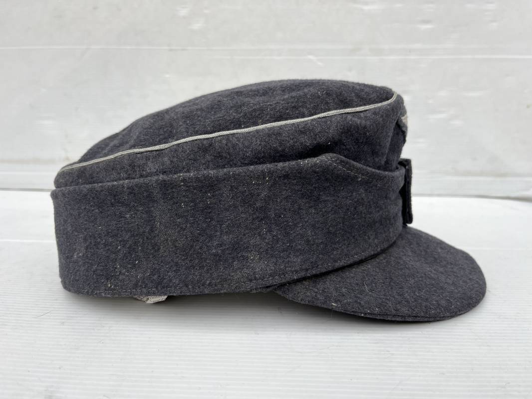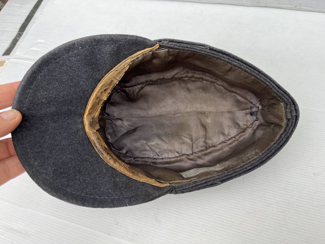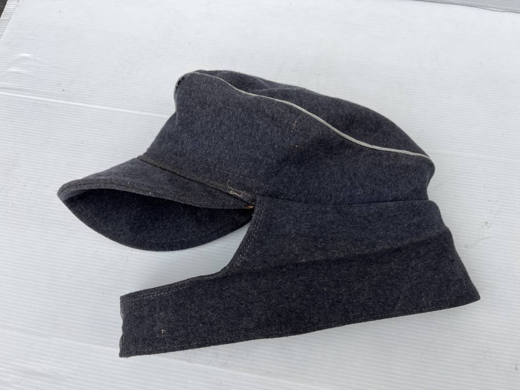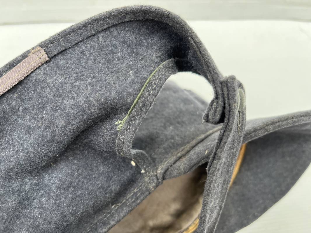 rés belle casquette modéle 1943 d'un officier de la Luftwaffe . Casquette en drap gris bleu . Visière tissu . Deux petits boutons grenelés peint en gris bleu sur le devant . Rabats en tissu avec renfort sur le devant . Liseré argent toute arme pour officier . Aigle et cocarde trapézoidal modéle 1943 du modéle général bordé coton . Intérieur doublé en satinette gris bleu . Demi lune en cuir gris sur le devant . Taille 57 . Tamon encre blanc Casquette légérement portée en parfait état 1943/45 . Belle coiffure peu courante Ref 21548