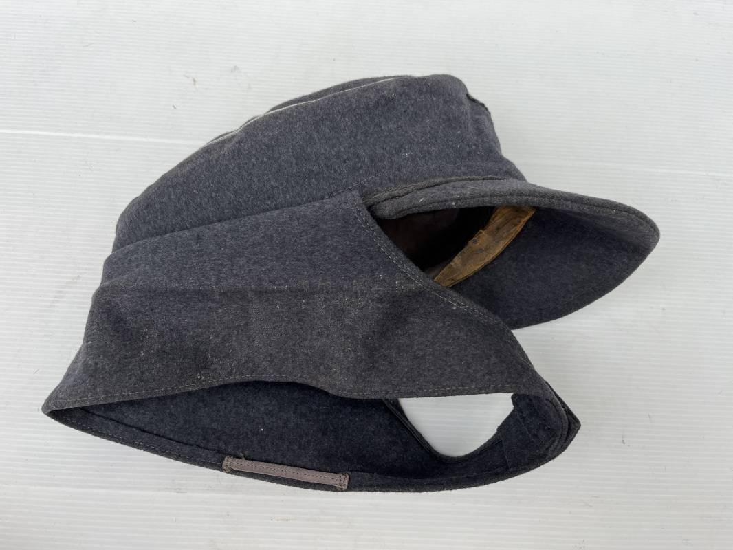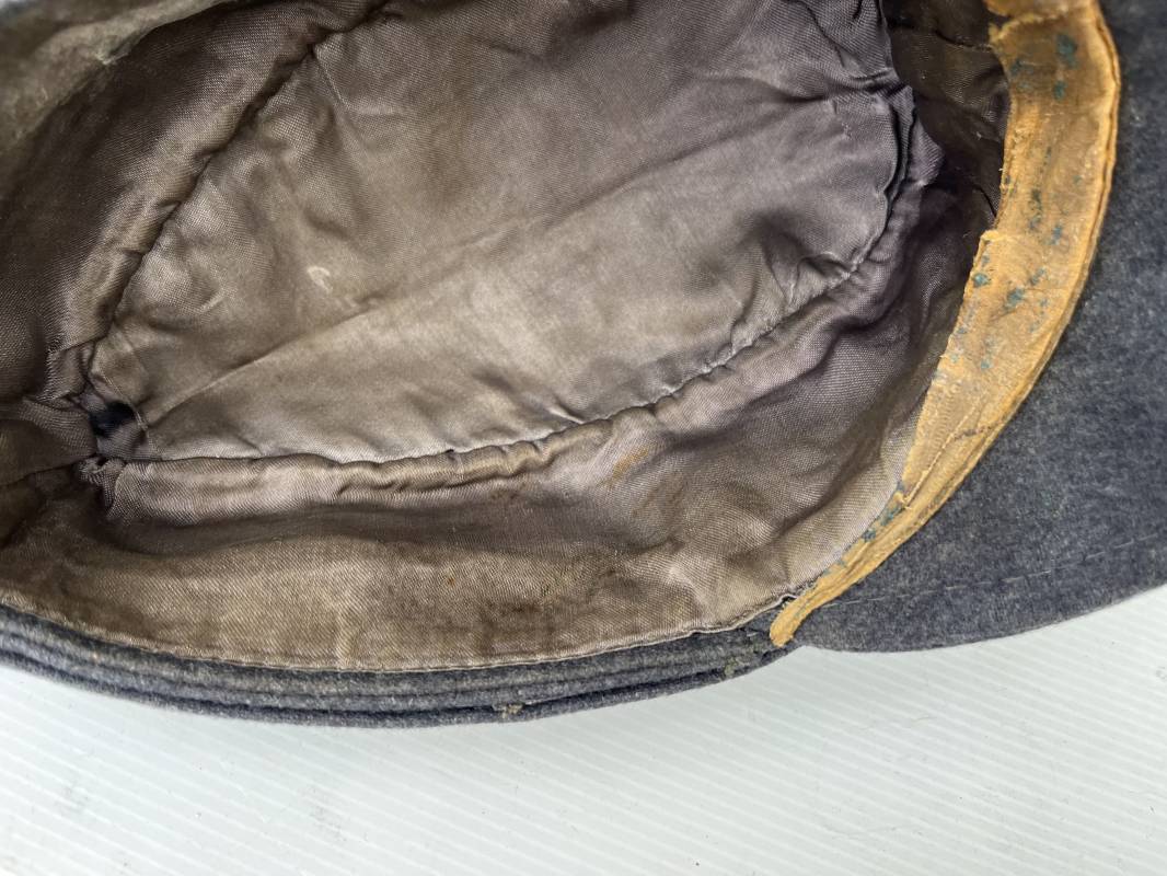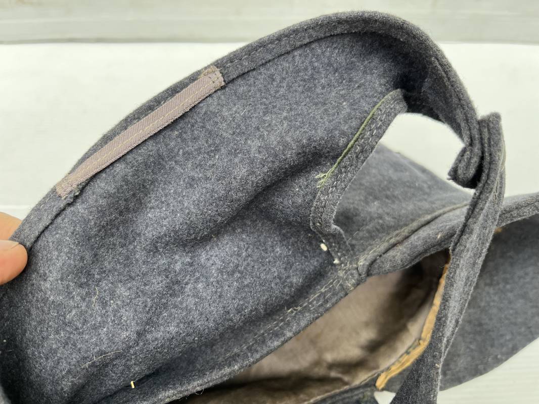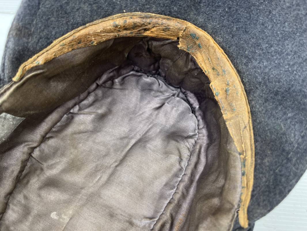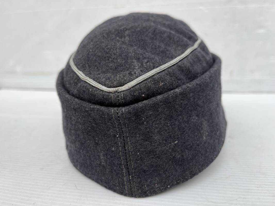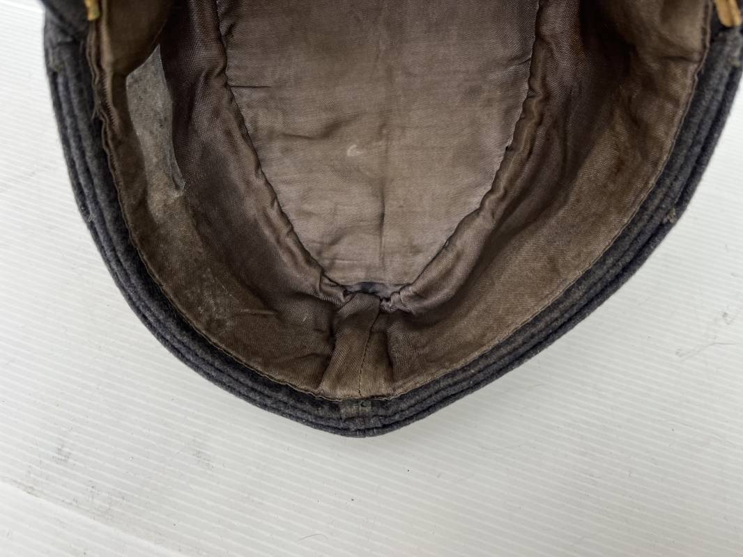 rés belle casquette modéle 1943 d'un officier de la Luftwaffe . Casquette en drap gris bleu . Visière tissu . Deux petits boutons grenelés peint en gris bleu sur le devant . Rabats en tissu avec renfort sur le devant . Liseré argent toute arme pour officier . Aigle et cocarde trapézoidal modéle 1943 du modéle général bordé coton . Intérieur doublé en satinette gris bleu . Demi lune en cuir gris sur le devant . Taille 57 . Tamon encre blanc Casquette légérement portée en parfait état 1943/45 . Belle coiffure peu courante Ref 21548
