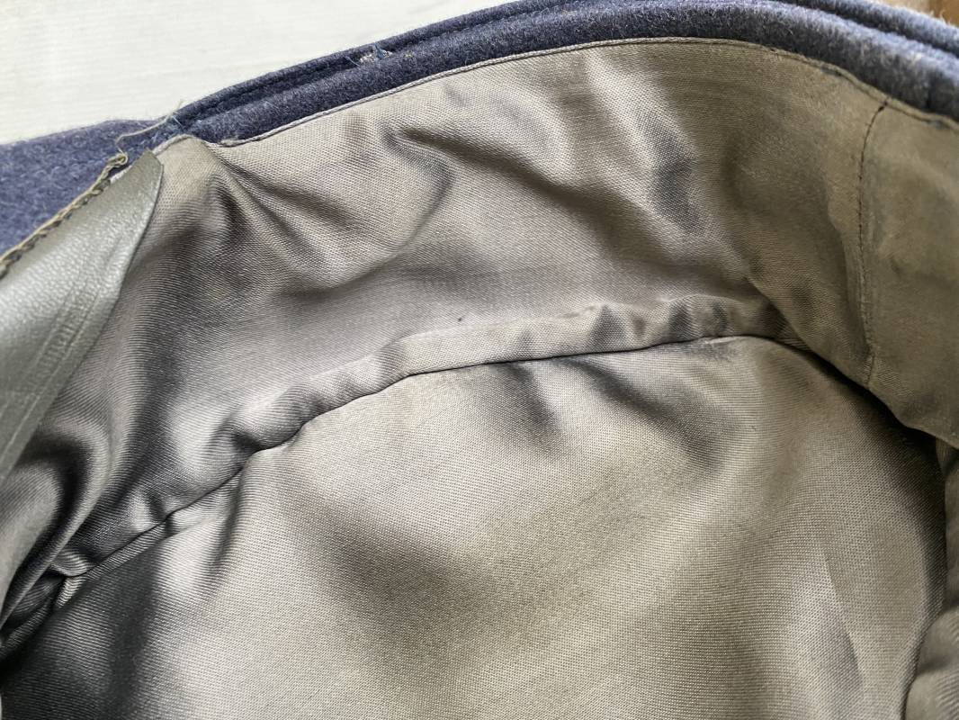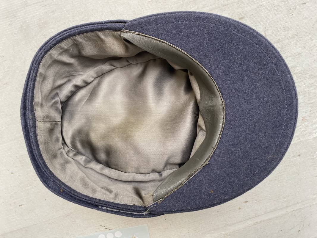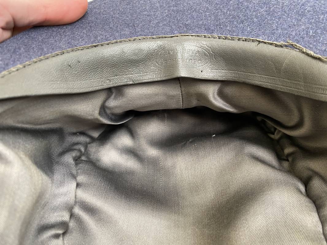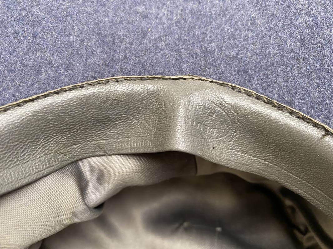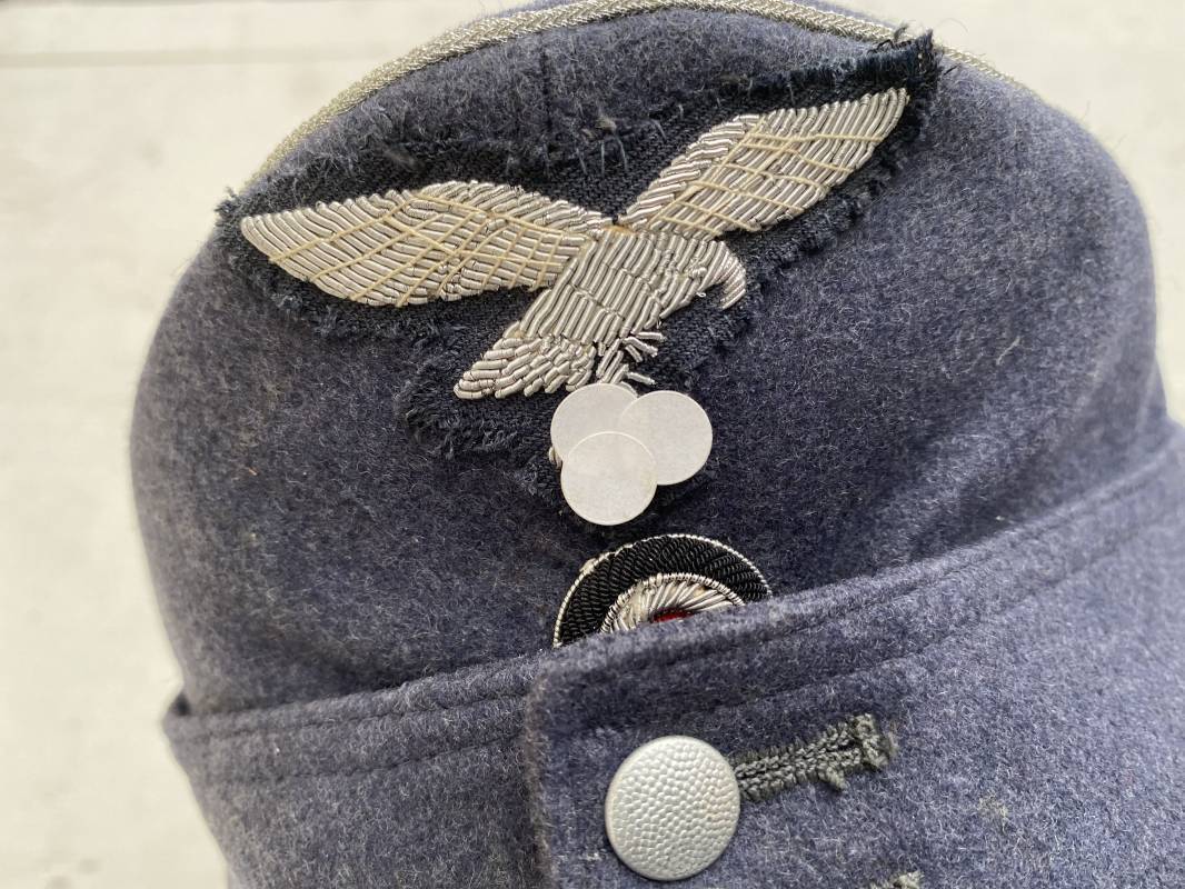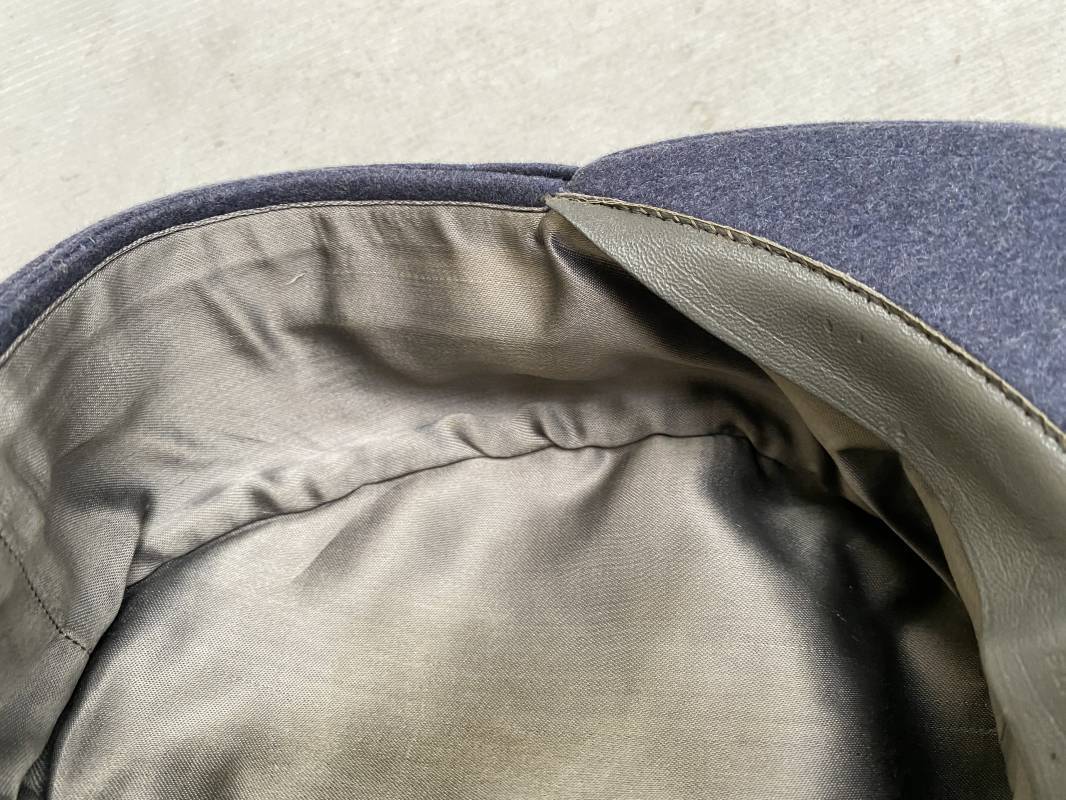 Trés belle casquette modéle 1943 d'un officier de la Luftwaffe . Casquette en drap fin gris bleu . Visière tissu . Deux petits boutons grenelés sur le devant . Rabats en tissu avec renfort sur le devant . Liseré argent toute arme pour officier . Aigle et cocarde brodés cannetille argent . Belle forme haute . Intérieur doublé en satinette gris bleu . Demi lune en cuir gris sur le devant Marquage et logo Deutsche Qualitat . Taille 57 . Casquette légérement portée en parfait état 1943/45 . Belle coiffure peu courante Ref 12241