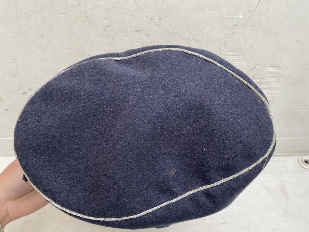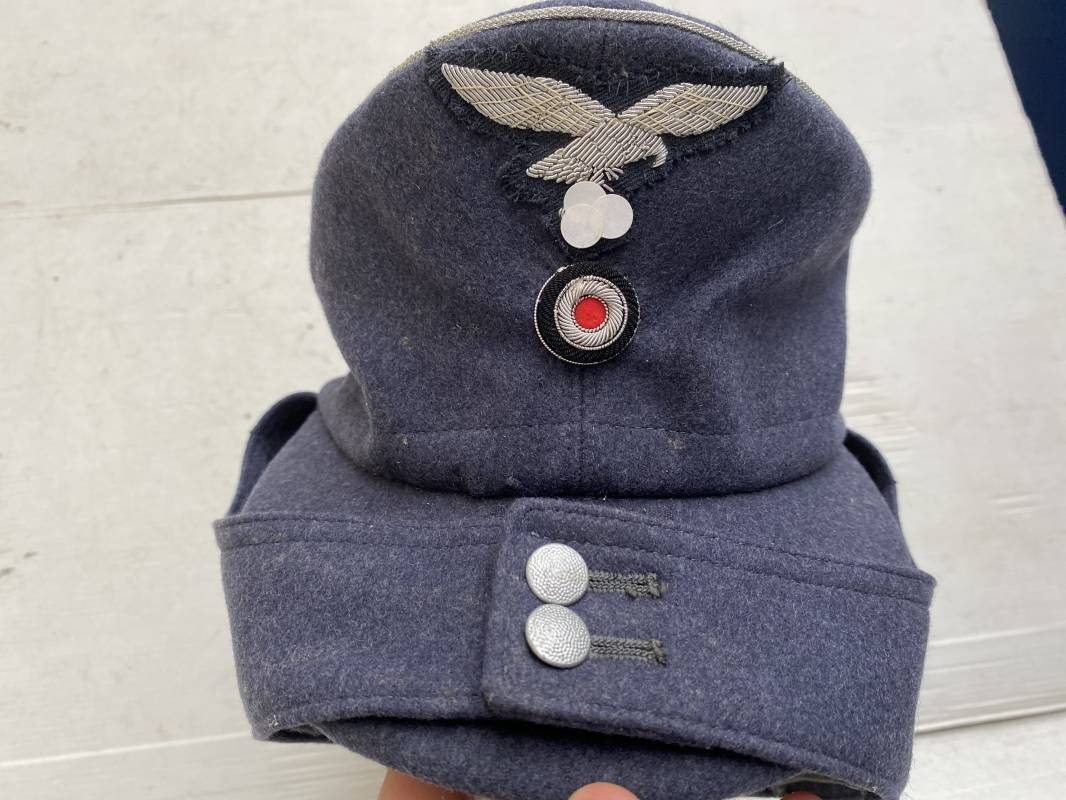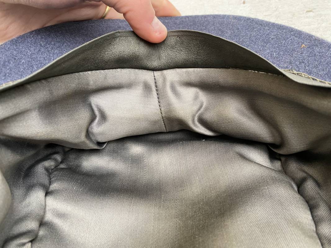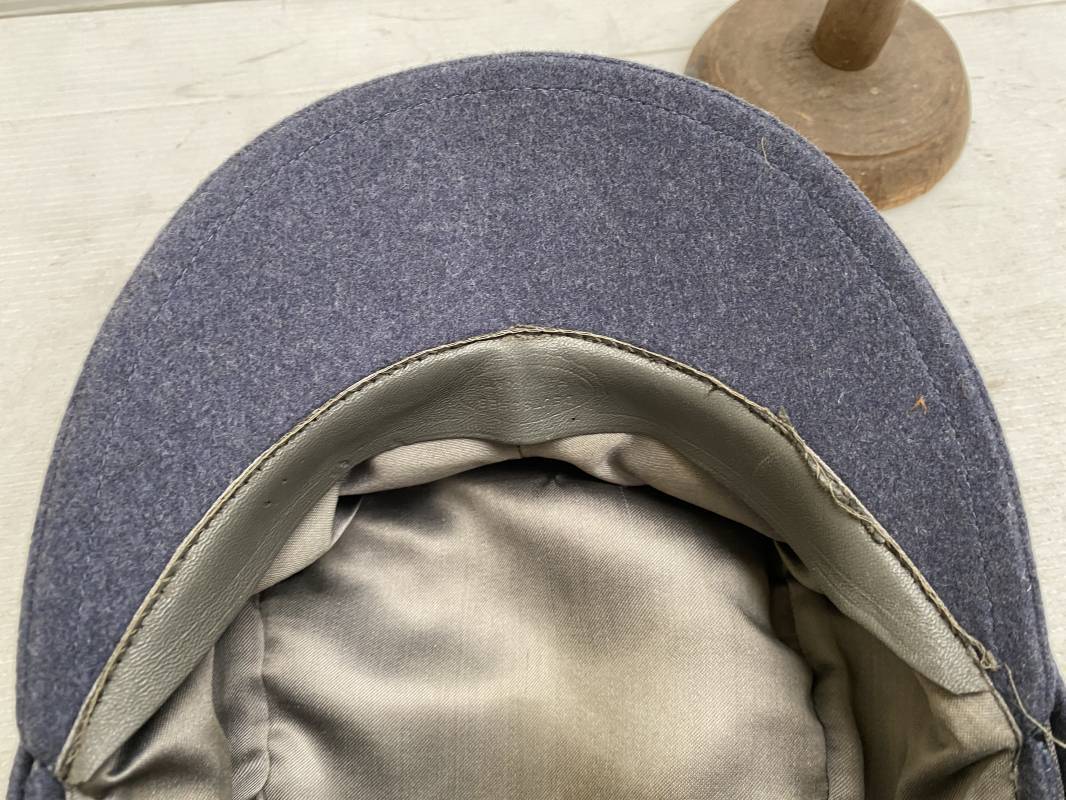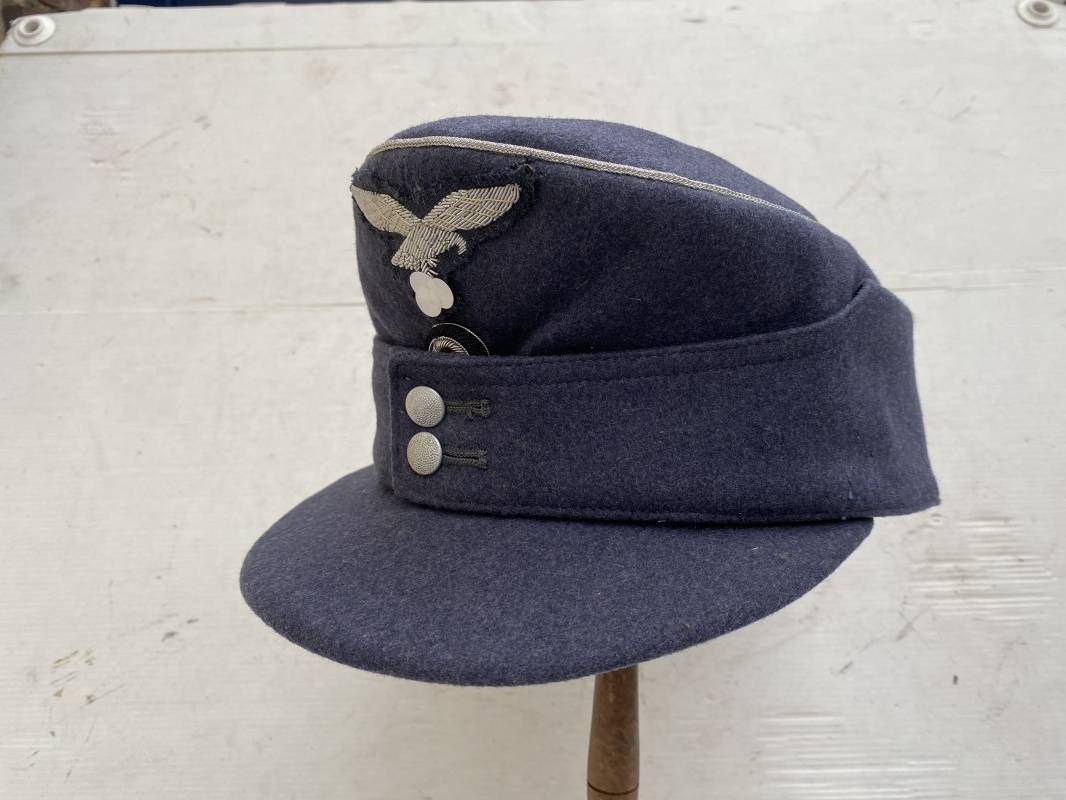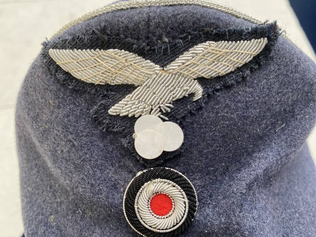 Trés belle casquette modéle 1943 d'un officier de la Luftwaffe . Casquette en drap fin gris bleu . Visière tissu . Deux petits boutons grenelés sur le devant . Rabats en tissu avec renfort sur le devant . Liseré argent toute arme pour officier . Aigle et cocarde brodés cannetille argent . Belle forme haute . Intérieur doublé en satinette gris bleu . Demi lune en cuir gris sur le devant Marquage et logo Deutsche Qualitat . Taille 57 . Casquette légérement portée en parfait état 1943/45 . Belle coiffure peu courante Ref 12241
