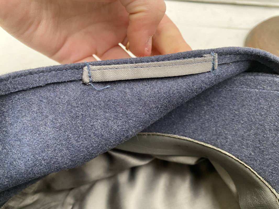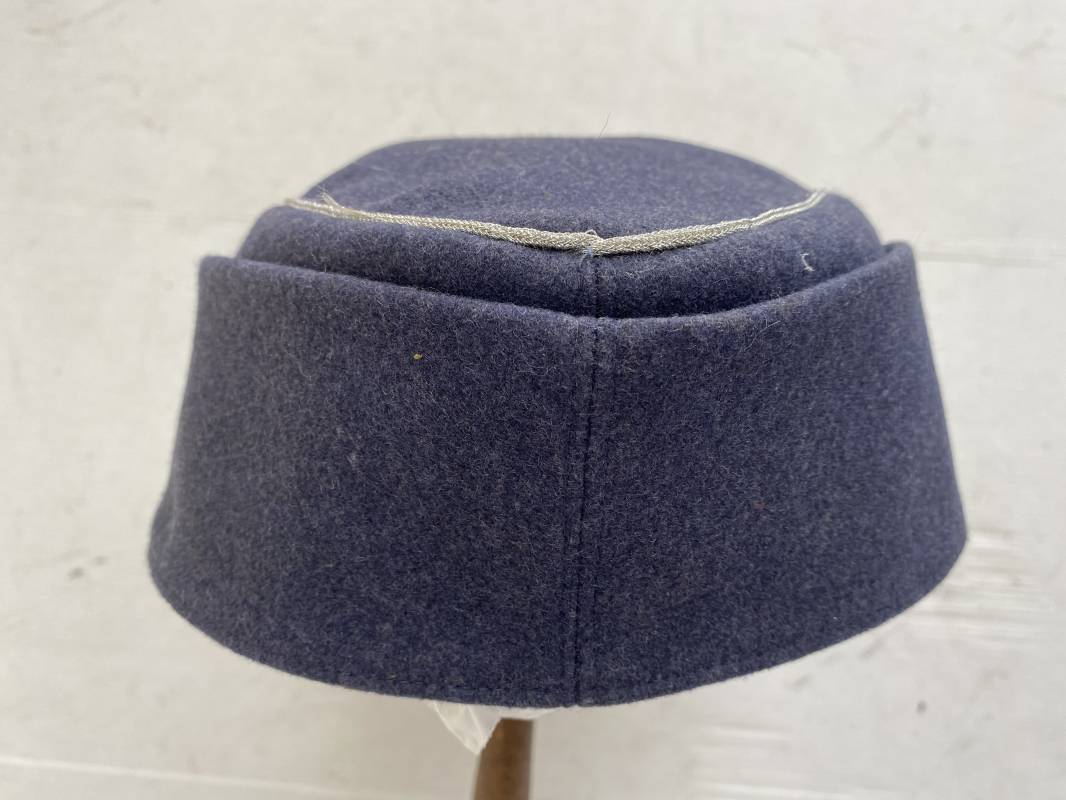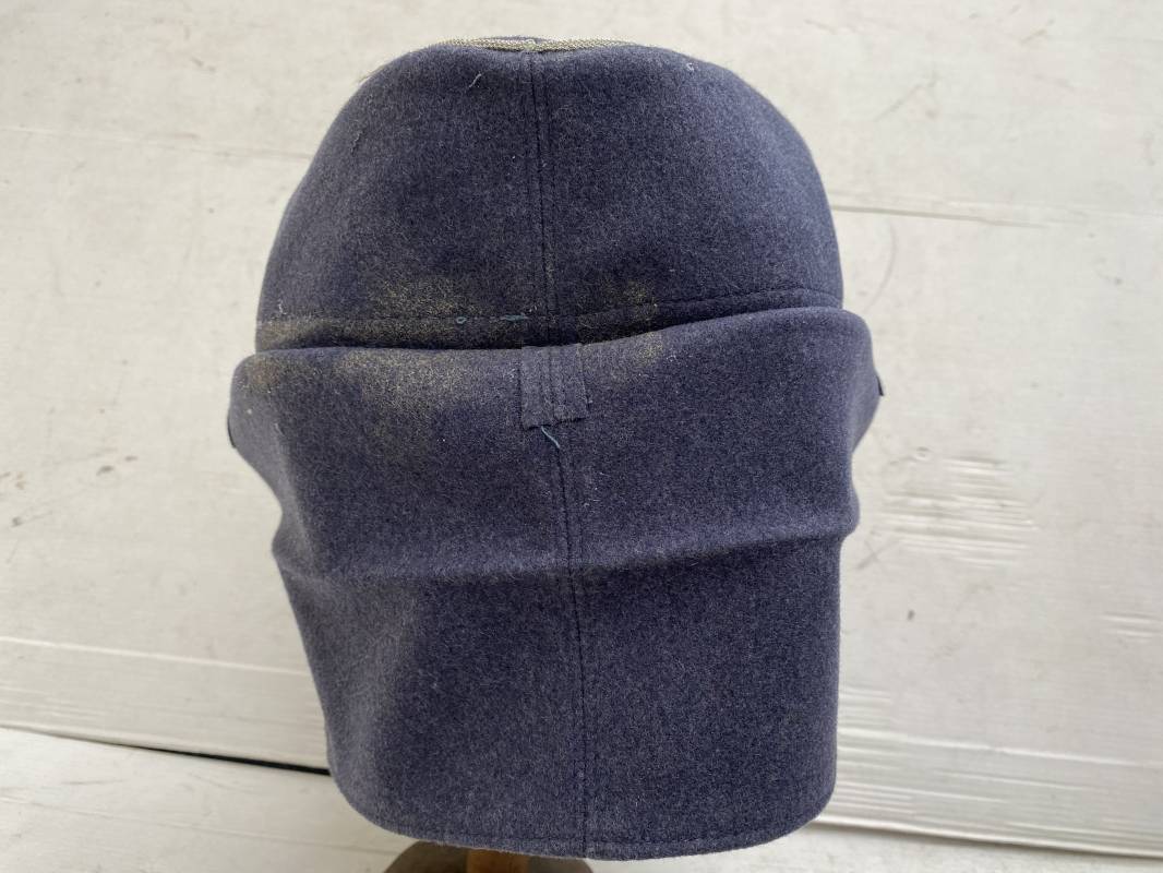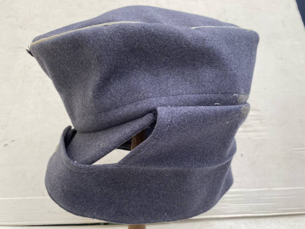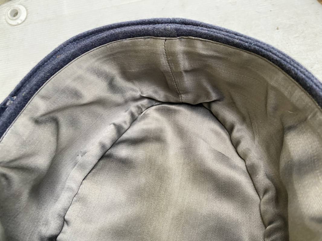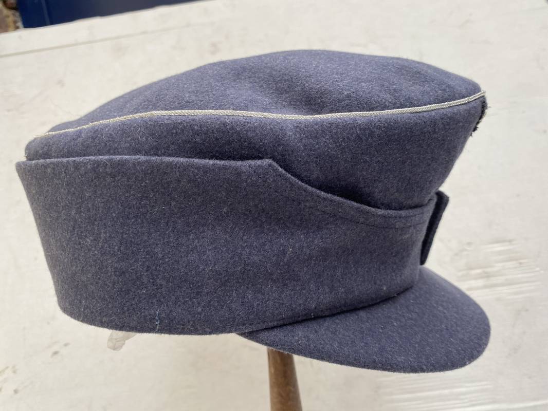 Trés belle casquette modéle 1943 d'un officier de la Luftwaffe . Casquette en drap fin gris bleu . Visière tissu . Deux petits boutons grenelés sur le devant . Rabats en tissu avec renfort sur le devant . Liseré argent toute arme pour officier . Aigle et cocarde brodés cannetille argent . Belle forme haute . Intérieur doublé en satinette gris bleu . Demi lune en cuir gris sur le devant Marquage et logo Deutsche Qualitat . Taille 57 . Casquette légérement portée en parfait état 1943/45 . Belle coiffure peu courante Ref 12241