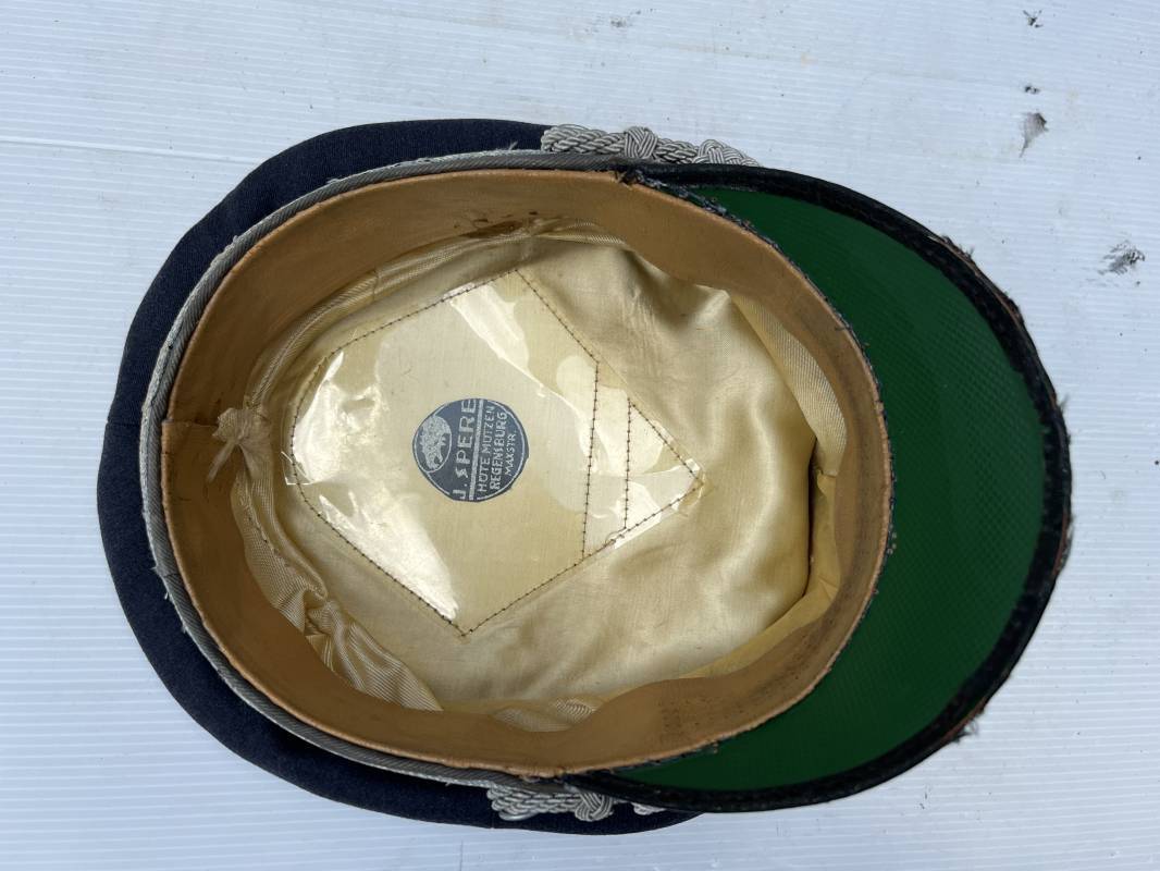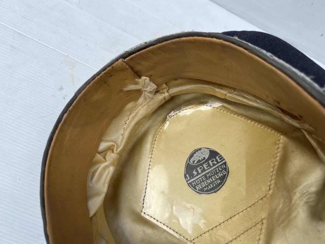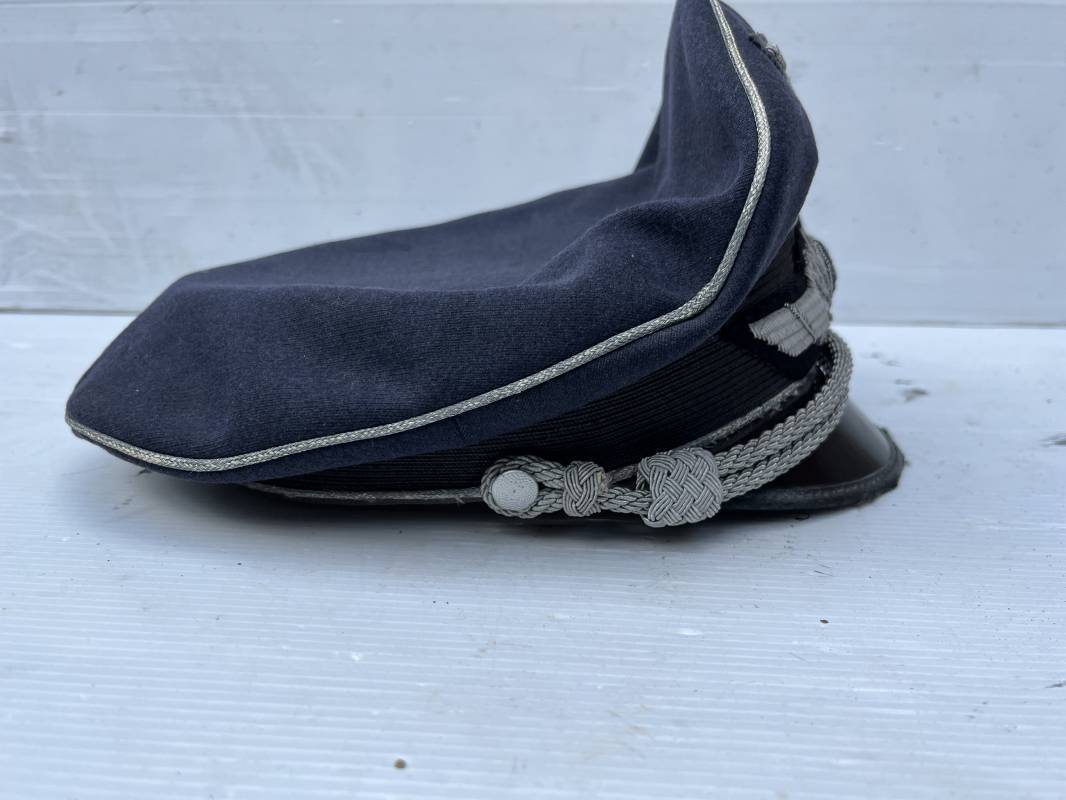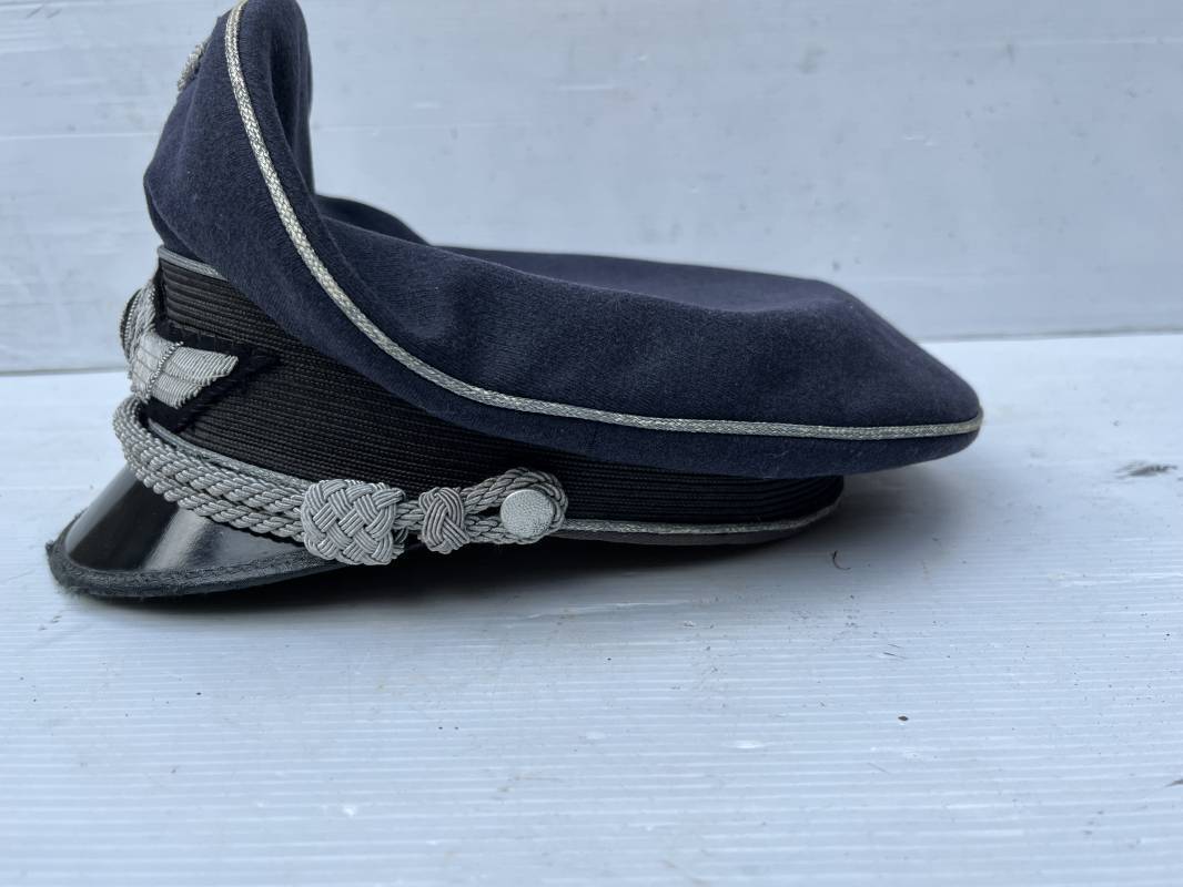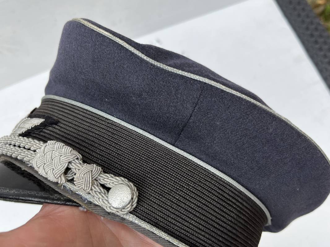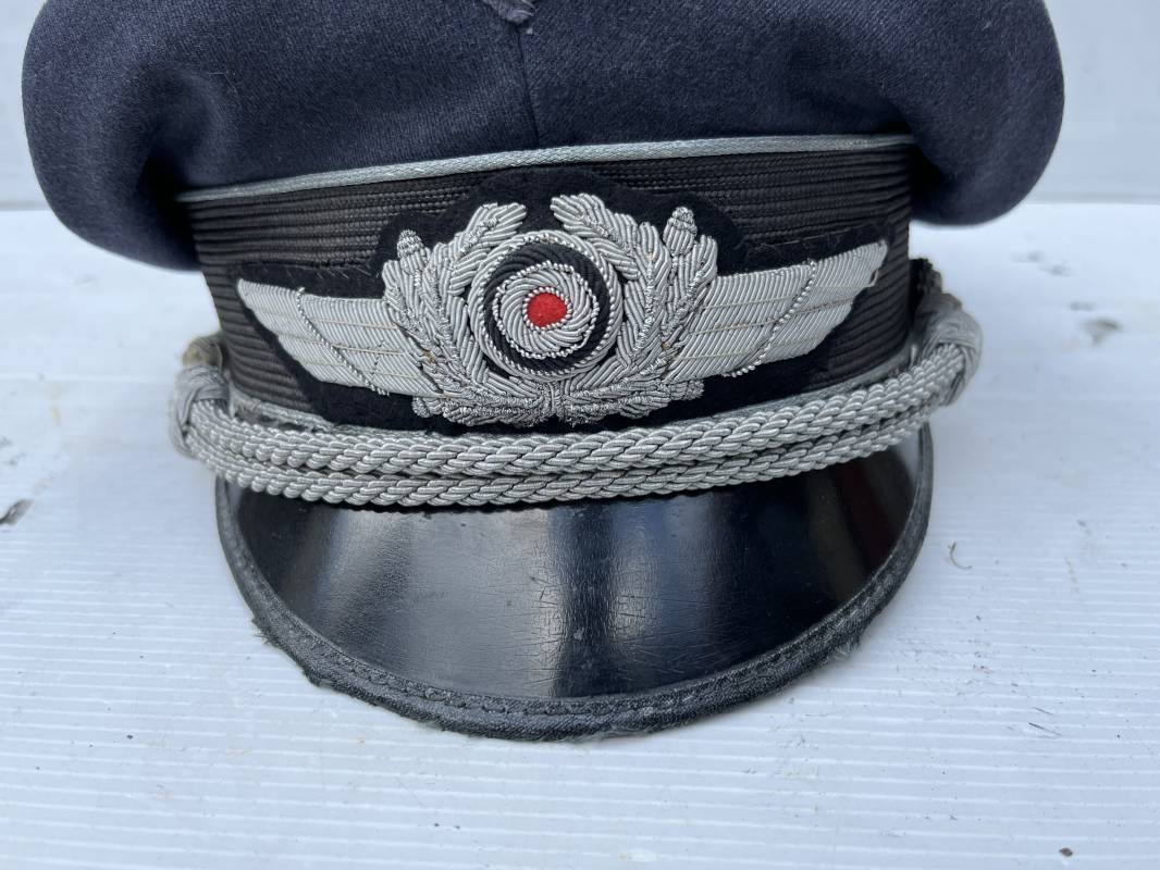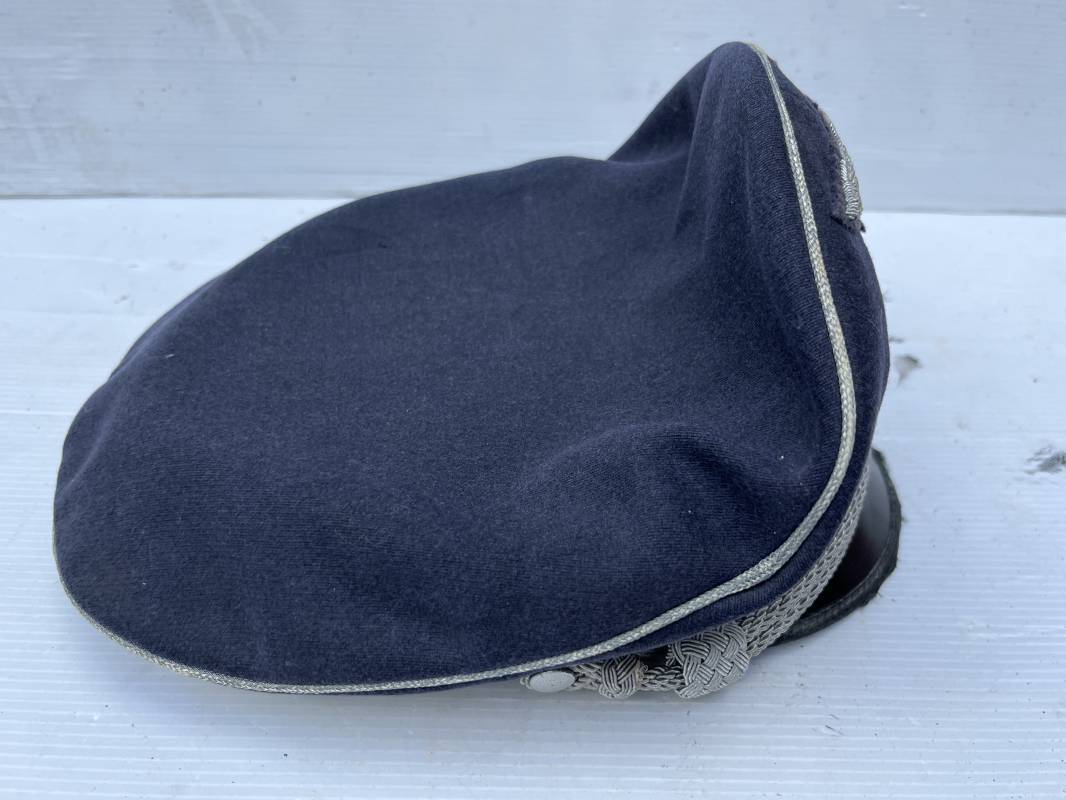 Très belle casquette d'un officier de la Luftwaffe. Casquette en gabardine fine gris bleu. Liseré argent toute arme. Insignes brodés cannetille argent : aigle et cocarde. Jugulaire tressée officier. Bandeau de coiffe extèrieur en coton satiné rayé noir. Visière en fibre vulcanisée noire, revers guilloché vert, modèle avec petit jonc sur le pourtour . Belle forme cassée "Sattel Form". Intèrieur doublé en satinette dorée . Large rhodoid avec marquage et logo fabricant ' J.Spere Regensburg'. Bandeau de coiffe intèrieur en cuir marron clair , petit noeud en soie blanche sur le derrière . Taille 56. Casquette légèrement portée en parfait état 1942/45. Ref 20008