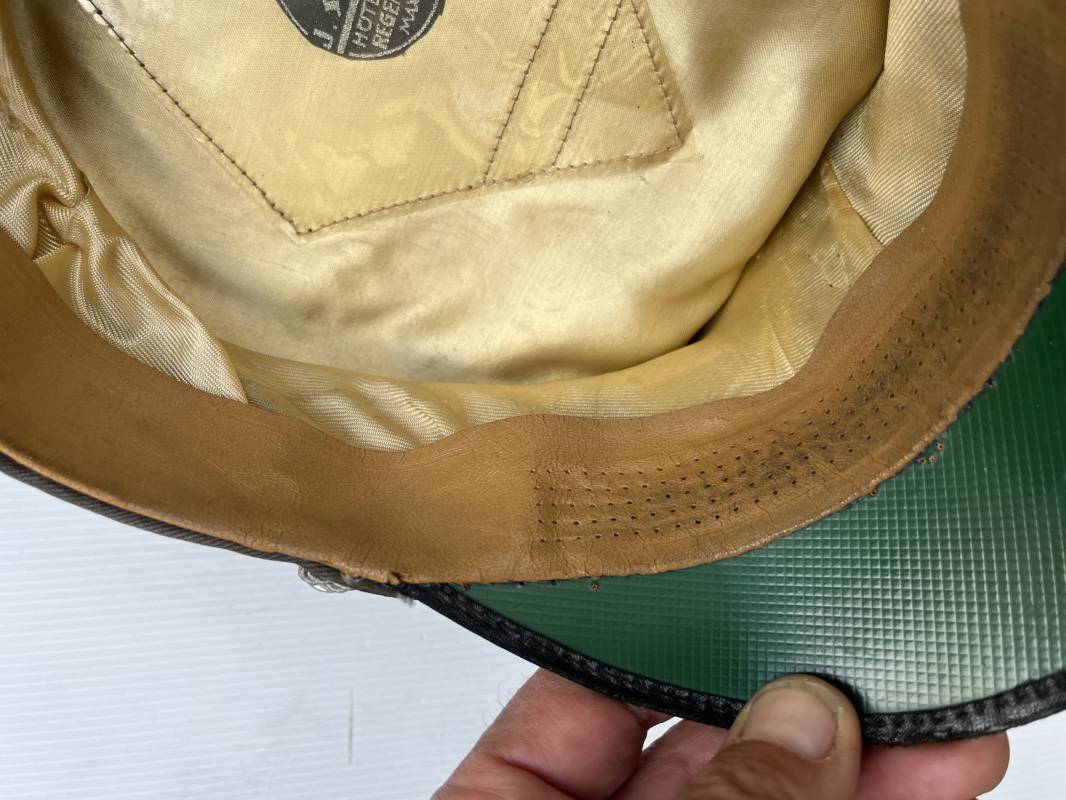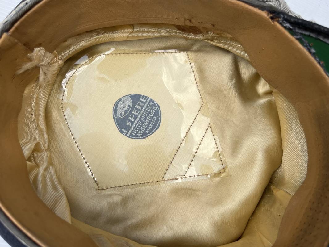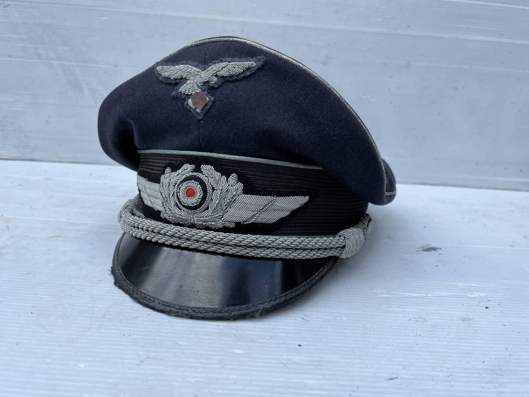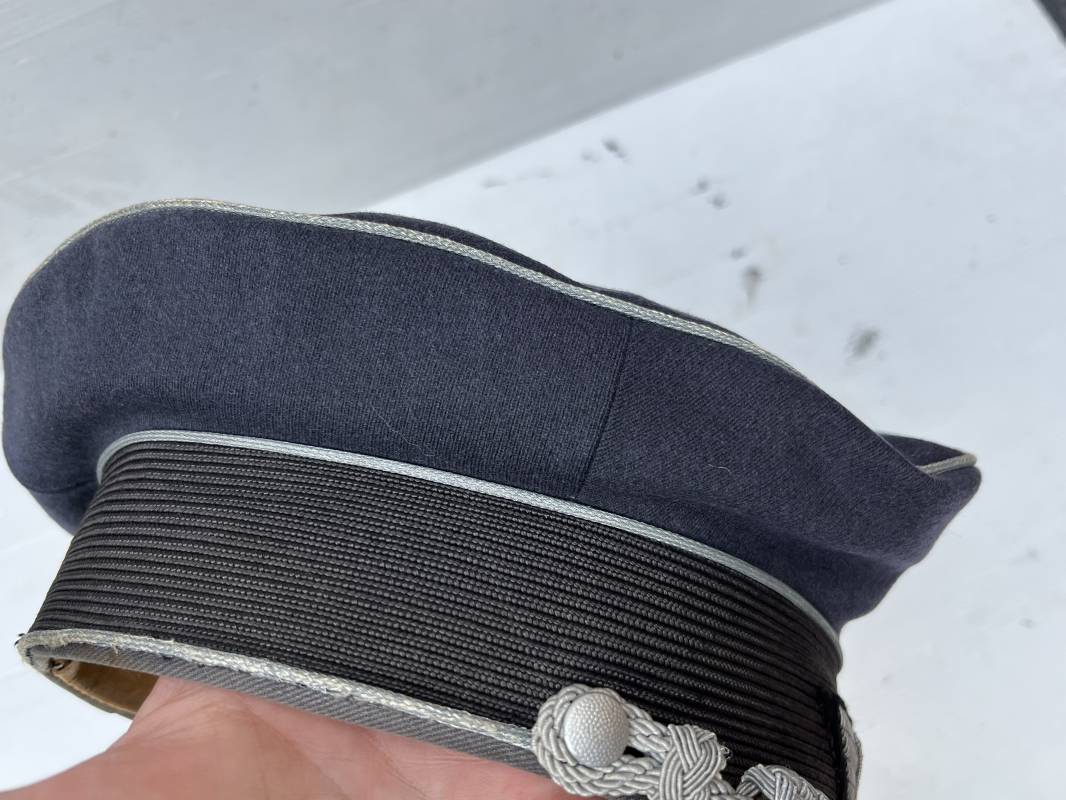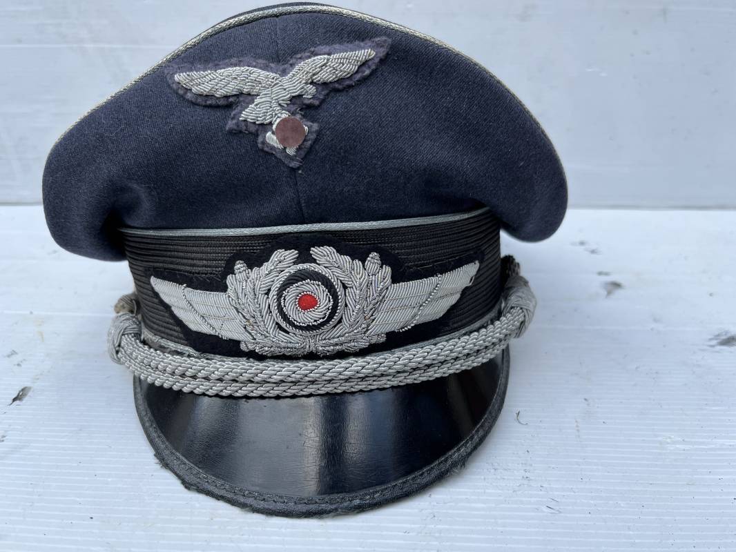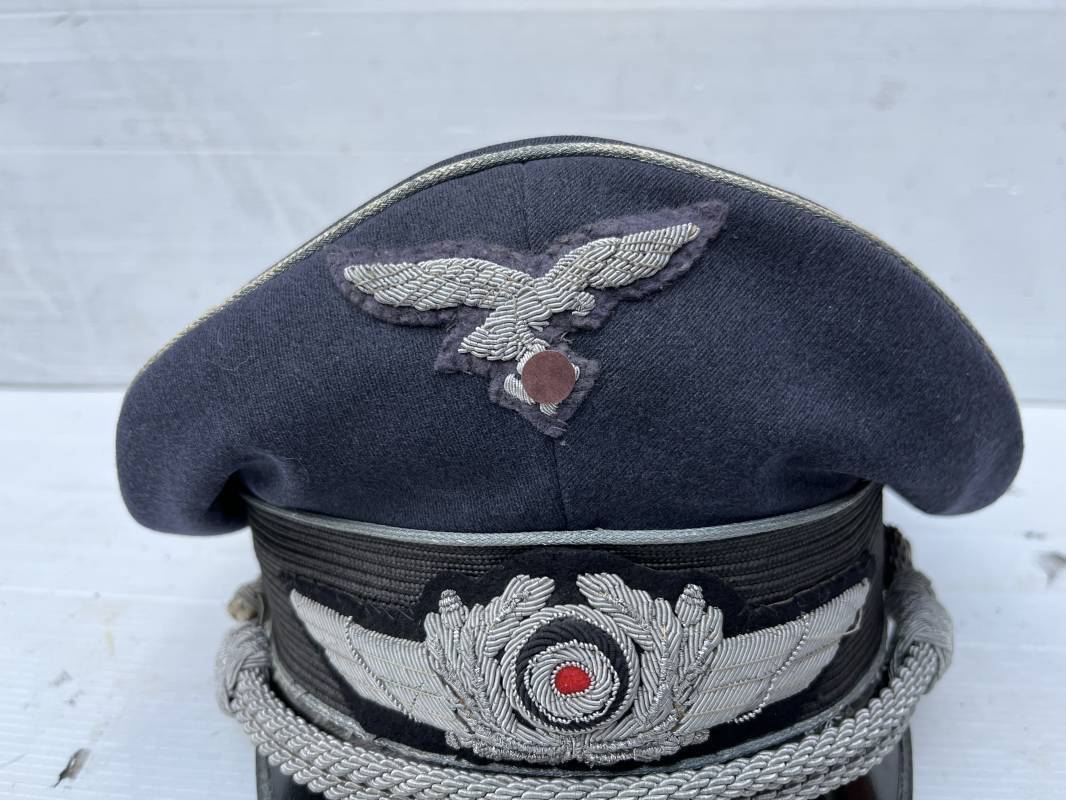 Très belle casquette d'un officier de la Luftwaffe. Casquette en gabardine fine gris bleu. Liseré argent toute arme. Insignes brodés cannetille argent : aigle et cocarde. Jugulaire tressée officier. Bandeau de coiffe extèrieur en coton satiné rayé noir. Visière en fibre vulcanisée noire, revers guilloché vert, modèle avec petit jonc sur le pourtour . Belle forme cassée "Sattel Form". Intèrieur doublé en satinette dorée . Large rhodoid avec marquage et logo fabricant ' J.Spere Regensburg'. Bandeau de coiffe intèrieur en cuir marron clair , petit noeud en soie blanche sur le derrière . Taille 56. Casquette légèrement portée en parfait état 1942/45. Ref 20008