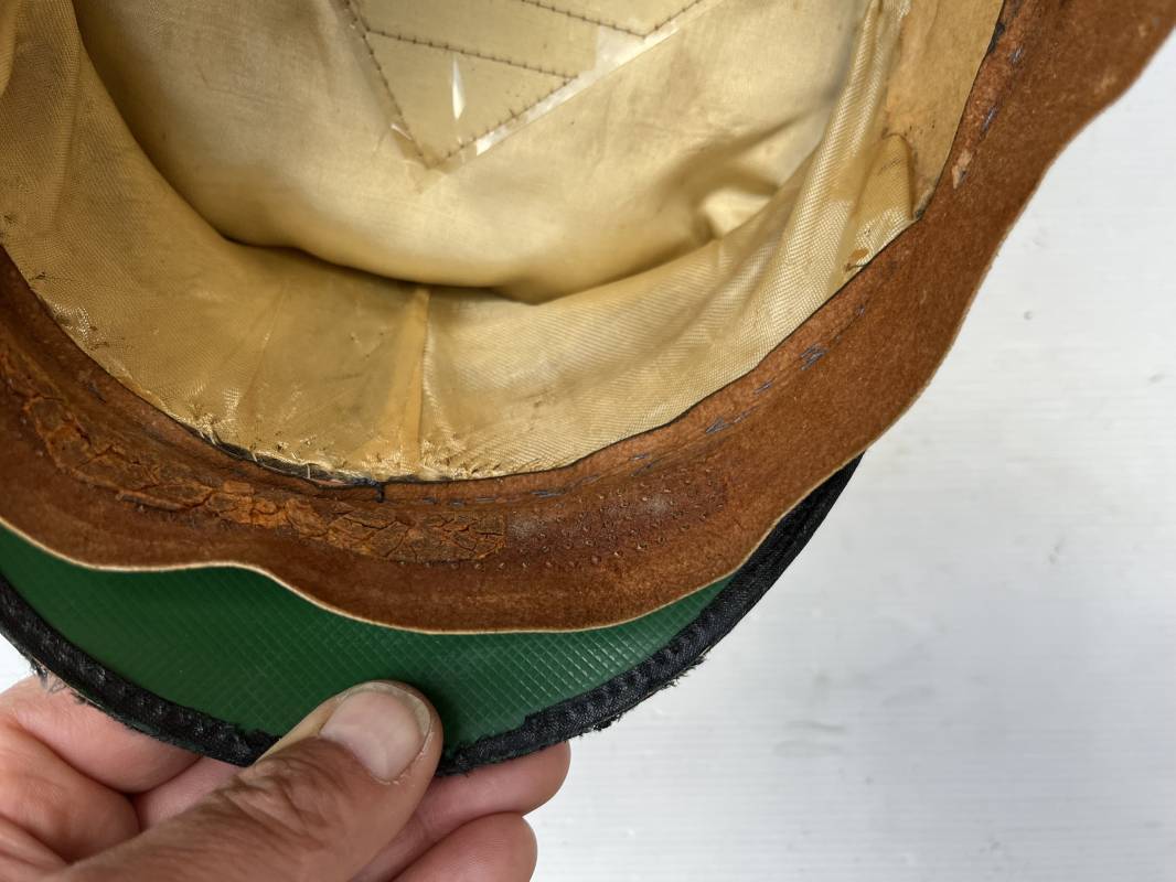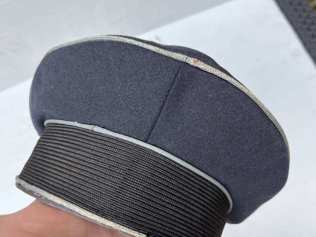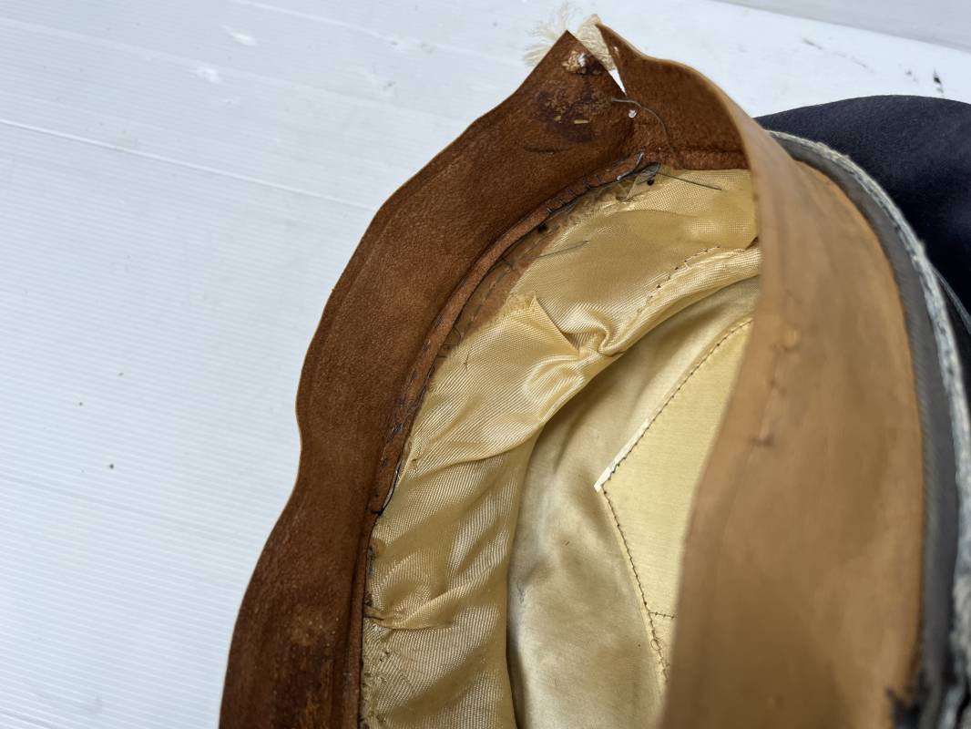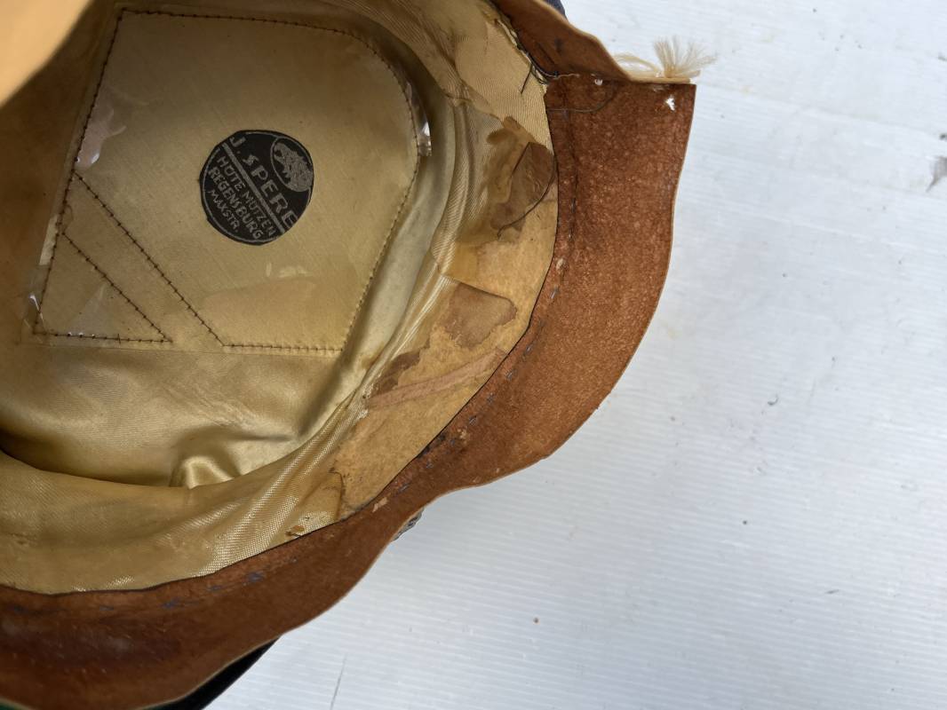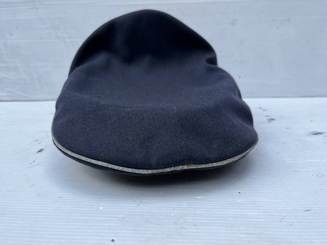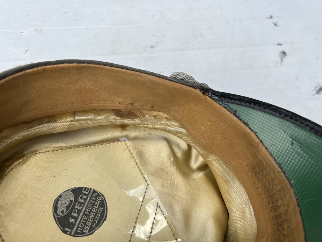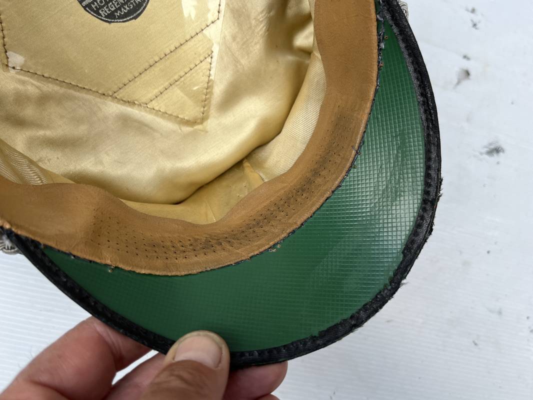 Très belle casquette d'un officier de la Luftwaffe. Casquette en gabardine fine gris bleu. Liseré argent toute arme. Insignes brodés cannetille argent : aigle et cocarde. Jugulaire tressée officier. Bandeau de coiffe extèrieur en coton satiné rayé noir. Visière en fibre vulcanisée noire, revers guilloché vert, modèle avec petit jonc sur le pourtour . Belle forme cassée "Sattel Form". Intèrieur doublé en satinette dorée . Large rhodoid avec marquage et logo fabricant ' J.Spere Regensburg'. Bandeau de coiffe intèrieur en cuir marron clair , petit noeud en soie blanche sur le derrière . Taille 56. Casquette légèrement portée en parfait état 1942/45. Ref 20008