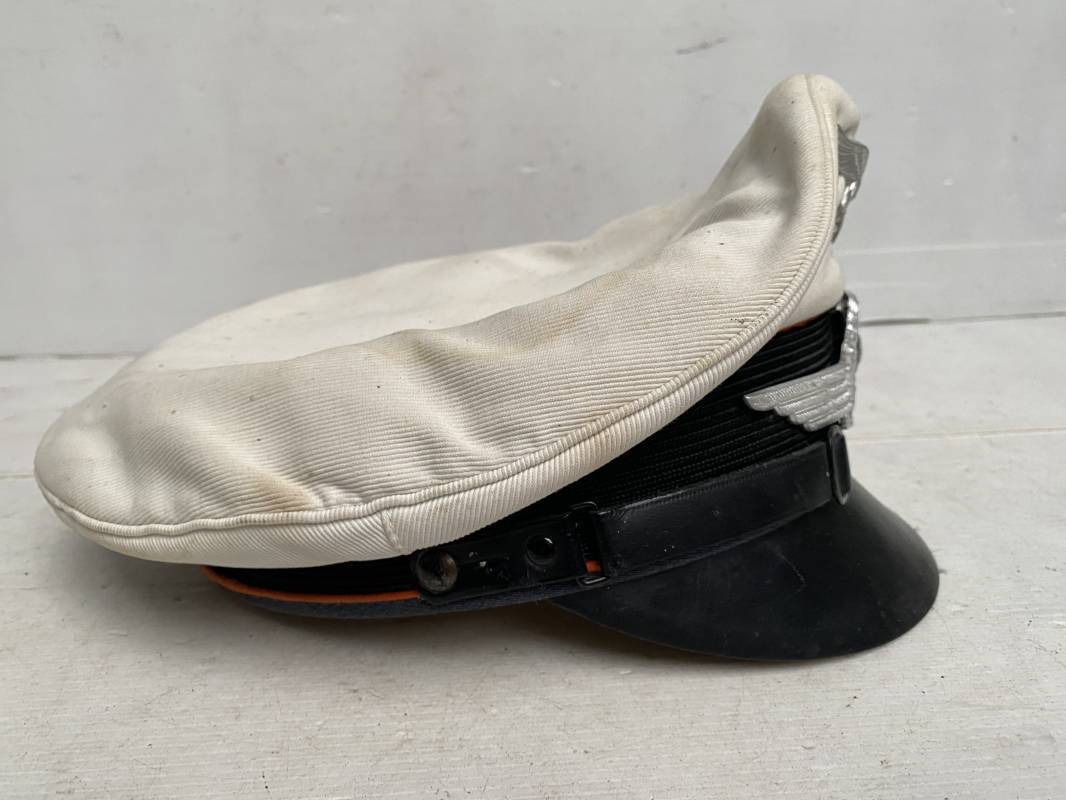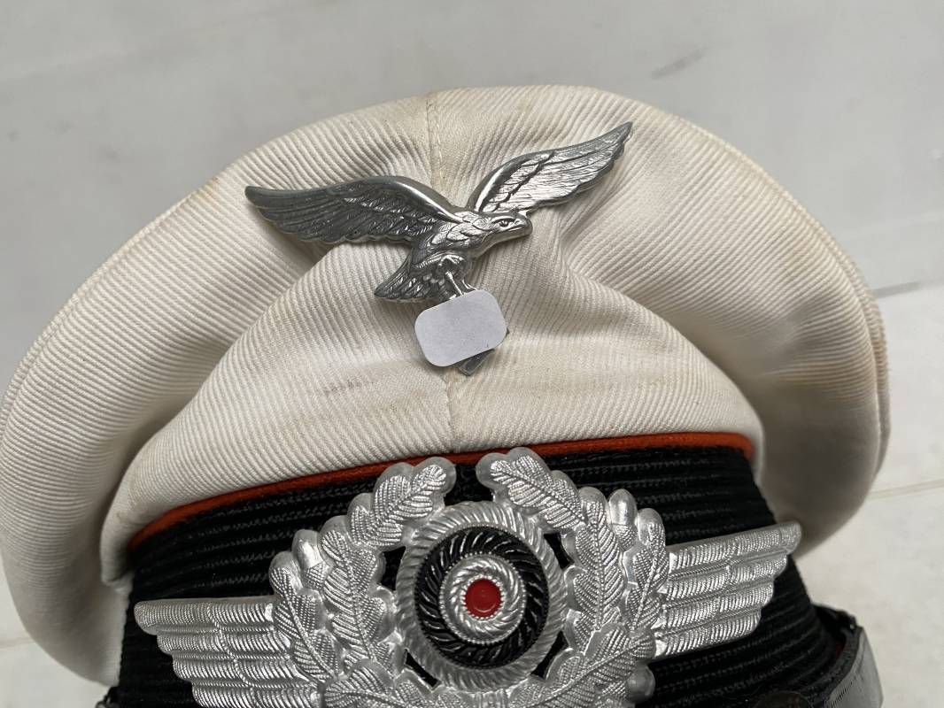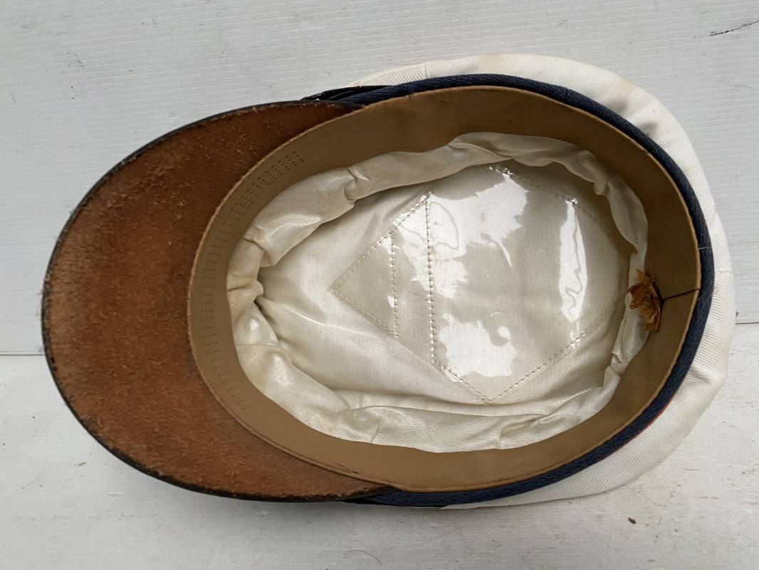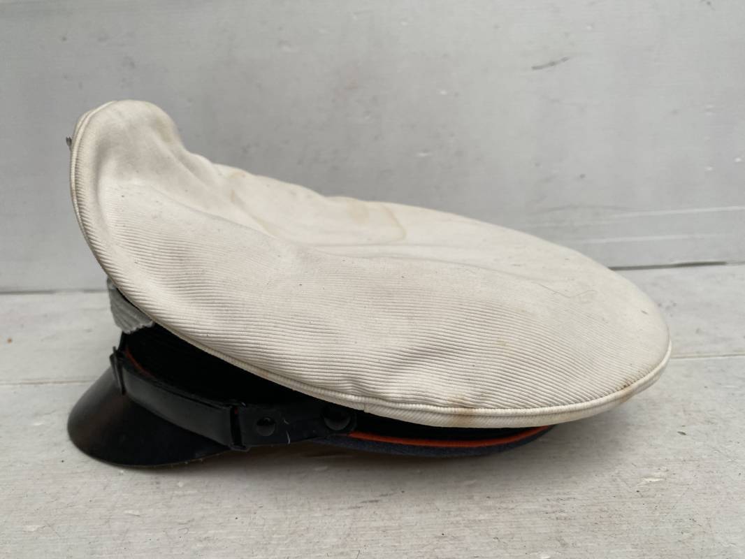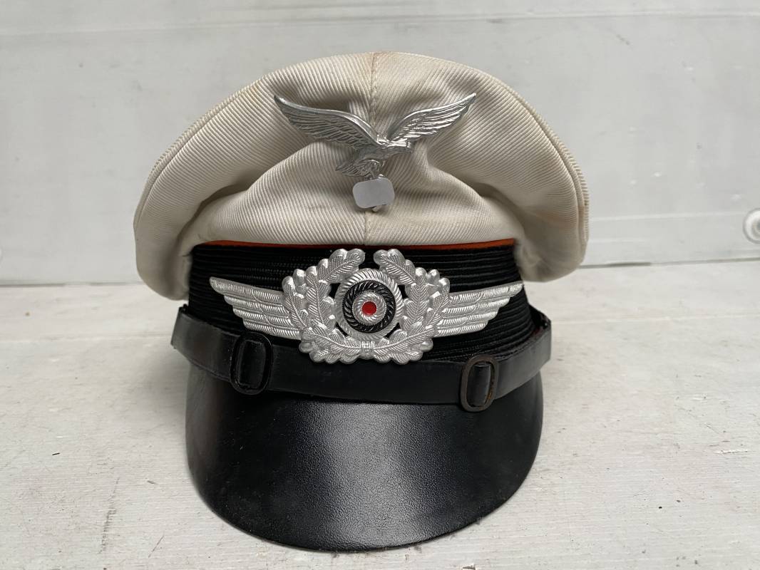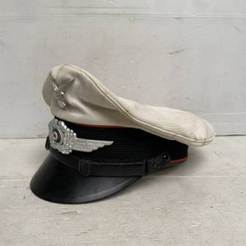 Rare casquette d'été d'un sous officier de l'Artillerie (Flak) de la Luftwaffe. Casquette avec coiffe amovible en coton blanc. Insignes alu aigle et cocarde. Bandeau de coiffe extèrieur en coton satiné noir. Liseré rouge de l'Artillerie (Flak). Jugulaire en cuir vernis noire. Visière en cuir noir, revers en cuir naturel. Intèrieur doublé en satinette blanche. Rhodoid. Bandeau de coiffe intèrieur en cuir marron clair. Petit noeud soie marron. Taille 56. Casquette légèrement portée en parfait état. Rare casquette d'été de la Flak avec visière en cuir 1935/45. Ref 18728