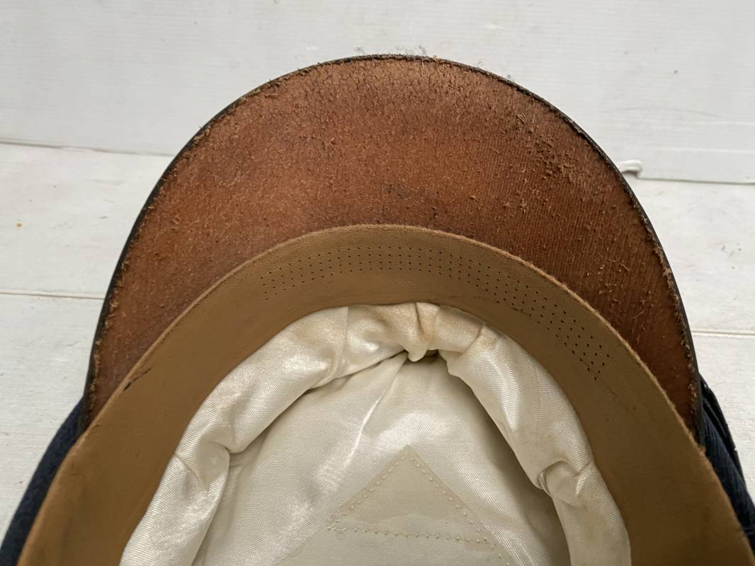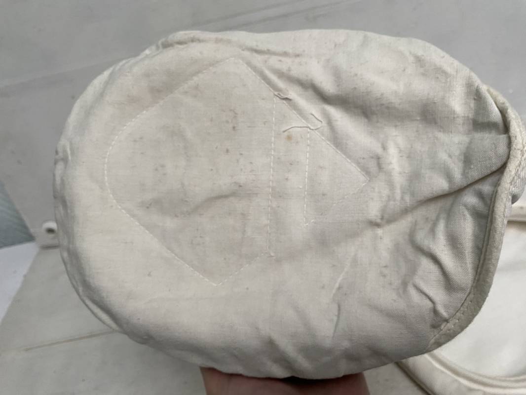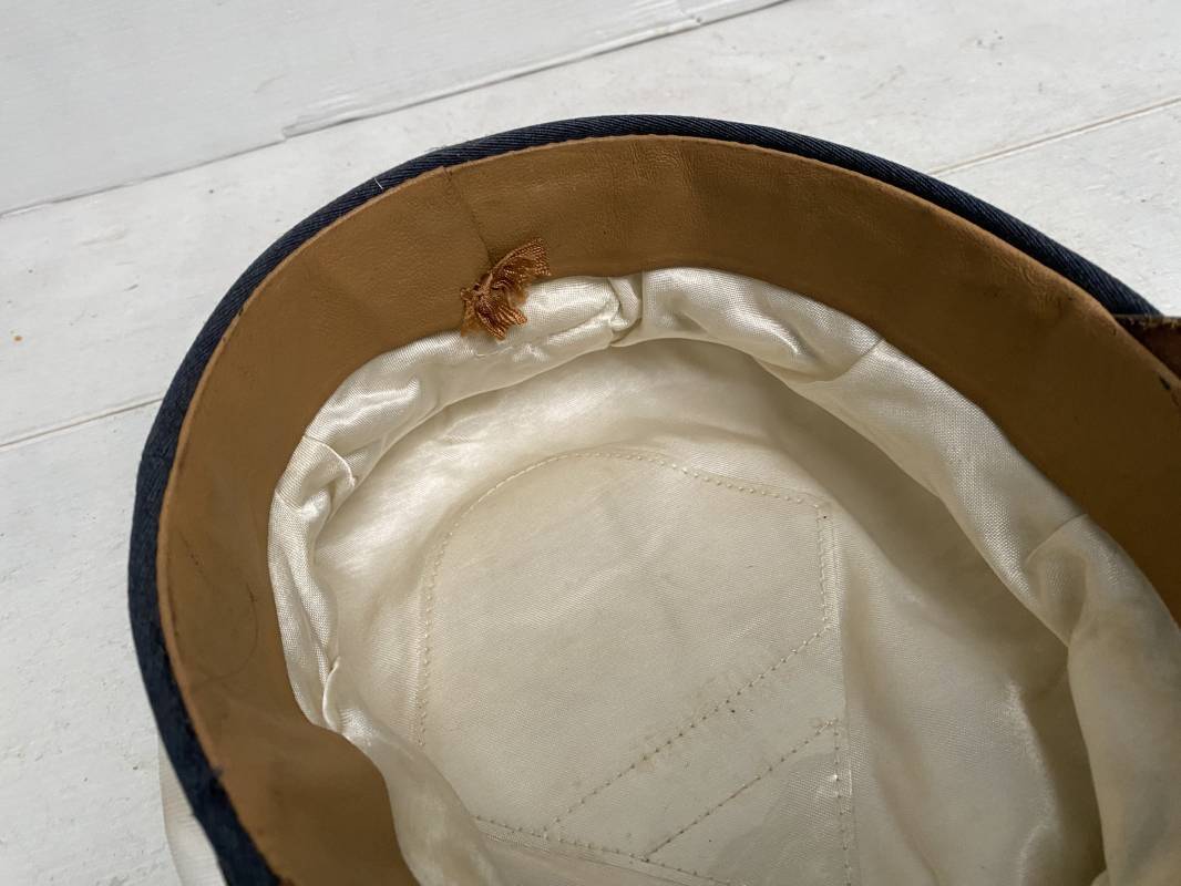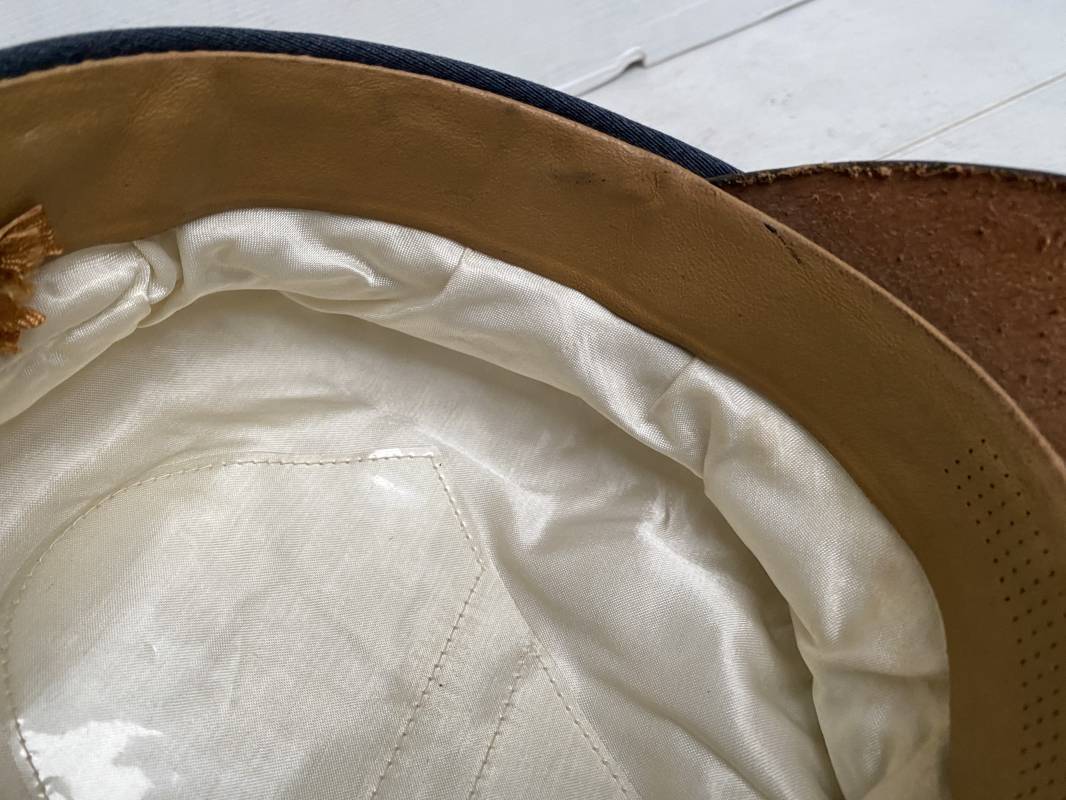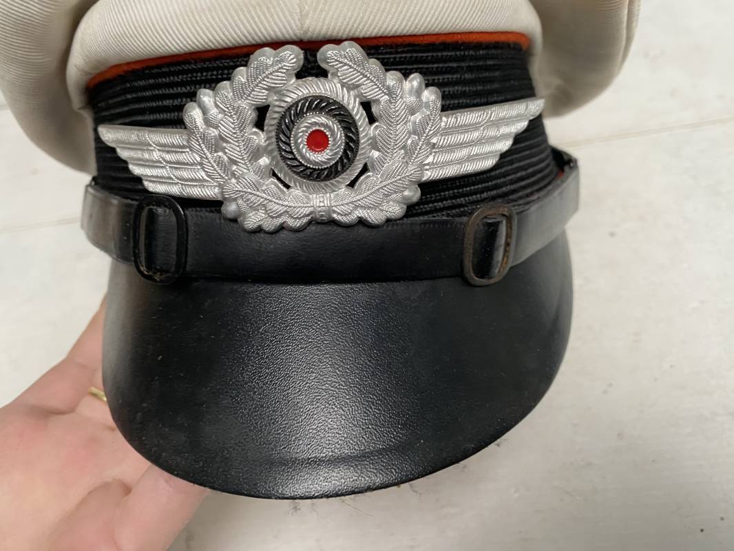 Rare casquette d'été d'un sous officier de l'Artillerie (Flak) de la Luftwaffe. Casquette avec coiffe amovible en coton blanc. Insignes alu aigle et cocarde. Bandeau de coiffe extèrieur en coton satiné noir. Liseré rouge de l'Artillerie (Flak). Jugulaire en cuir vernis noire. Visière en cuir noir, revers en cuir naturel. Intèrieur doublé en satinette blanche. Rhodoid. Bandeau de coiffe intèrieur en cuir marron clair. Petit noeud soie marron. Taille 56. Casquette légèrement portée en parfait état. Rare casquette d'été de la Flak avec visière en cuir 1935/45. Ref 18728
