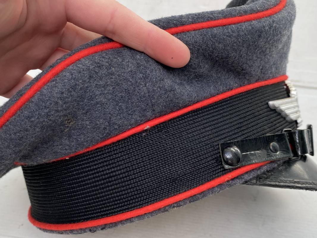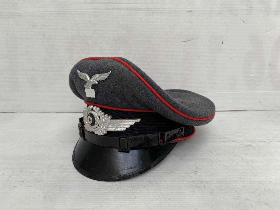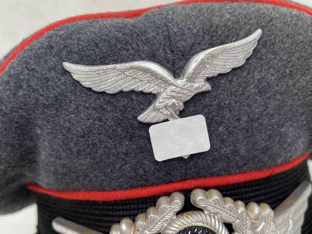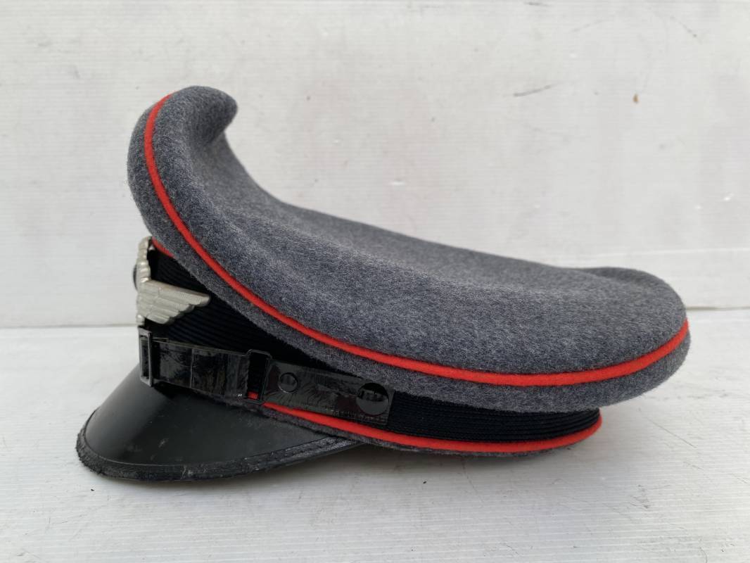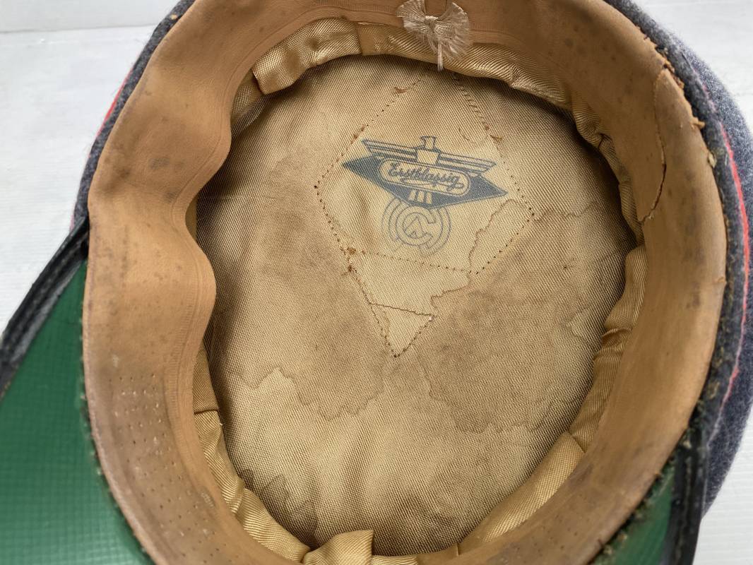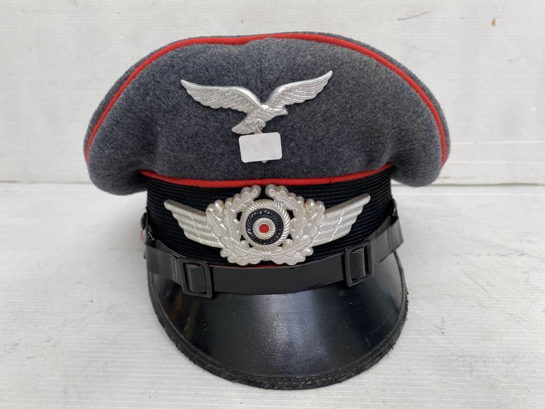 Belle casquette d'un sous officier de la Luftwaffe. Casquette en drap gris/bleu, liseré rouge de l'Artillerie. Belle forme (Sattel Form). Insignes en alu : aigle et cocarde. Bandeau de coiffe extérieur en coton satiné noir. Jugulaire en cuir vernis noir. Visière en fibre vulcanisée noire. Revers guilloché vert. Jonc sur le pourtour. Intèrieur doublé en satinette dorée. Rhodoid manquant. Marquage fabricant en fond : 'Clément Wagner Erstklassic' et logo. Bandeau de coiffe intèrieur en cuir fauve, taille 56, Casquette légèrement portée en parfait état 1940/45. Ref 17234