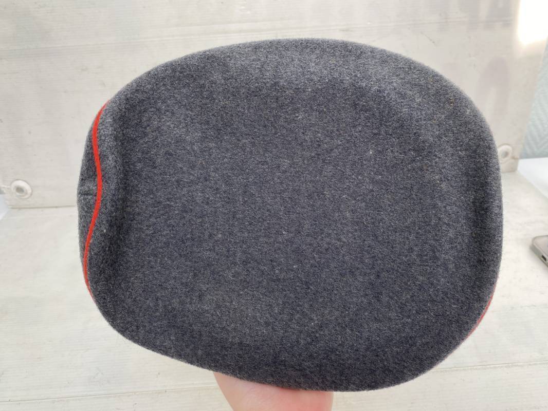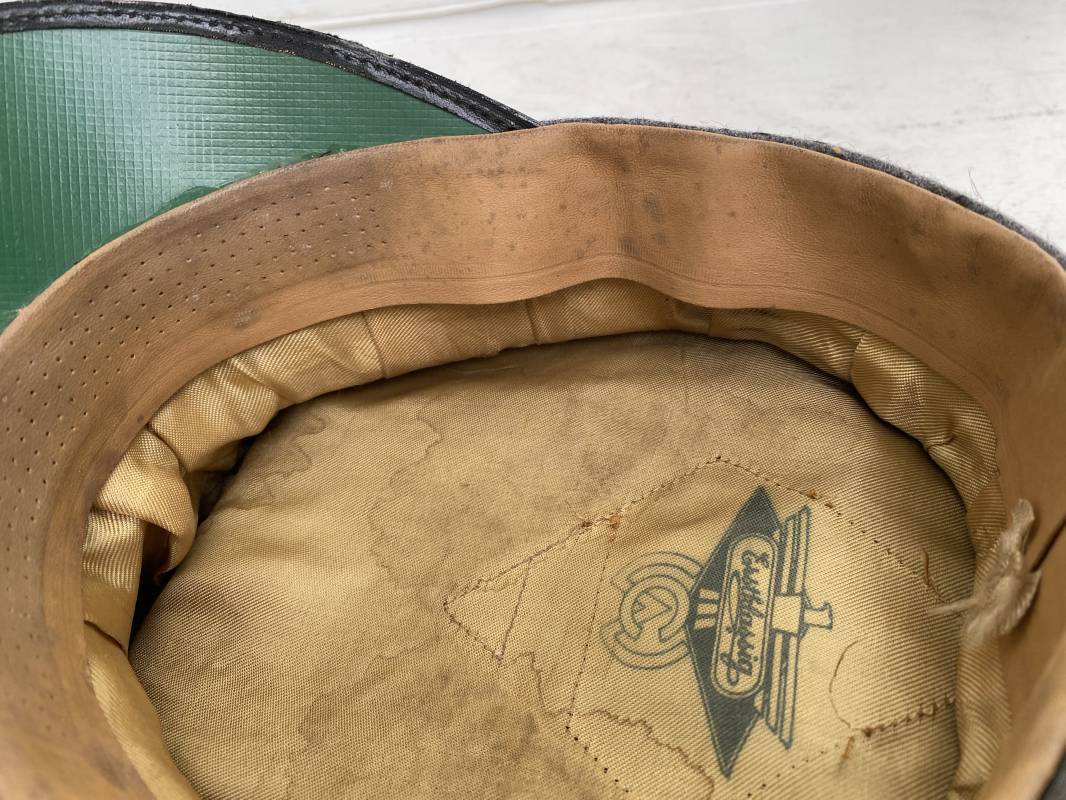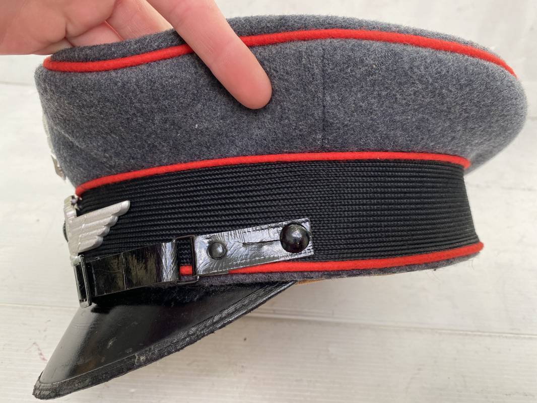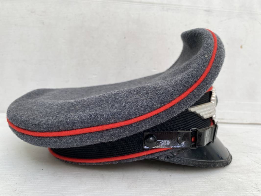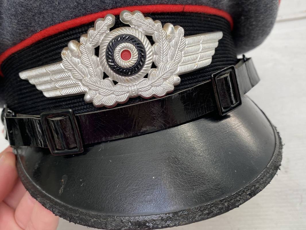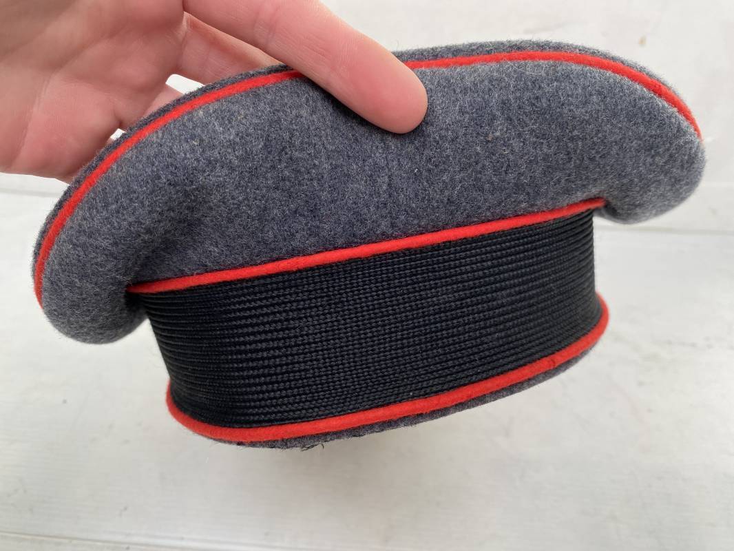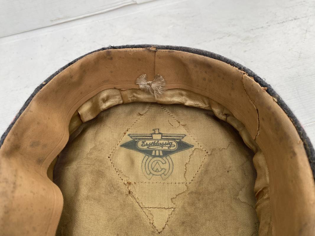 Belle casquette d'un sous officier de la Luftwaffe. Casquette en drap gris/bleu, liseré rouge de l'Artillerie. Belle forme (Sattel Form). Insignes en alu : aigle et cocarde. Bandeau de coiffe extérieur en coton satiné noir. Jugulaire en cuir vernis noir. Visière en fibre vulcanisée noire. Revers guilloché vert. Jonc sur le pourtour. Intèrieur doublé en satinette dorée. Rhodoid manquant. Marquage fabricant en fond : 'Clément Wagner Erstklassic' et logo. Bandeau de coiffe intèrieur en cuir fauve, taille 56, Casquette légèrement portée en parfait état 1940/45. Ref 17234