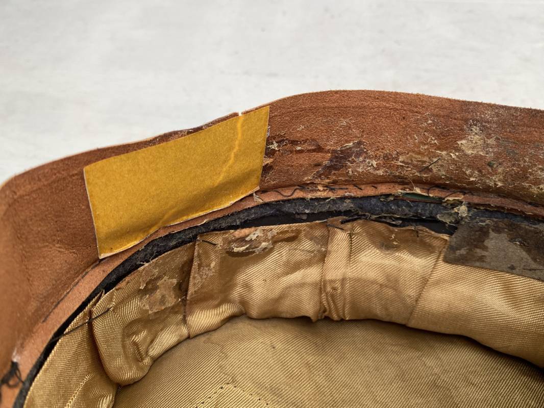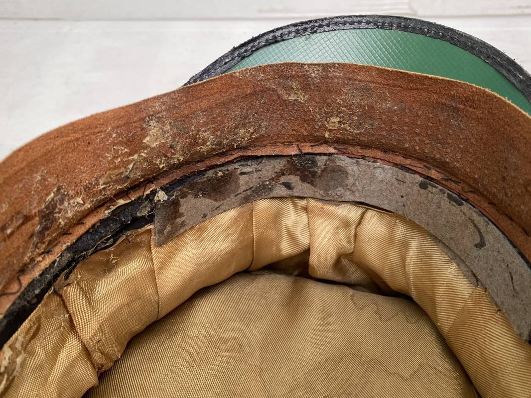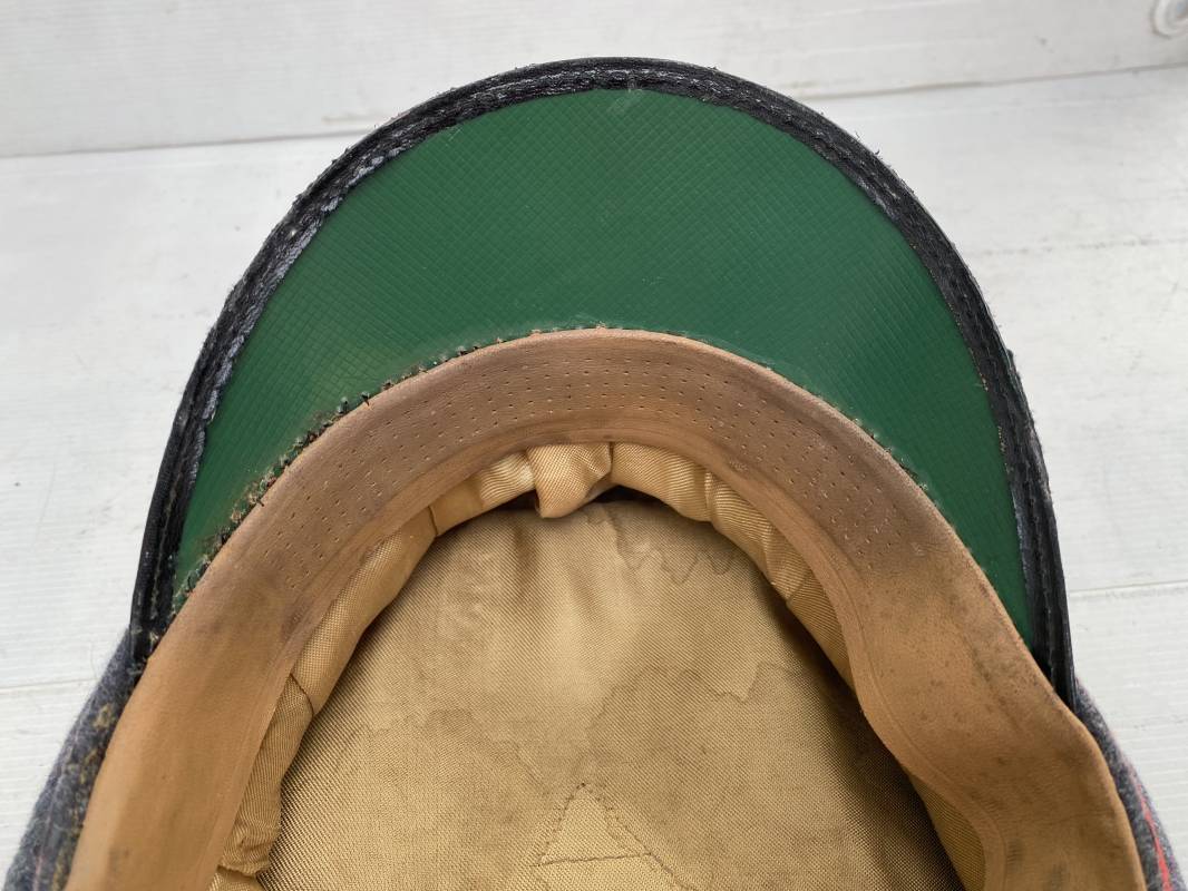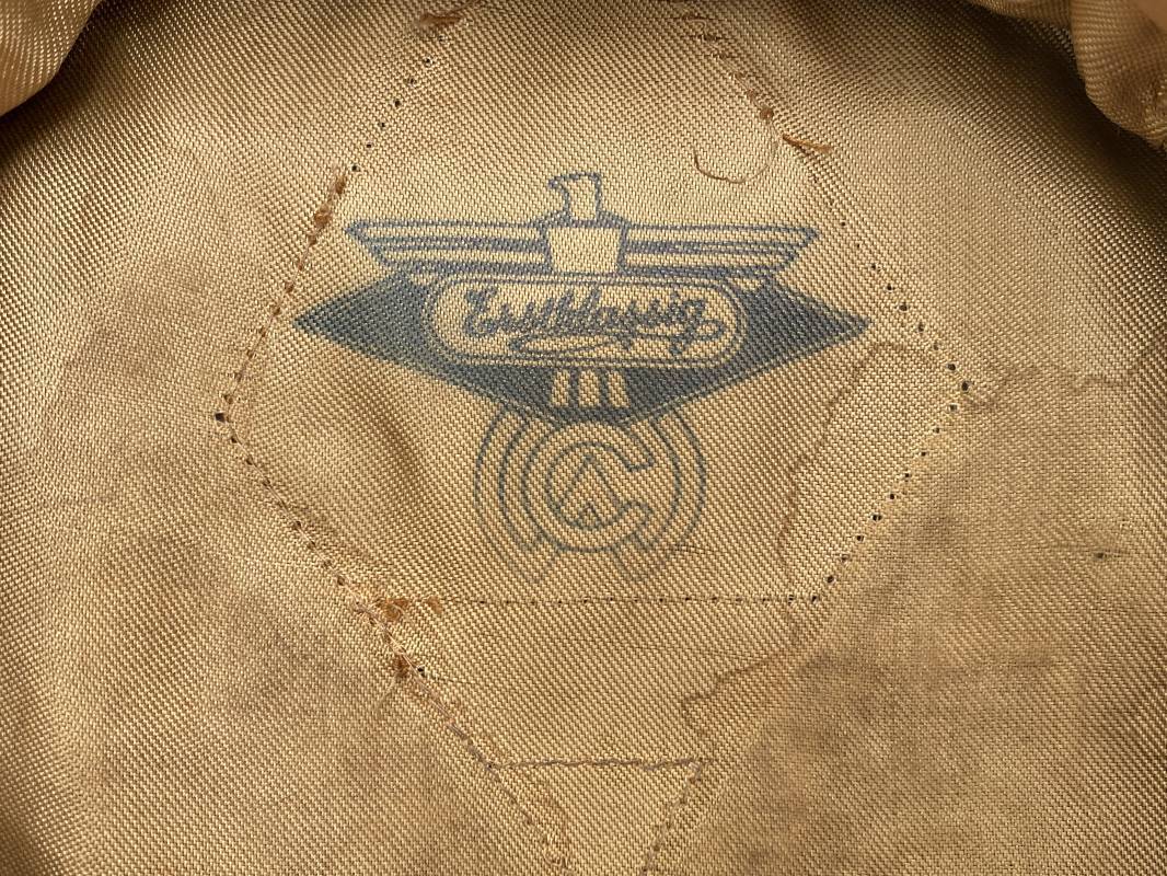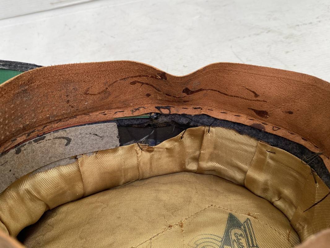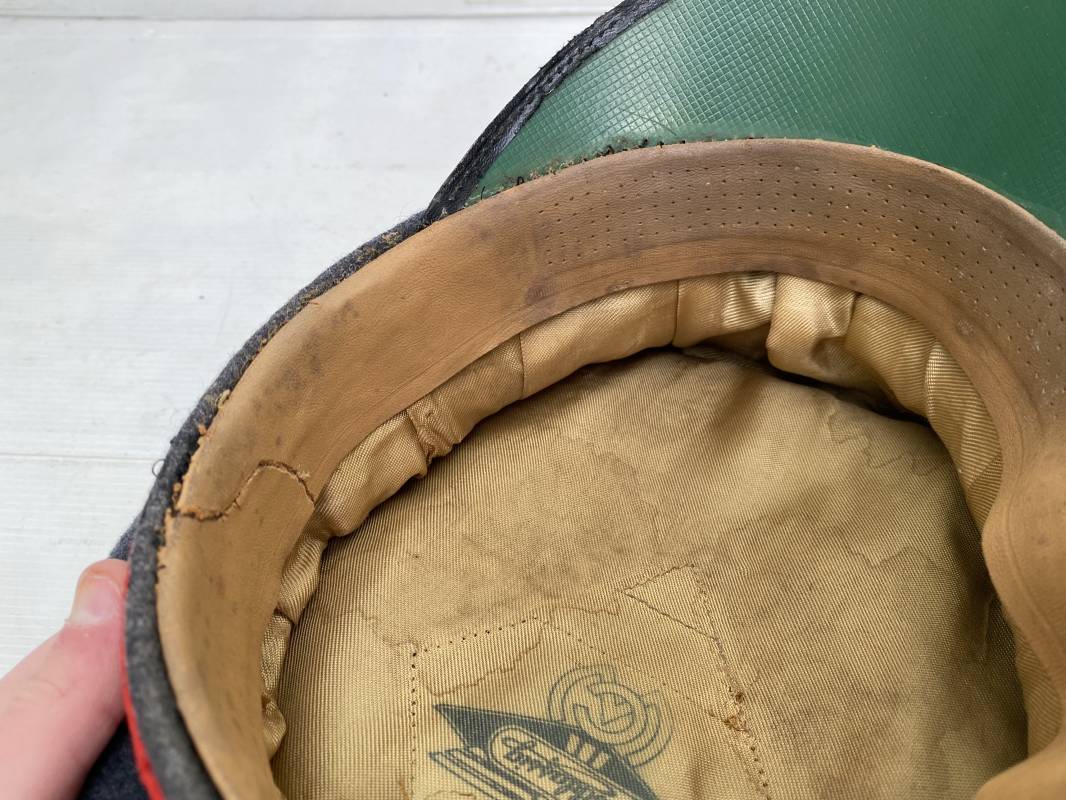 Belle casquette d'un sous officier de la Luftwaffe. Casquette en drap gris/bleu, liseré rouge de l'Artillerie. Belle forme (Sattel Form). Insignes en alu : aigle et cocarde. Bandeau de coiffe extérieur en coton satiné noir. Jugulaire en cuir vernis noir. Visière en fibre vulcanisée noire. Revers guilloché vert. Jonc sur le pourtour. Intèrieur doublé en satinette dorée. Rhodoid manquant. Marquage fabricant en fond : 'Clément Wagner Erstklassic' et logo. Bandeau de coiffe intèrieur en cuir fauve, taille 56, Casquette légèrement portée en parfait état 1940/45. Ref 17234