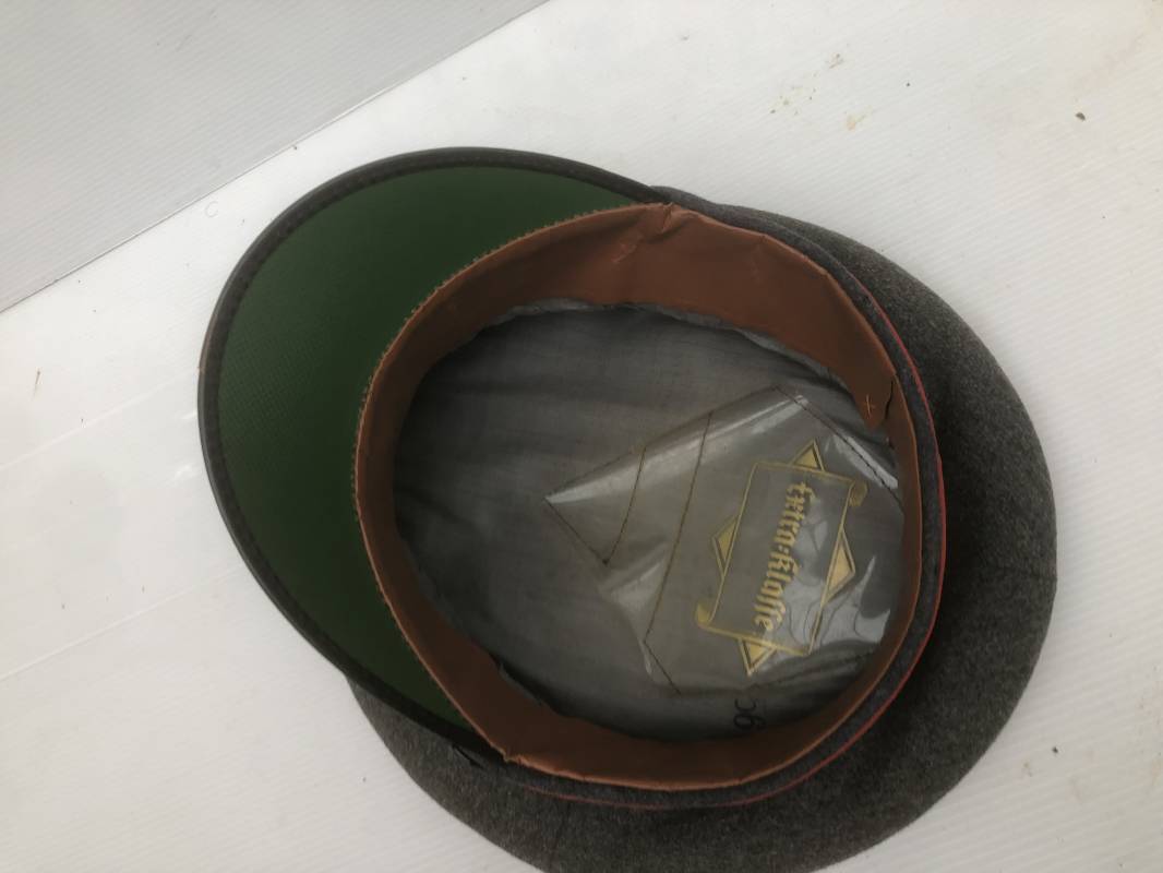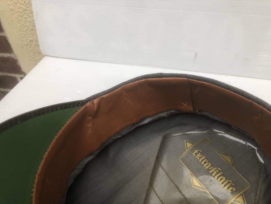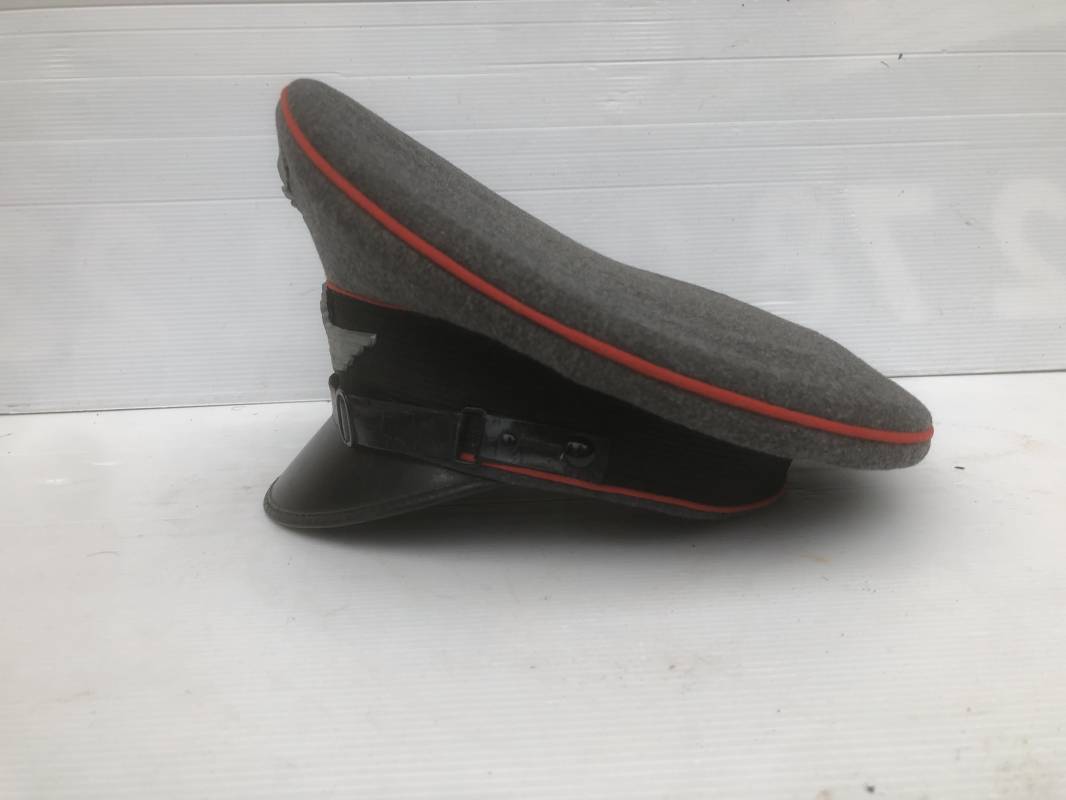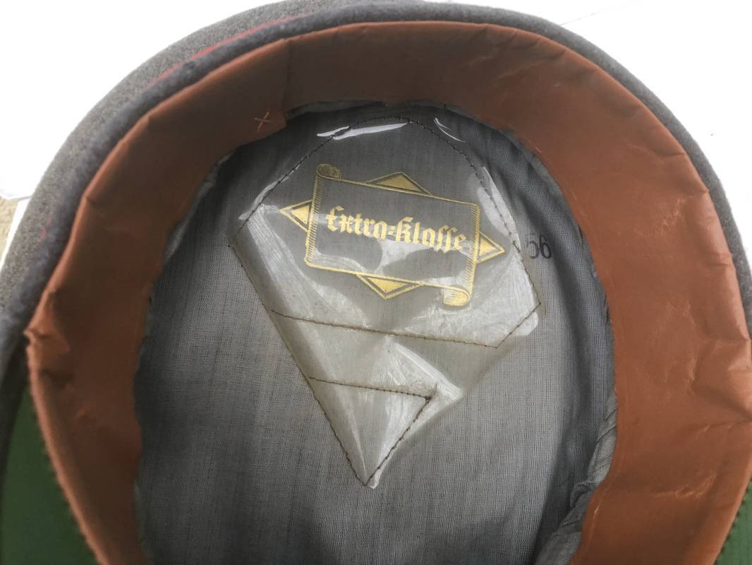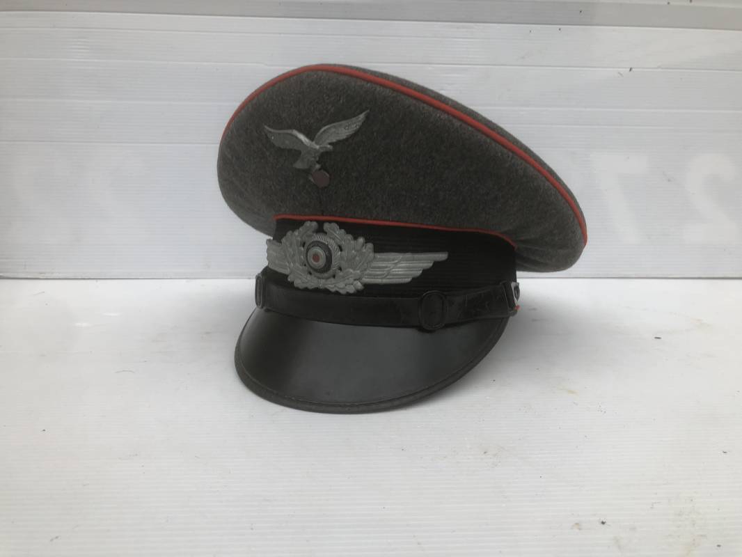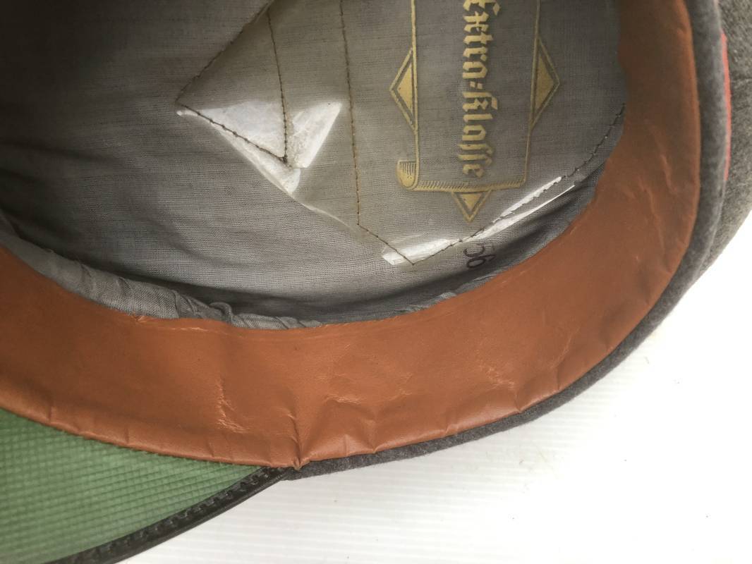 Trés belle casquette d'un sous officier de l artillerie de la Luftwaffe ( Flak) . Casquette en gabardine gris bleu . Insignes en zinc aigle et cocarde . Aigle modele 1938 . Liseré rouge de l'artillerie . Jugulaire en cuir noir vernis . Bandeau de coiffe extérieur en coton rayé noir . Belle forme haute en forme de selle (sattel form) . Visière en fibre vulcanisée noire , petit jonc , revers guilloché vert . L'intérieur de la coiffe doublée en coton gris rhodoid avec logo fabricant 'Extra Klasse' . Bandeau de coiffe intérieur en carton cuir ( alkor ) marron . Taille 56 . Casquette légérement portée en trés bel état 1940/45 Ref 19624