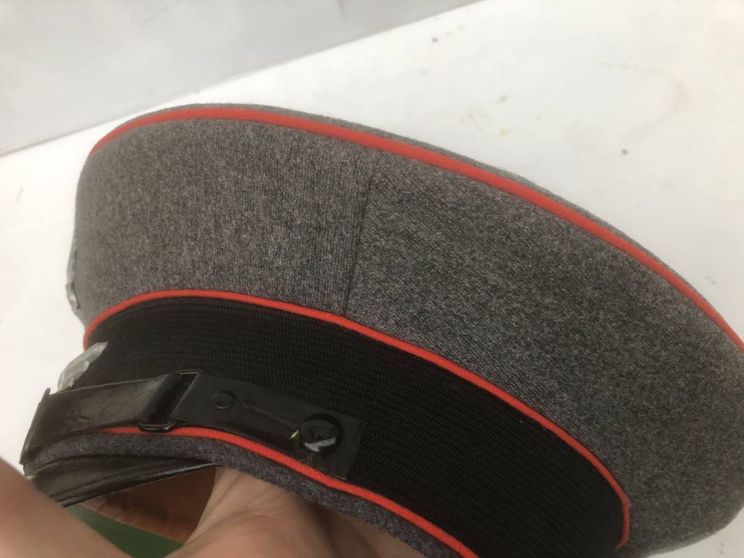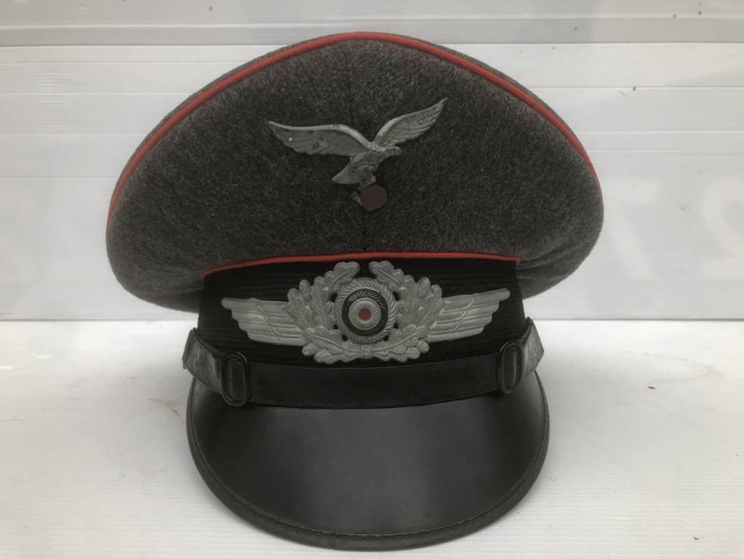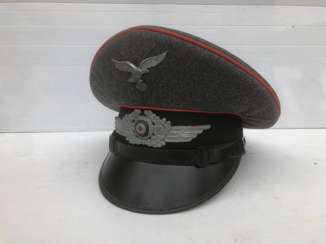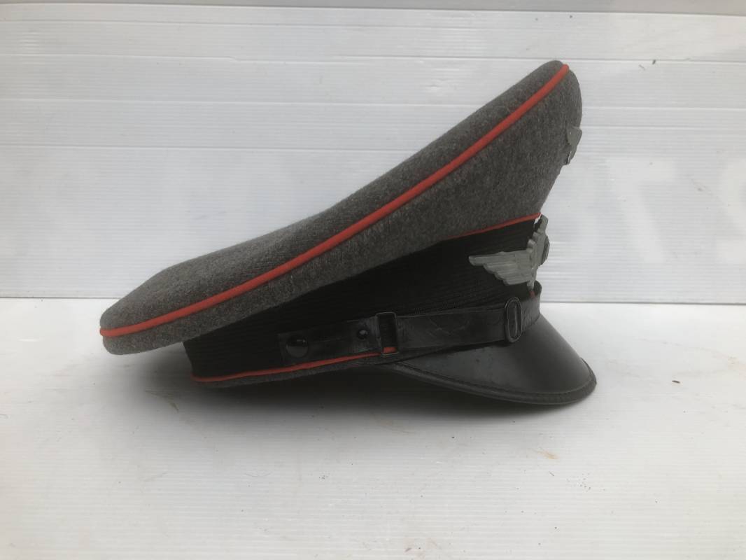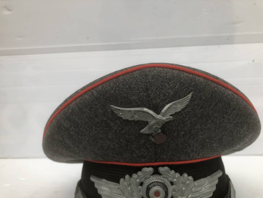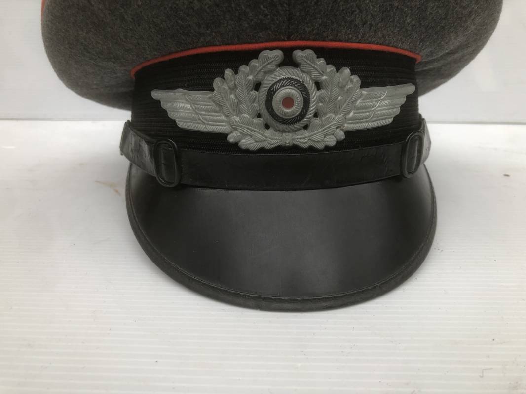 Trés belle casquette d'un sous officier de l artillerie de la Luftwaffe ( Flak) . Casquette en gabardine gris bleu . Insignes en zinc aigle et cocarde . Aigle modele 1938 . Liseré rouge de l'artillerie . Jugulaire en cuir noir vernis . Bandeau de coiffe extérieur en coton rayé noir . Belle forme haute en forme de selle (sattel form) . Visière en fibre vulcanisée noire , petit jonc , revers guilloché vert . L'intérieur de la coiffe doublée en coton gris rhodoid avec logo fabricant 'Extra Klasse' . Bandeau de coiffe intérieur en carton cuir ( alkor ) marron . Taille 56 . Casquette légérement portée en trés bel état 1940/45 Ref 19624
