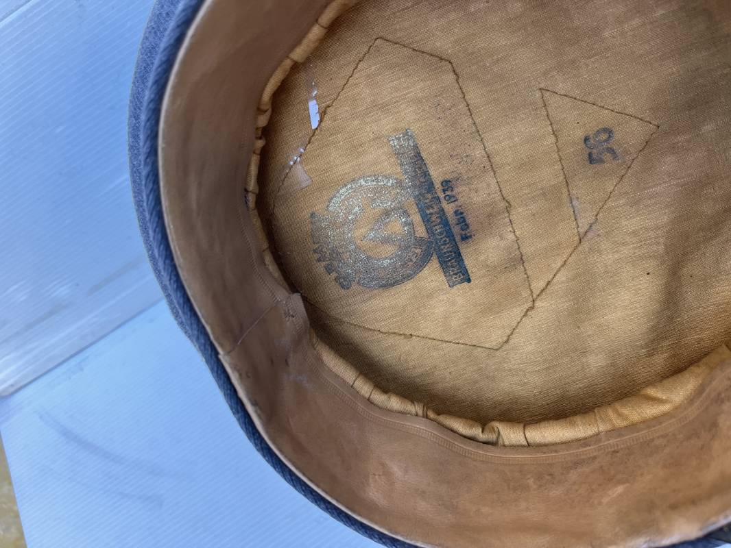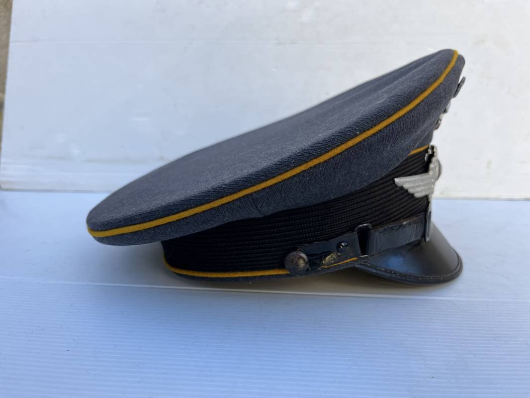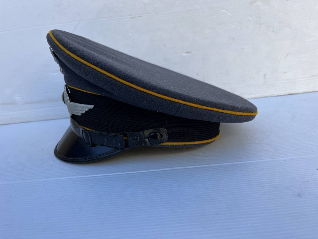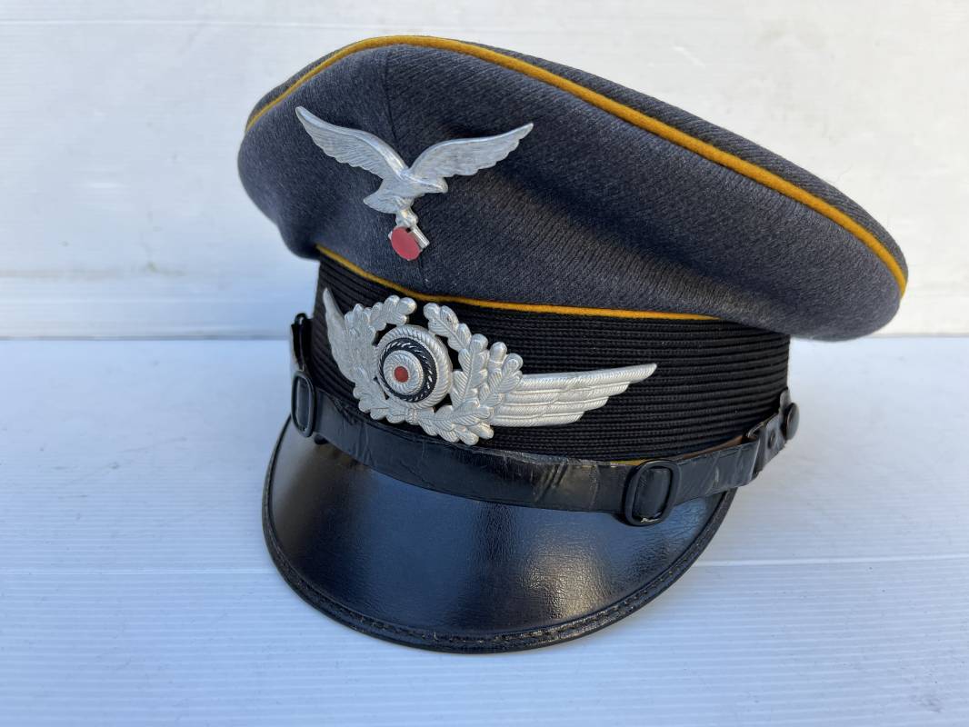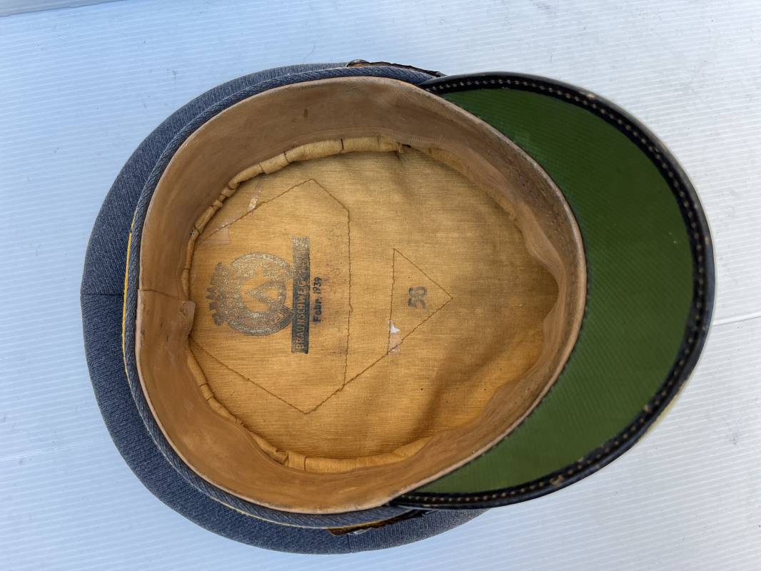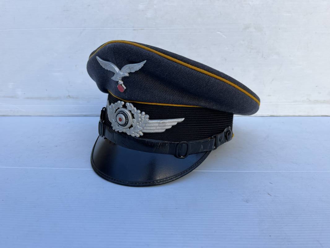Trés belle casquette d'un sous officier navigant de la Luftwaffe. Casquette en tricotine gris/bleu, liseré jaune d or de navigant ou chasseur parachutiste . Belle forme (Sattel Form). Insignes en alu : aigle et cocarde. Bandeau de coiffe extérieur en coton satiné noir. Jugulaire en cuir vernis noir. Visière en fibre vulcanisée noire. Revers guilloché vert. Jonc sur le pourtour. Intèrieur doublé en coton brun rouille . Rhodoid manquant. Marquage fabricant en fond : 'Clément Wagner ' et logo. Daté Fevrier 1939 Bandeau de coiffe intèrieur en cuir fauve marquage d affectation d une école de vol F.Sch Bg 1939 , taille 56, Casquette légèrement portée en parfait état 1940/45. Ref 19789