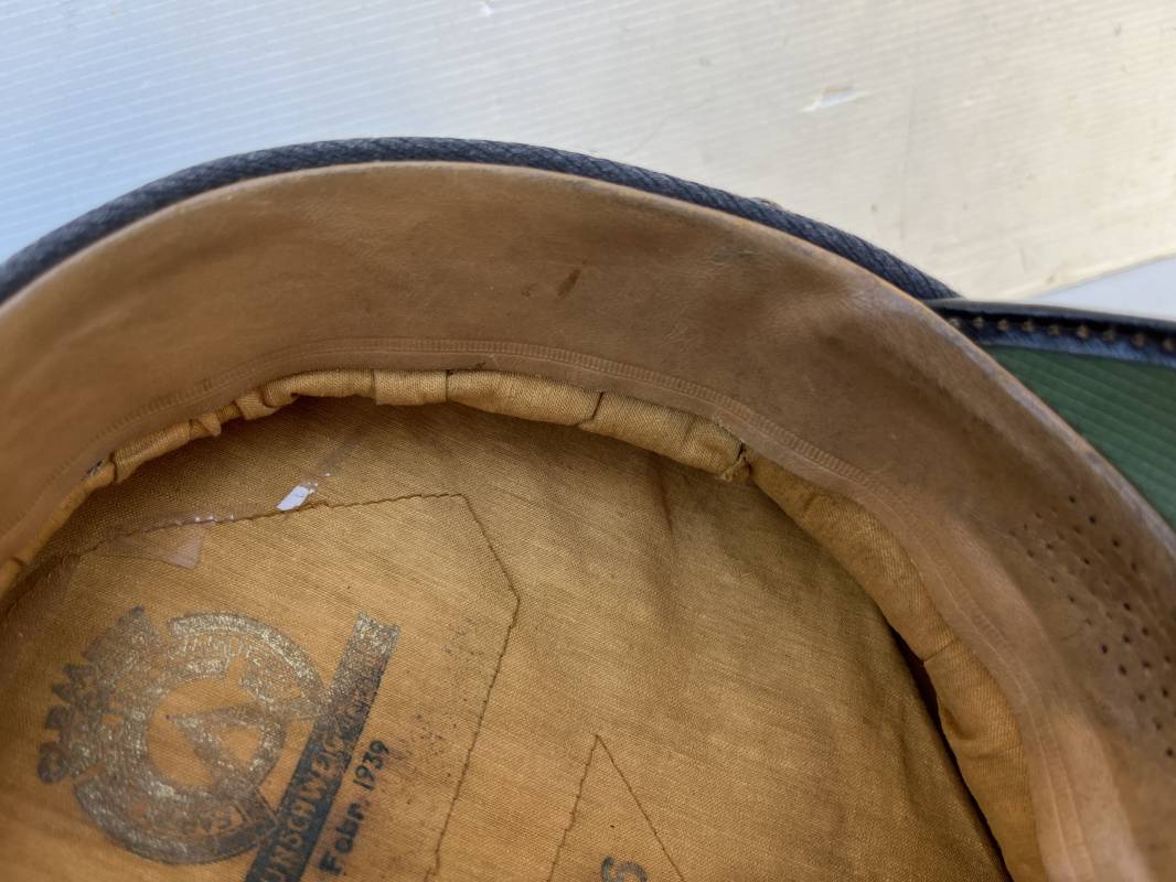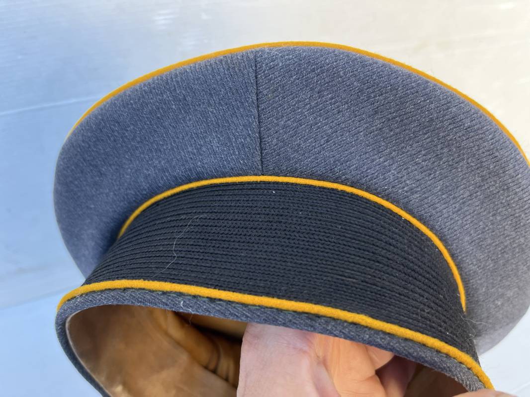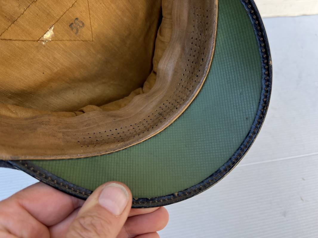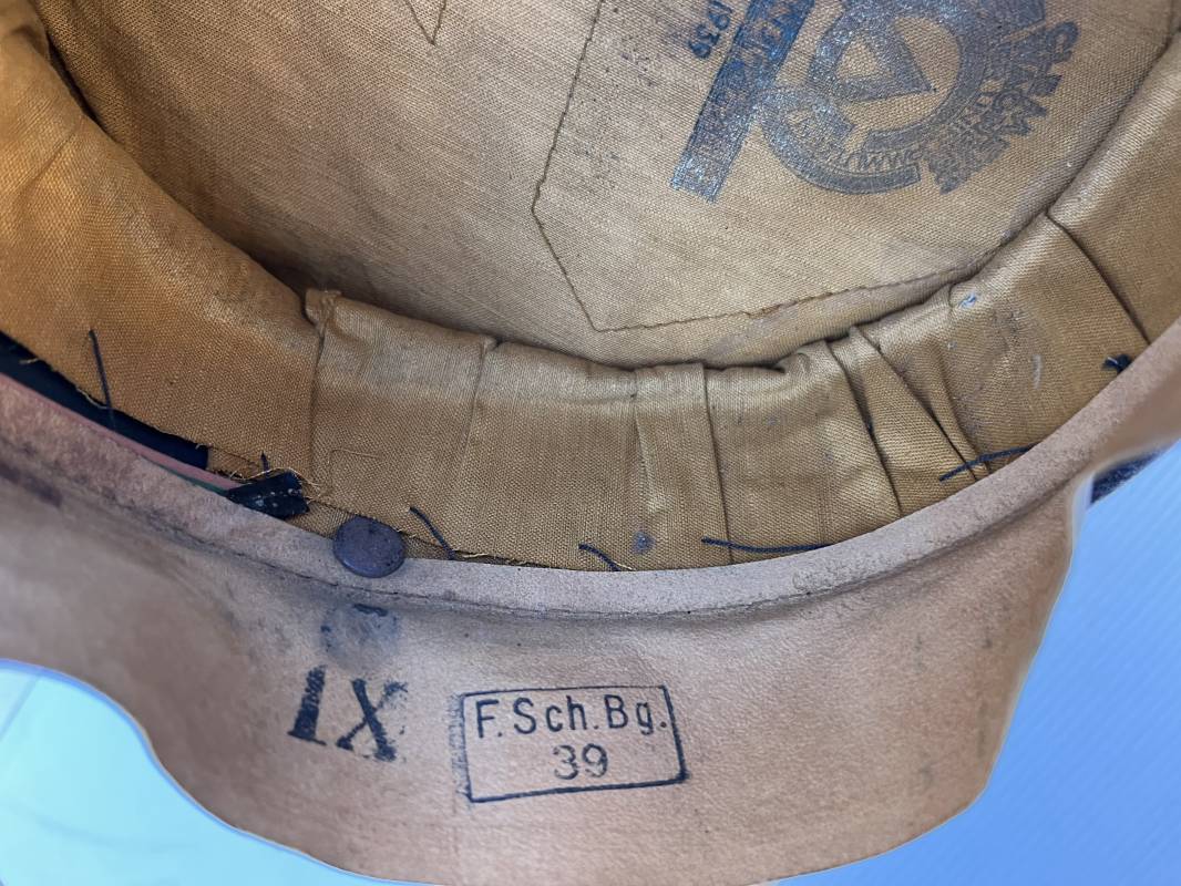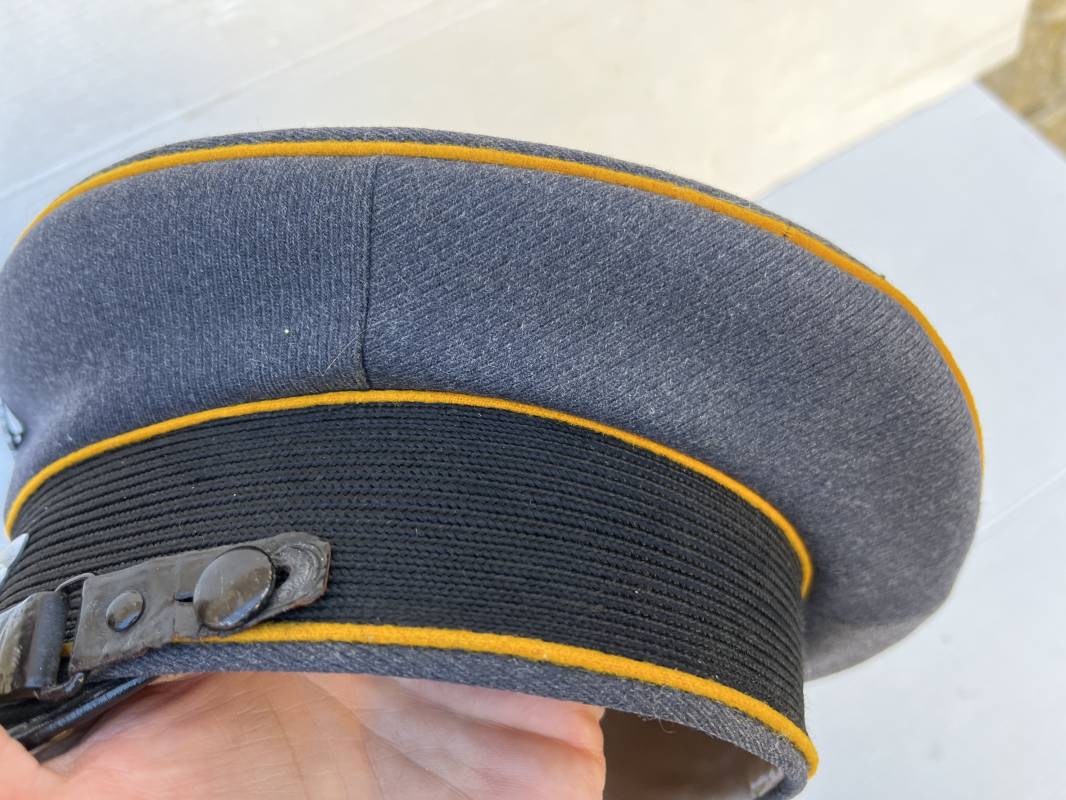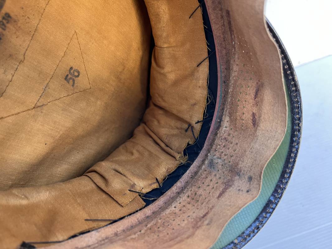 Trés belle casquette d'un sous officier navigant de la Luftwaffe. Casquette en tricotine gris/bleu, liseré jaune d or de navigant ou chasseur parachutiste . Belle forme (Sattel Form). Insignes en alu : aigle et cocarde. Bandeau de coiffe extérieur en coton satiné noir. Jugulaire en cuir vernis noir. Visière en fibre vulcanisée noire. Revers guilloché vert. Jonc sur le pourtour. Intèrieur doublé en coton brun rouille . Rhodoid manquant. Marquage fabricant en fond : 'Clément Wagner ' et logo. Daté Fevrier 1939 Bandeau de coiffe intèrieur en cuir fauve marquage d affectation d une école de vol F.Sch Bg 1939 , taille 56, Casquette légèrement portée en parfait état 1940/45. Ref 19789