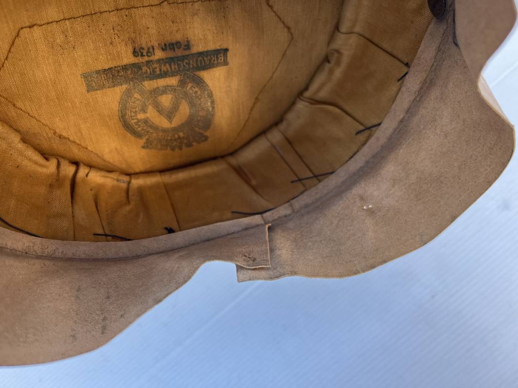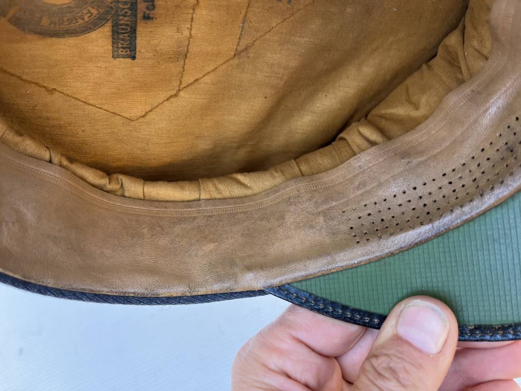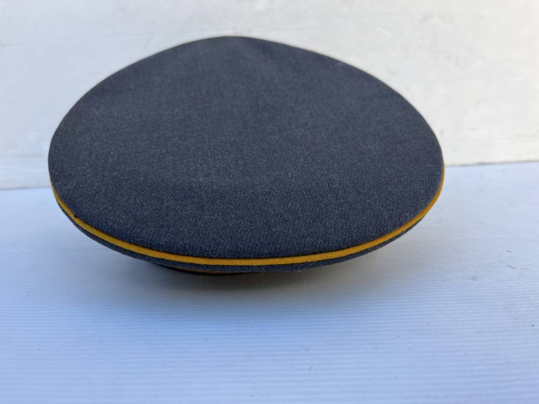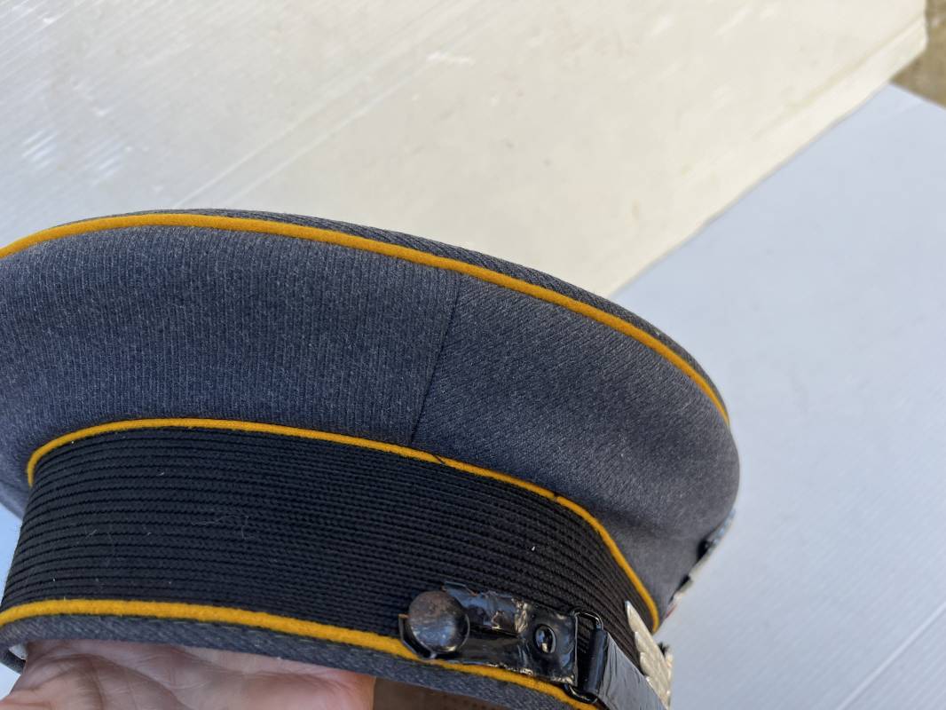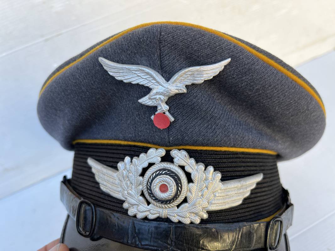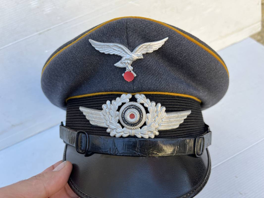 Trés belle casquette d'un sous officier navigant de la Luftwaffe. Casquette en tricotine gris/bleu, liseré jaune d or de navigant ou chasseur parachutiste . Belle forme (Sattel Form). Insignes en alu : aigle et cocarde. Bandeau de coiffe extérieur en coton satiné noir. Jugulaire en cuir vernis noir. Visière en fibre vulcanisée noire. Revers guilloché vert. Jonc sur le pourtour. Intèrieur doublé en coton brun rouille . Rhodoid manquant. Marquage fabricant en fond : 'Clément Wagner ' et logo. Daté Fevrier 1939 Bandeau de coiffe intèrieur en cuir fauve marquage d affectation d une école de vol F.Sch Bg 1939 , taille 56, Casquette légèrement portée en parfait état 1940/45. Ref 19789