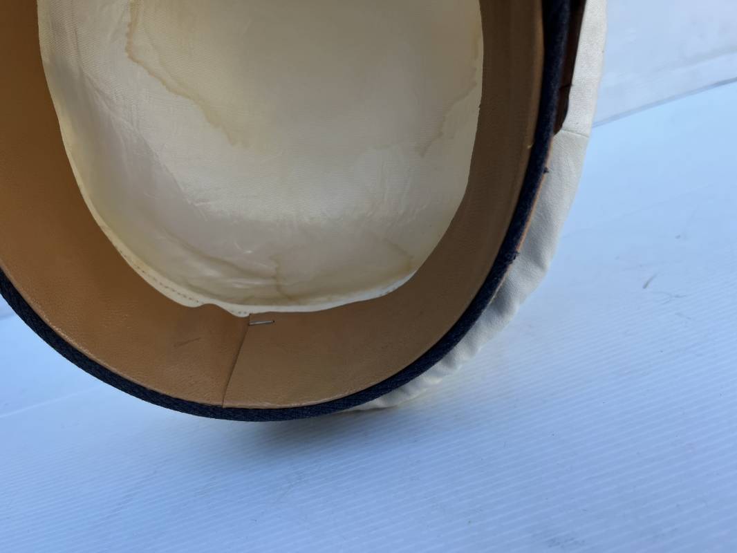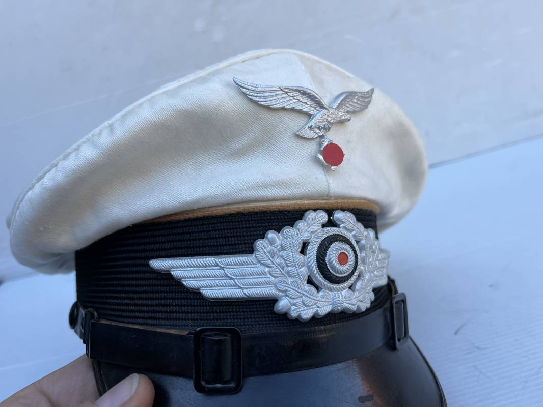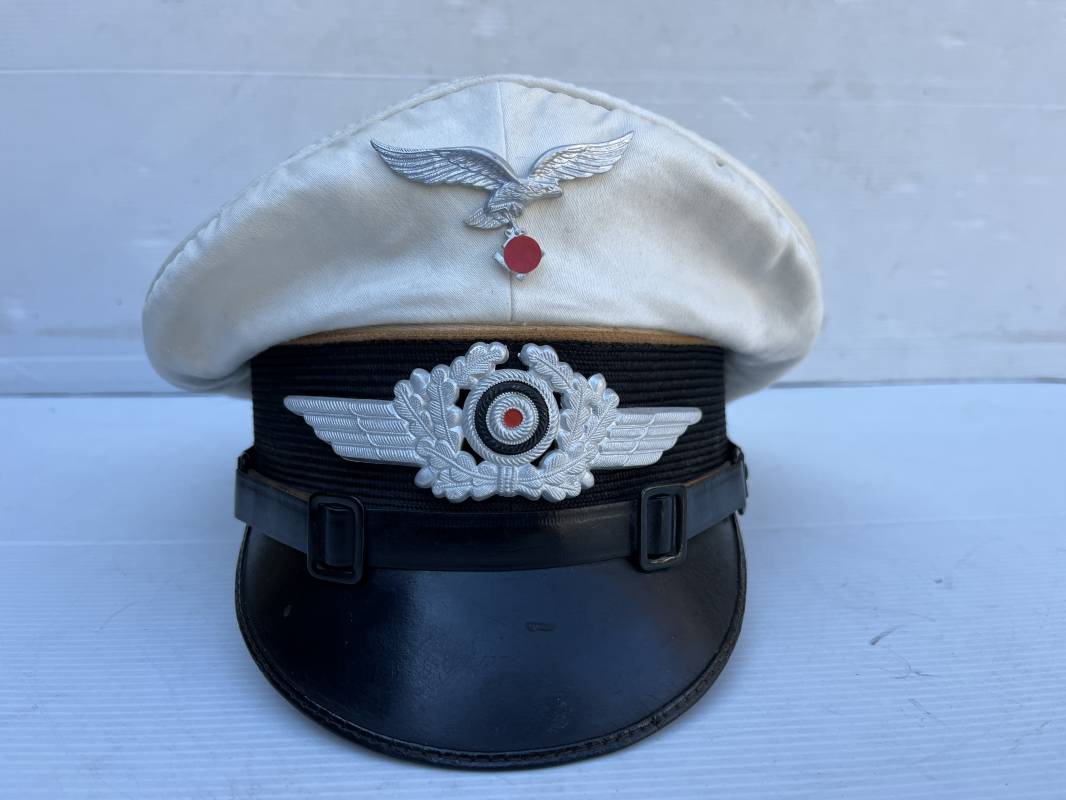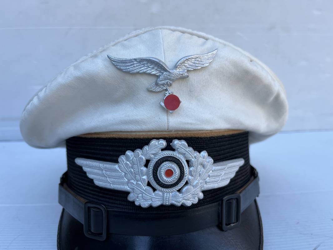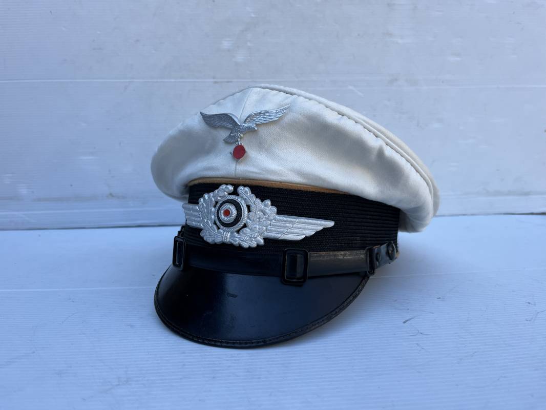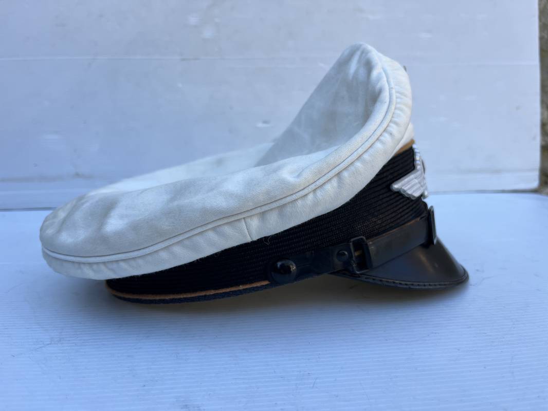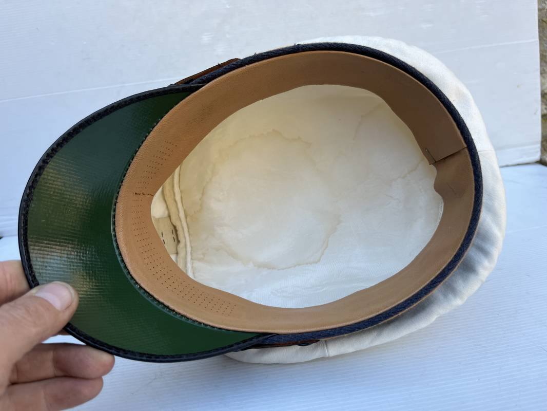 Rare casquette d'été d'un sous officier des Transmissions de la Luftwaffe. Casquette avec coiffe amovible en coton blanc. Insignes alu aigle et cocarde. Bandeau de coiffe extèrieur en coton satiné noir. Liseré marron( mordoré) des transmissions . Jugulaire en cuir vernis noire. Visière en fibre noire , revers guilloché vert et jonc sur le pourtour . Intèrieur doublé en soie blanche. Bandeau de coiffe intèrieur en cuir marron clair. Taille 59. Casquette légèrement portée en parfait état. Rare casquette d'été des transmission de la LW 1935/45. Ref 21526