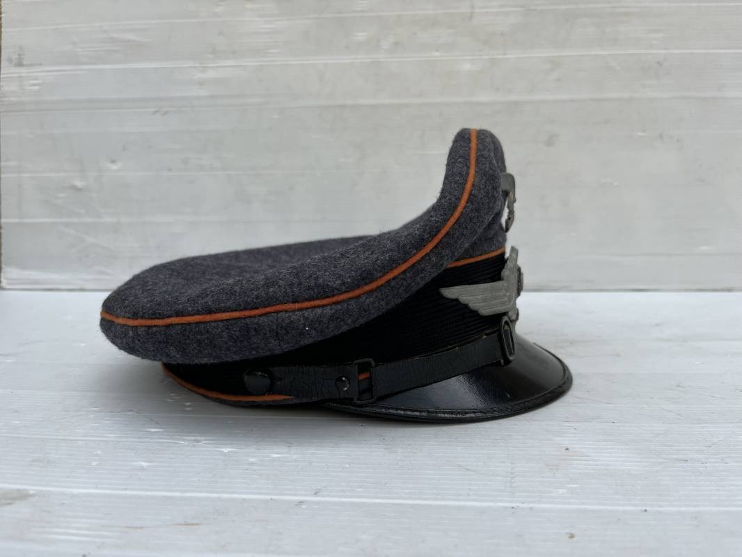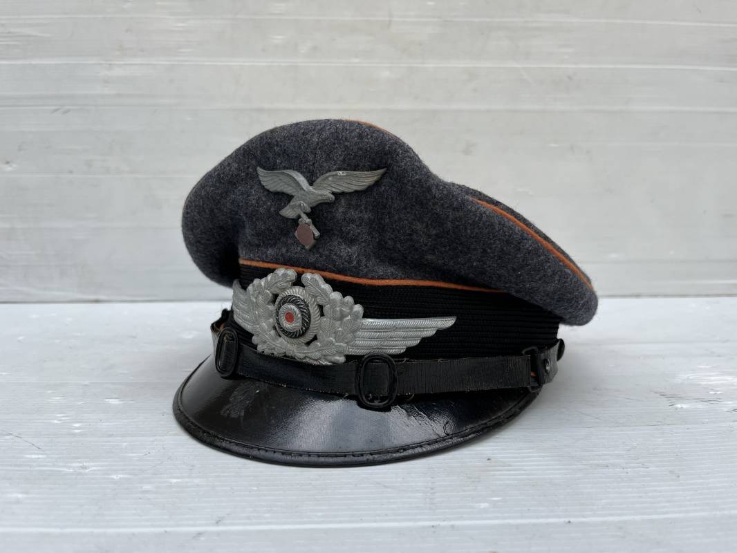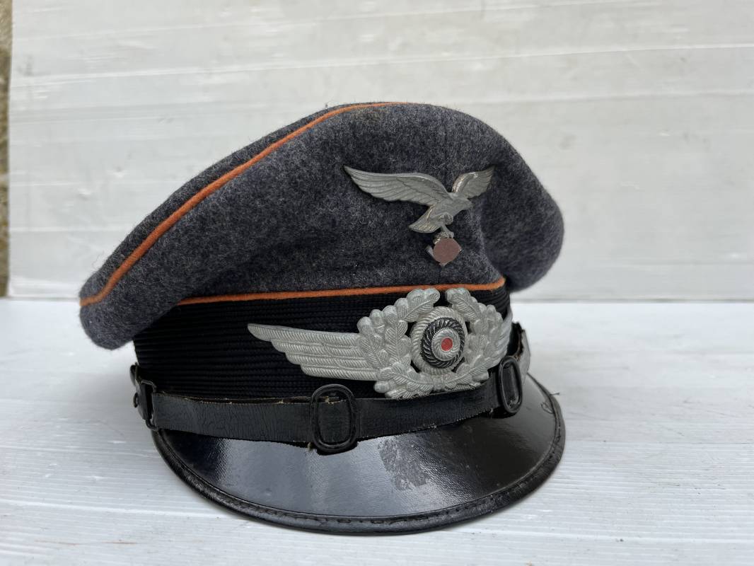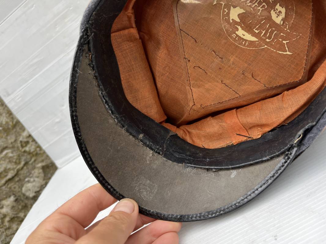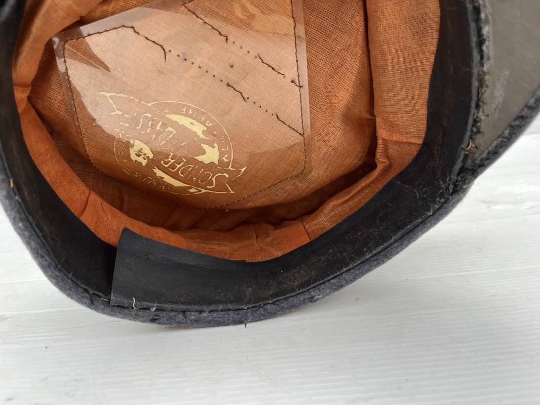 Belle casquette d'un sous officier des transmissions de la Luftwaffe . Casquette en drap gris bleu . Insignes en zinc aigle et cocarde . Aigle modele 1938 . Liseré marron des transmissions . Jugulaire en toile enduite noir verni . Bandeau de coiffe extérieur en coton rayé noir . Belle forme haute en forme de selle (sattel form) . Visière en carton noir verni sur le dessus , petit jonc . L'intérieur de la coiffe doublée en coton brun rouille rhodoid avec logo fabricant sonder Klasse . Bandeau de coiffe intérieur en carton cuir ( alkor ) marron . Taille 55 . Casquette portée en bel état . Fabrication 1943/45 Belle casquette de service d'un transmetteur de la Luftwaffe Ref 21115
