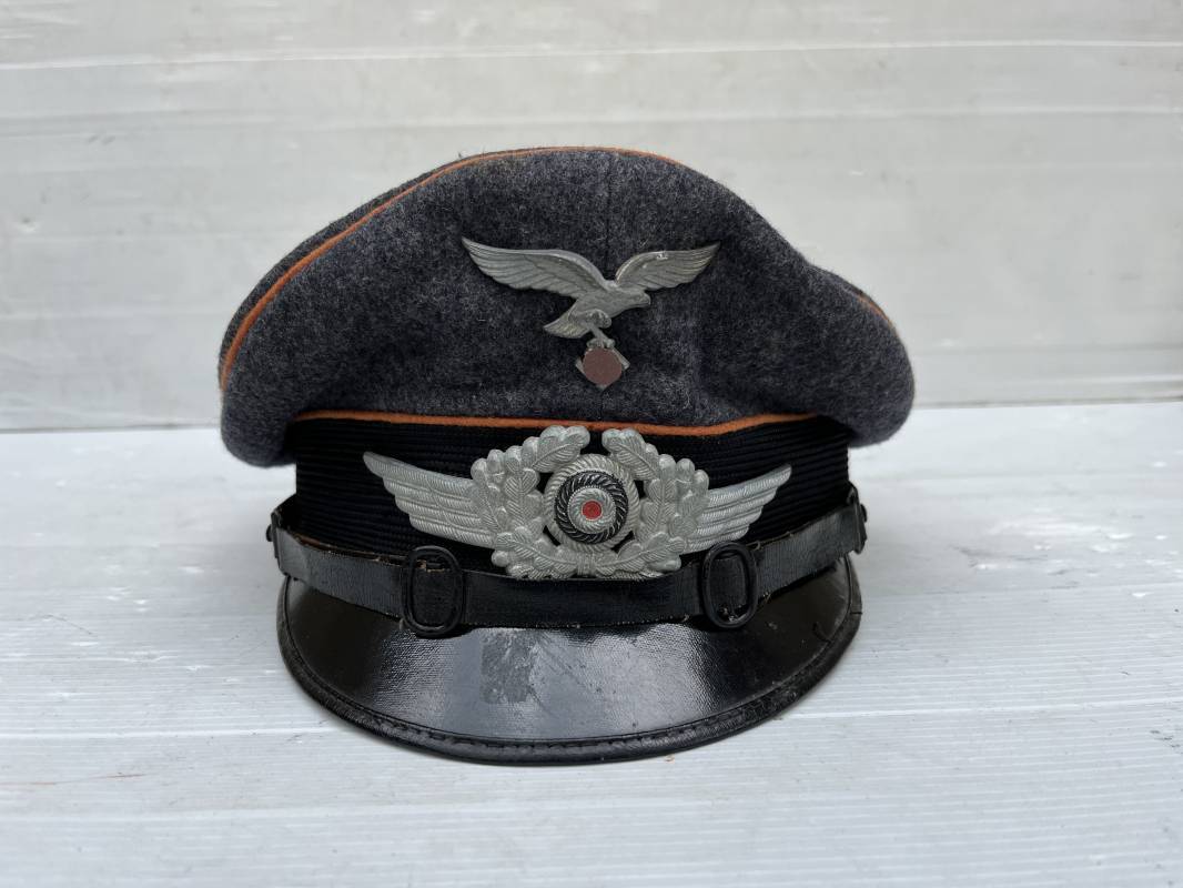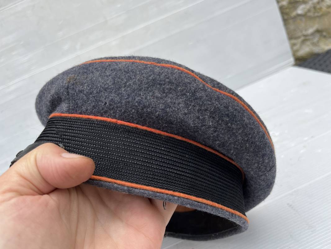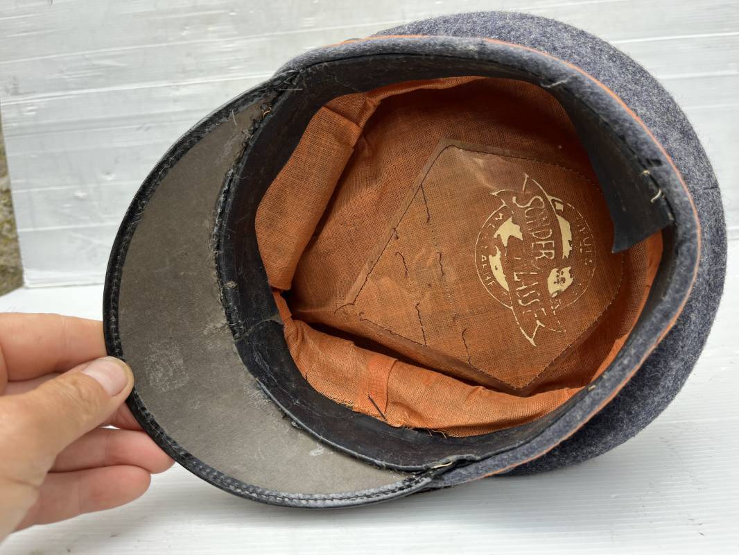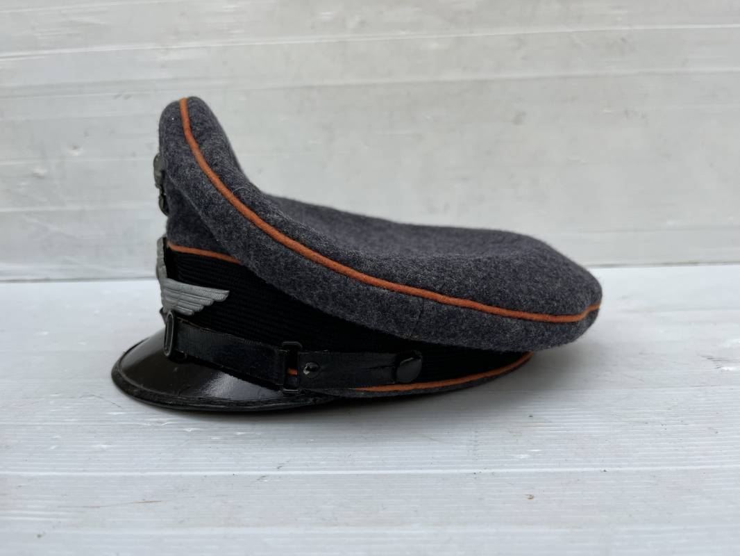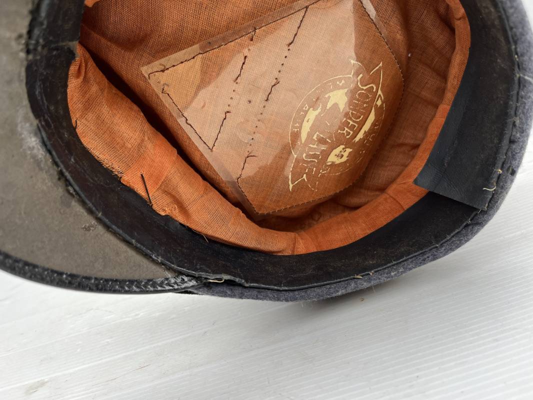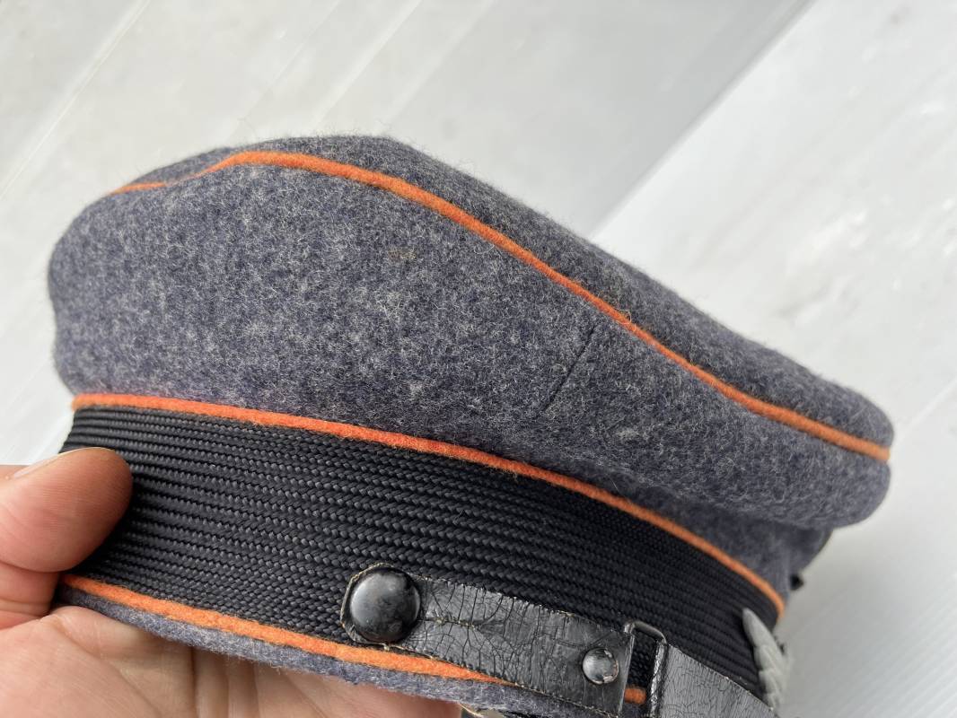 Belle casquette d'un sous officier des transmissions de la Luftwaffe . Casquette en drap gris bleu . Insignes en zinc aigle et cocarde . Aigle modele 1938 . Liseré marron des transmissions . Jugulaire en toile enduite noir verni . Bandeau de coiffe extérieur en coton rayé noir . Belle forme haute en forme de selle (sattel form) . Visière en carton noir verni sur le dessus , petit jonc . L'intérieur de la coiffe doublée en coton brun rouille rhodoid avec logo fabricant sonder Klasse . Bandeau de coiffe intérieur en carton cuir ( alkor ) marron . Taille 55 . Casquette portée en bel état . Fabrication 1943/45 Belle casquette de service d'un transmetteur de la Luftwaffe Ref 21115