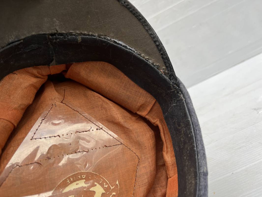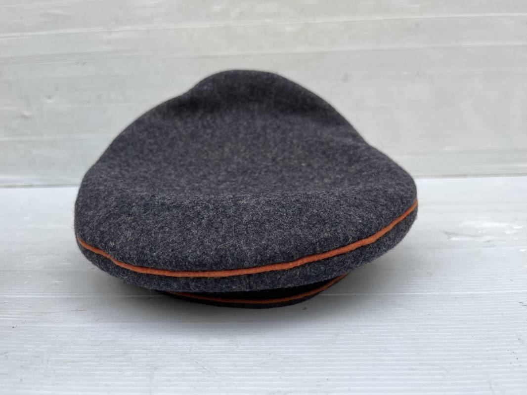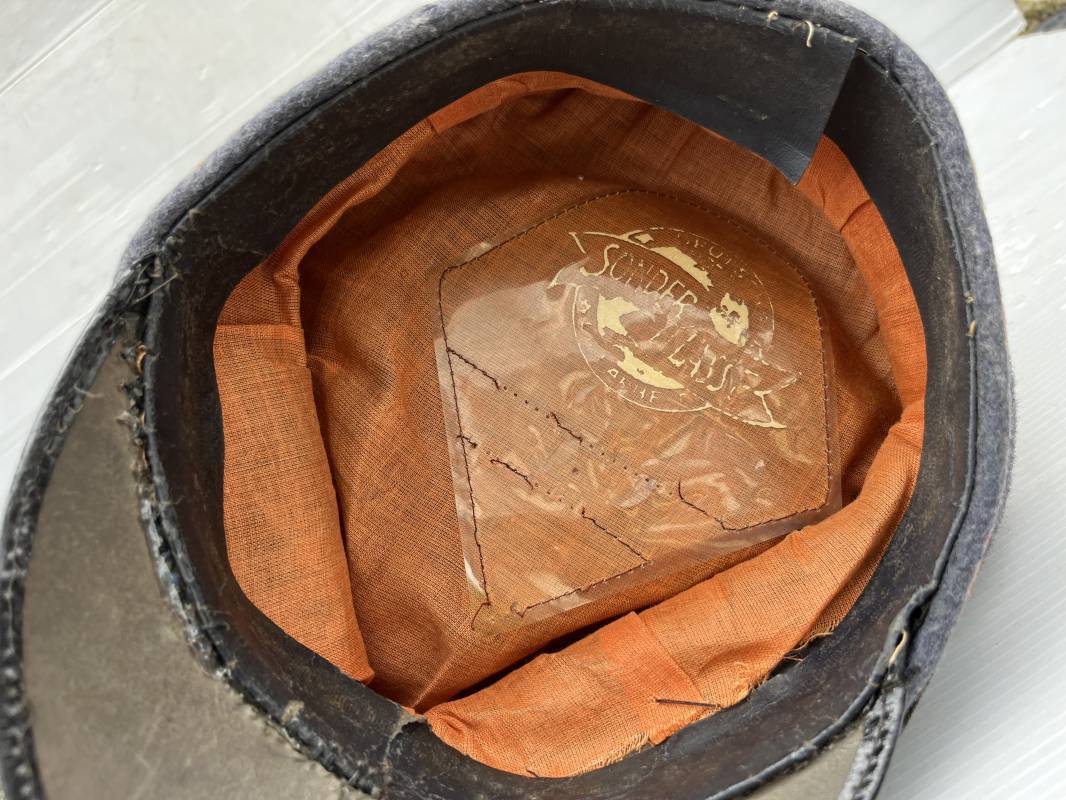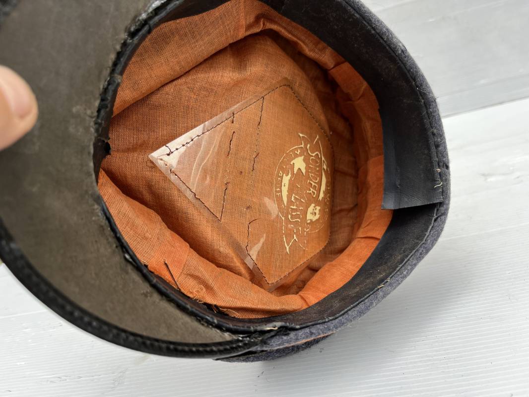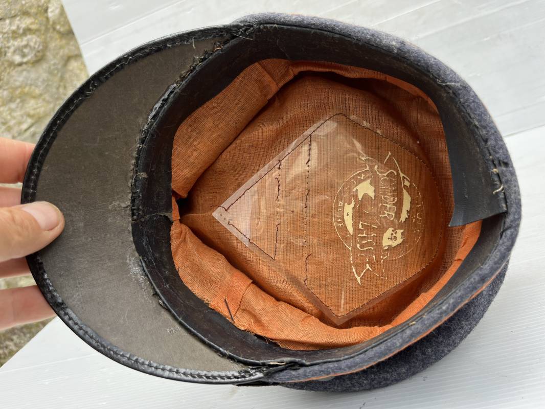 Belle casquette d'un sous officier des transmissions de la Luftwaffe . Casquette en drap gris bleu . Insignes en zinc aigle et cocarde . Aigle modele 1938 . Liseré marron des transmissions . Jugulaire en toile enduite noir verni . Bandeau de coiffe extérieur en coton rayé noir . Belle forme haute en forme de selle (sattel form) . Visière en carton noir verni sur le dessus , petit jonc . L'intérieur de la coiffe doublée en coton brun rouille rhodoid avec logo fabricant sonder Klasse . Bandeau de coiffe intérieur en carton cuir ( alkor ) marron . Taille 55 . Casquette portée en bel état . Fabrication 1943/45 Belle casquette de service d'un transmetteur de la Luftwaffe Ref 21115
