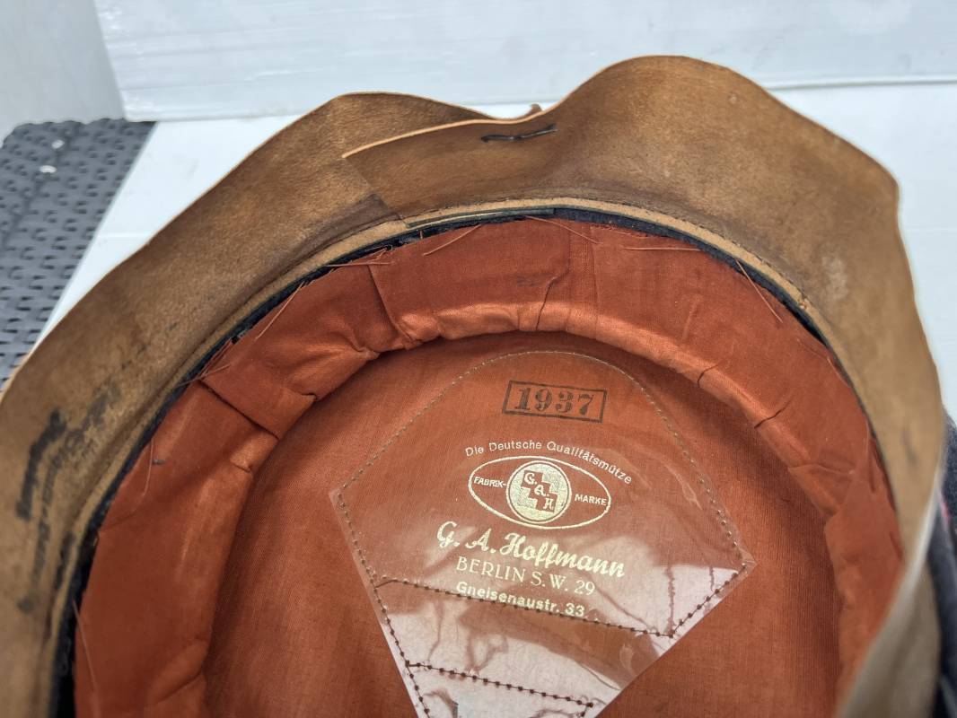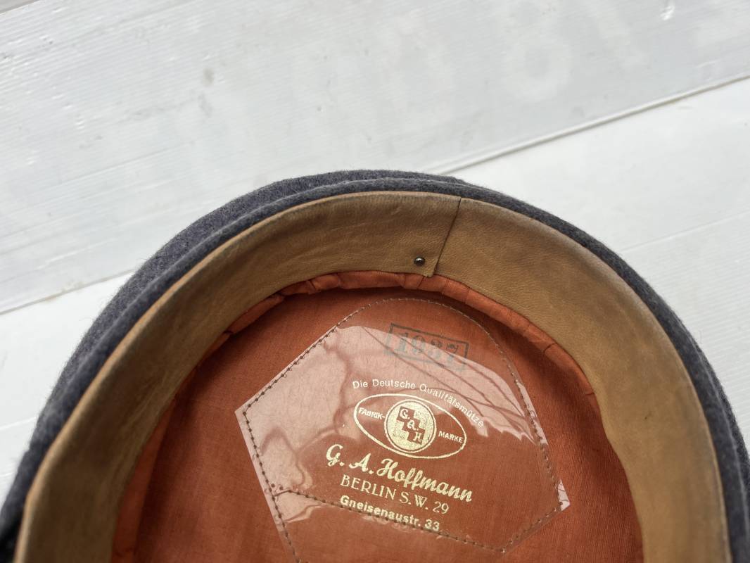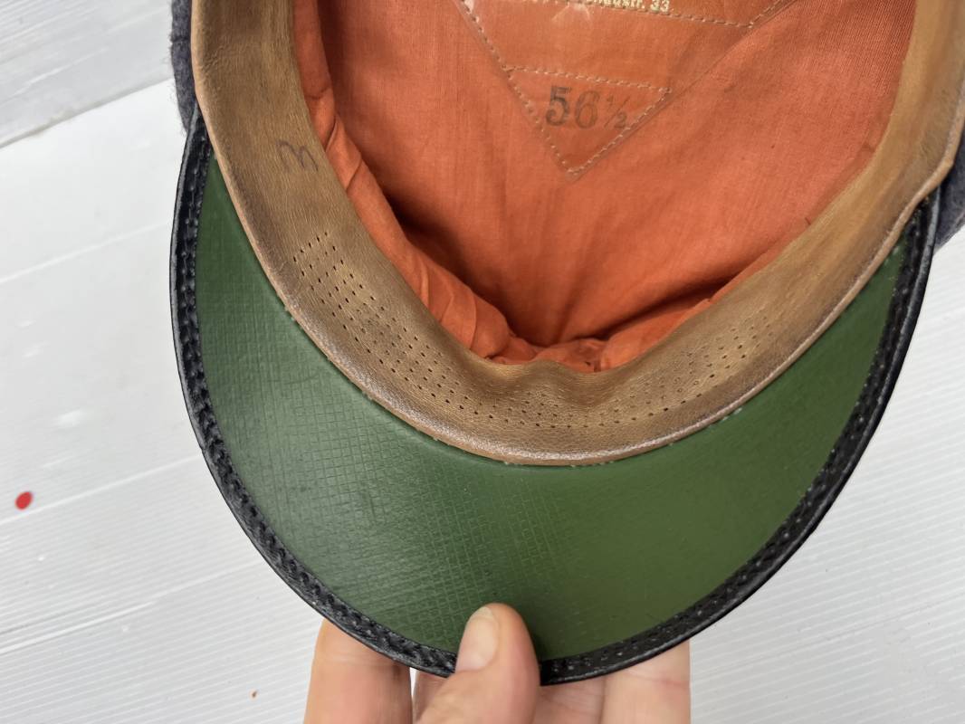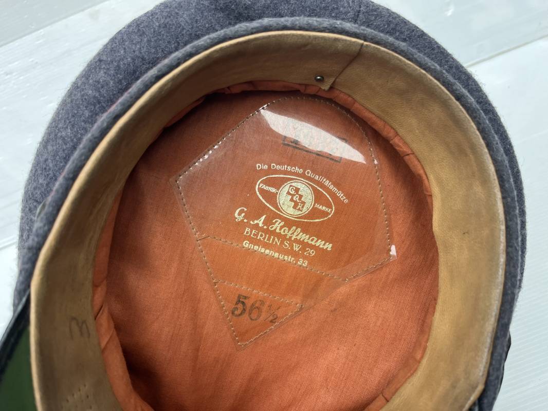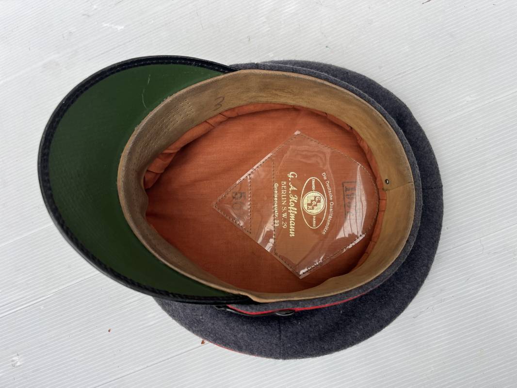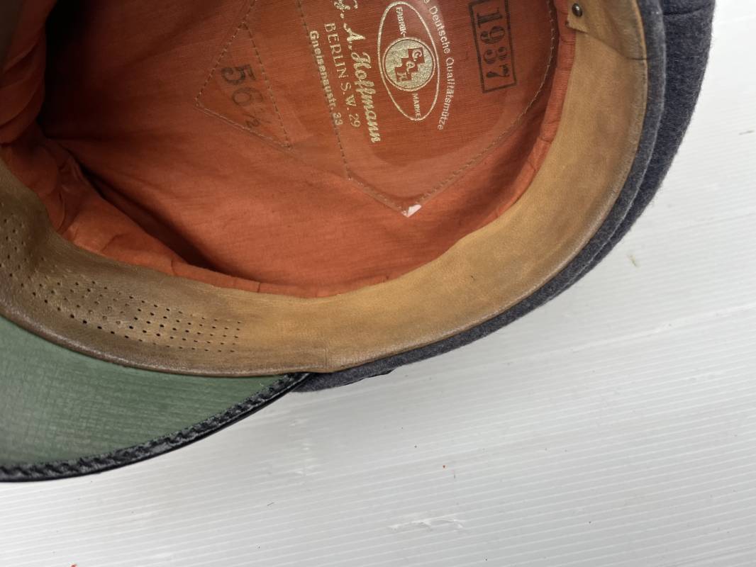 Trés belle casquette d'un sous officier de l artillerie de la Luftwaffe. Casquette en drap gris/bleu, liseré rouge de l'Artillerie. Belle forme (Sattel Form). Insignes en zinc : aigle modéle 1938 et cocarde. Bandeau de coiffe extérieur en coton satiné noir. Jugulaire en cuir vernis noir. Visière en fibre vulcanisée noire. Revers guilloché vert. Jonc sur le pourtour. Intèrieur doublé en coton brun rouille . Rhodoid avec marquage fabricant en fond : 'G. A. Hoffmann Berlin 1937 ' et logo. Bandeau de coiffe intèrieur en cuir marron , taille 56 &:é , Casquette légèrement portée en parfait état . Ref 19872