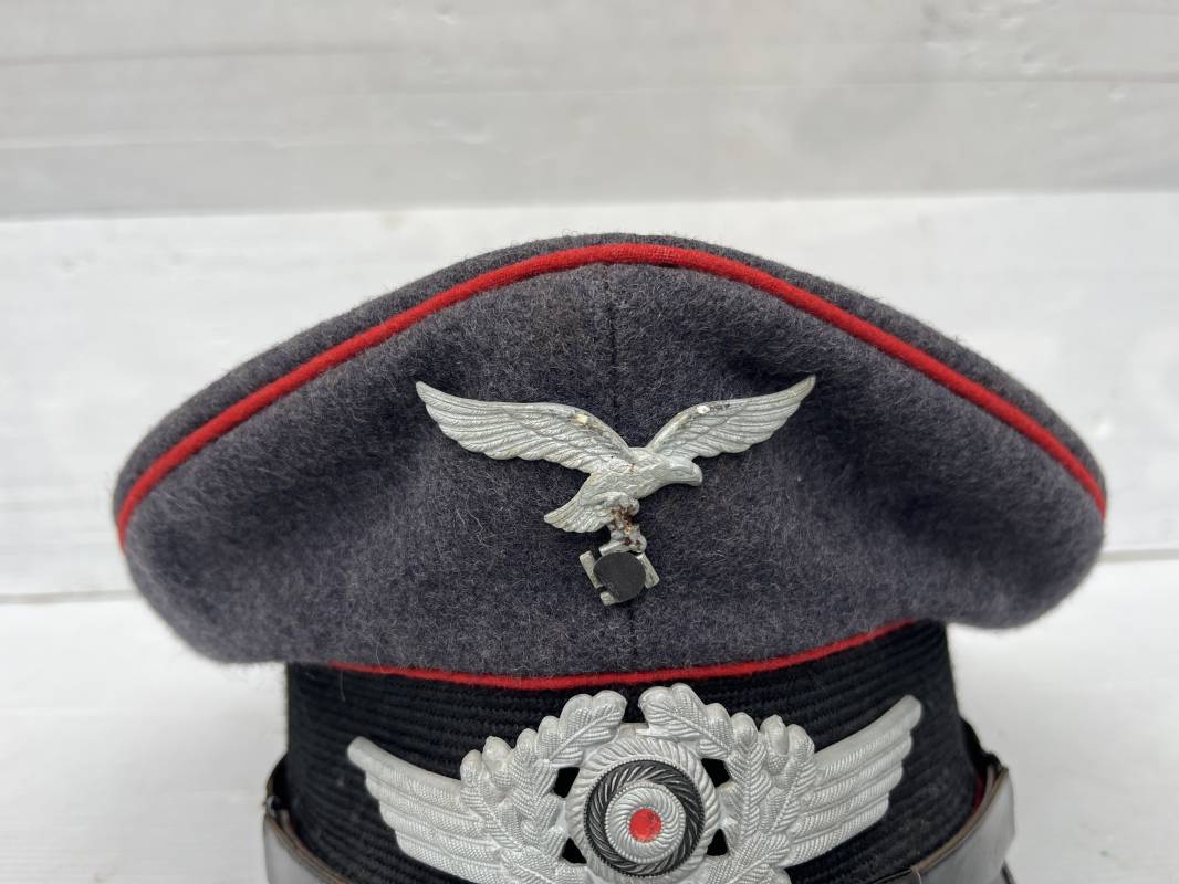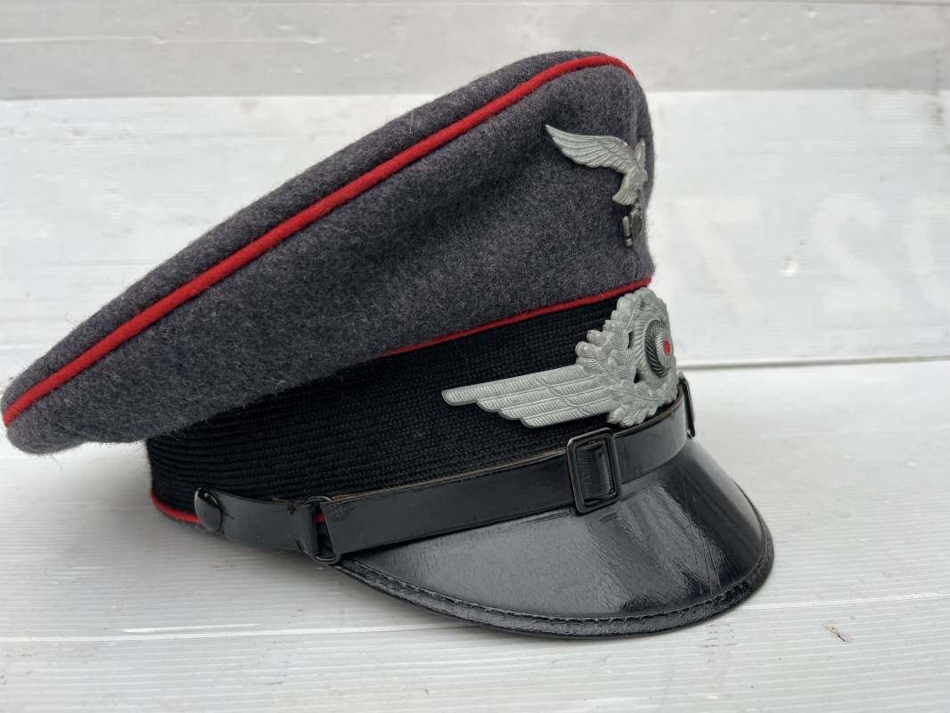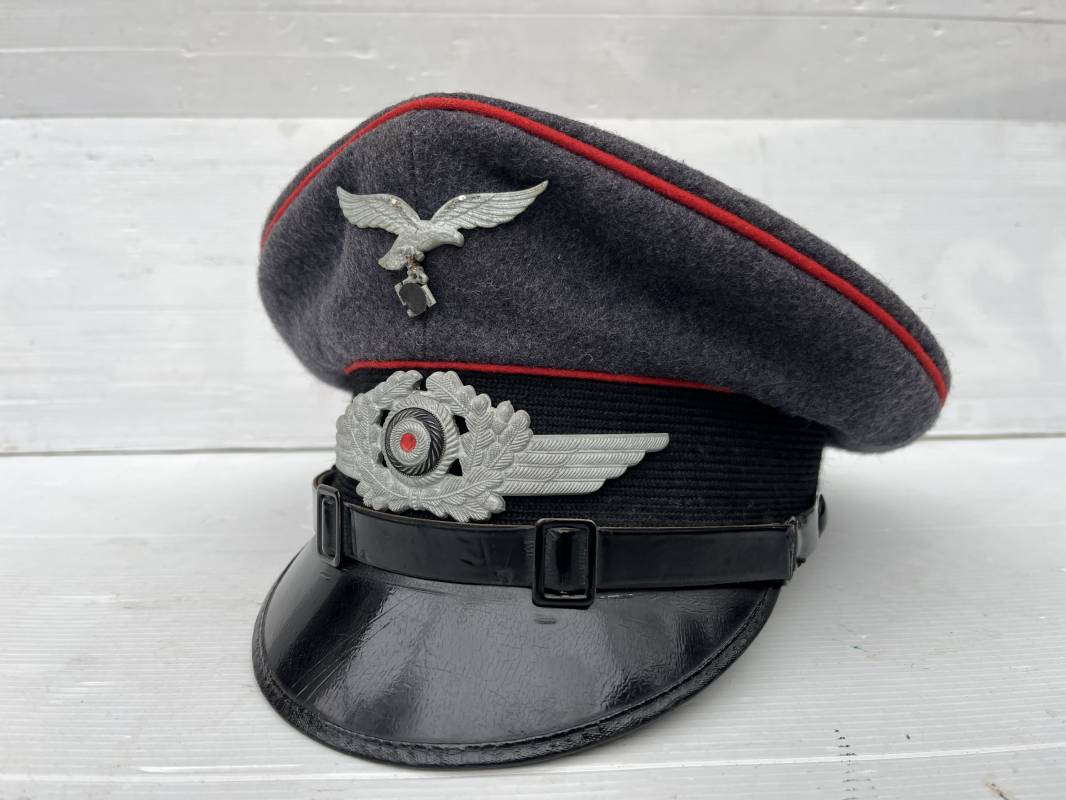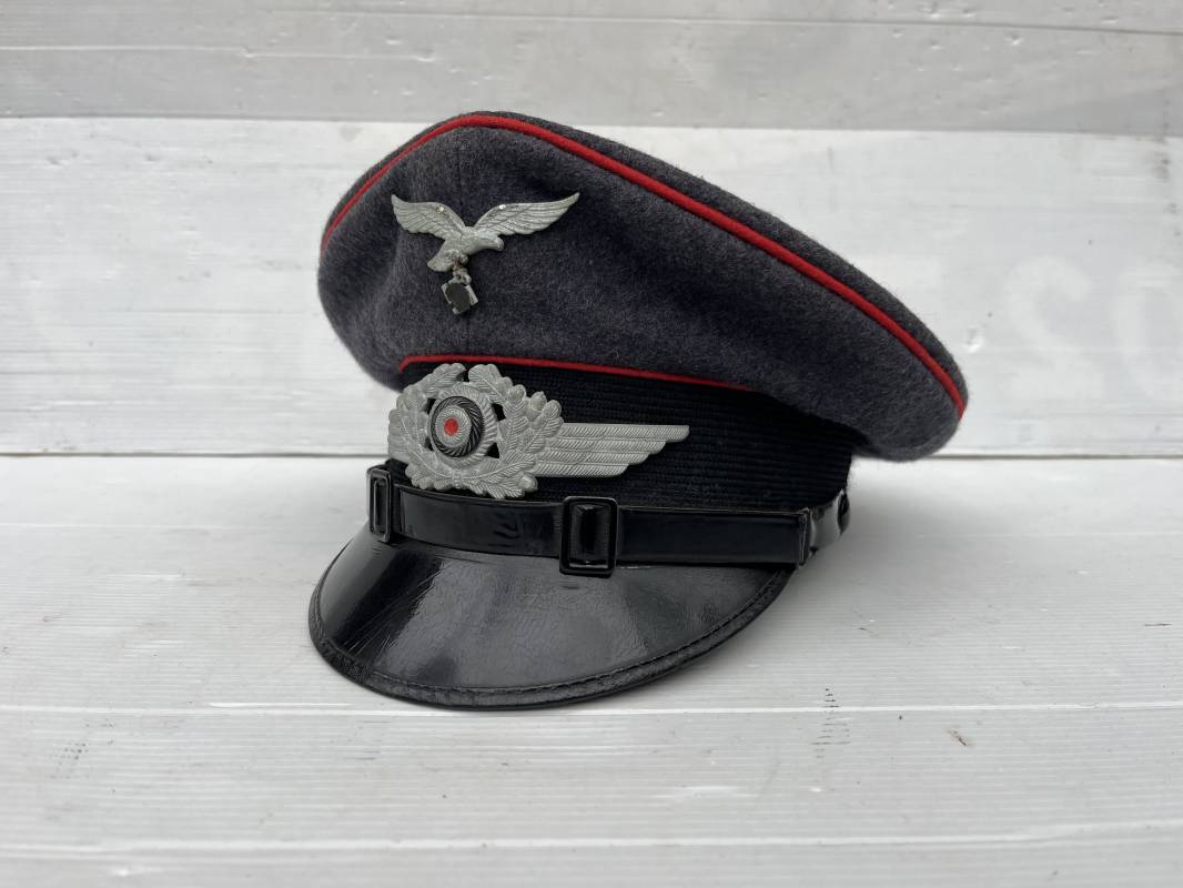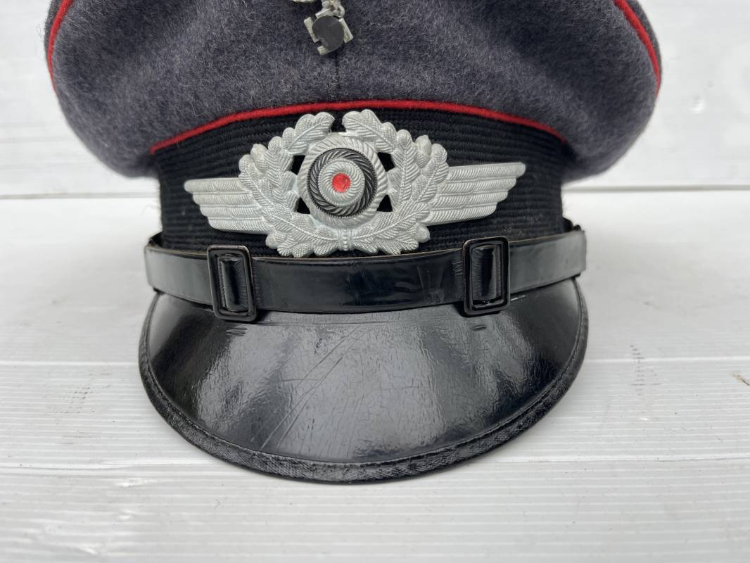 Trés belle casquette d'un sous officier de l artillerie de la Luftwaffe. Casquette en drap gris/bleu, liseré rouge de l'Artillerie. Belle forme (Sattel Form). Insignes en zinc : aigle modéle 1938 et cocarde. Bandeau de coiffe extérieur en coton satiné noir. Jugulaire en cuir vernis noir. Visière en fibre vulcanisée noire. Revers guilloché vert. Jonc sur le pourtour. Intèrieur doublé en coton brun rouille . Rhodoid avec marquage fabricant en fond : 'G. A. Hoffmann Berlin 1937 ' et logo. Bandeau de coiffe intèrieur en cuir marron , taille 56 &:é , Casquette légèrement portée en parfait état . Ref 19872