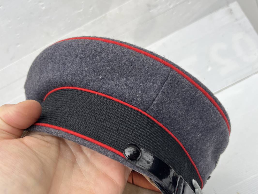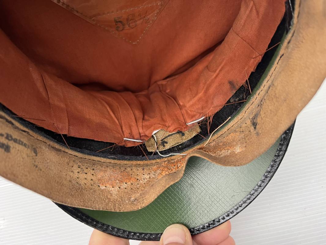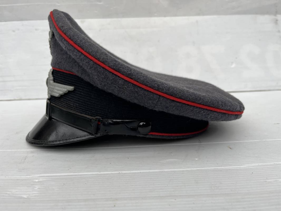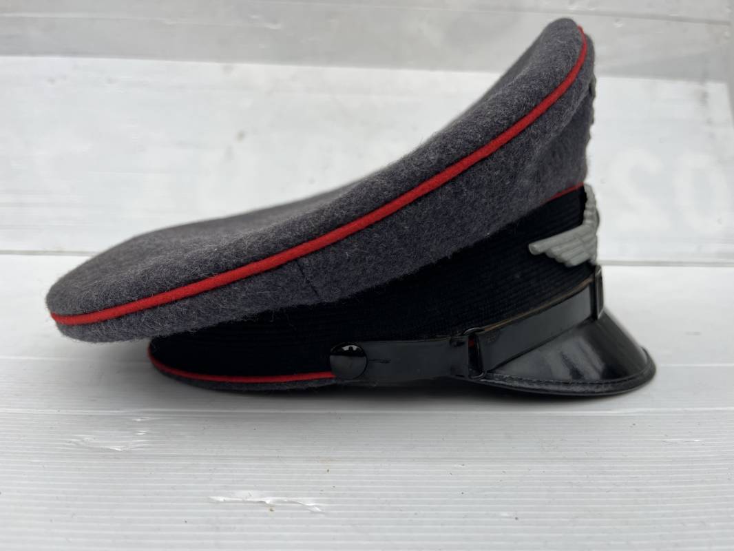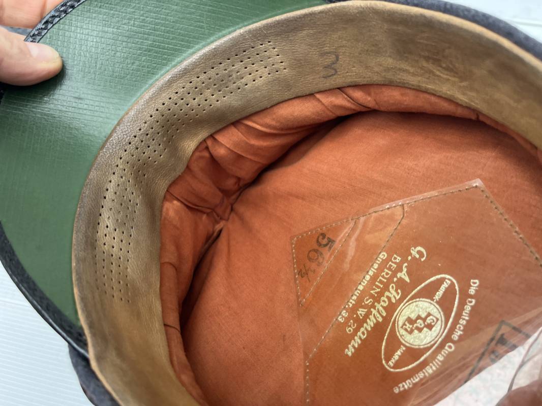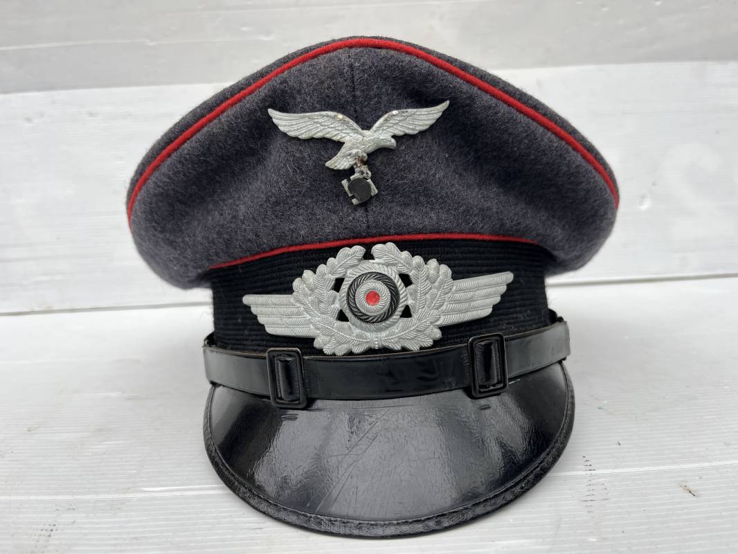 Trés belle casquette d'un sous officier de l artillerie de la Luftwaffe. Casquette en drap gris/bleu, liseré rouge de l'Artillerie. Belle forme (Sattel Form). Insignes en zinc : aigle modéle 1938 et cocarde. Bandeau de coiffe extérieur en coton satiné noir. Jugulaire en cuir vernis noir. Visière en fibre vulcanisée noire. Revers guilloché vert. Jonc sur le pourtour. Intèrieur doublé en coton brun rouille . Rhodoid avec marquage fabricant en fond : 'G. A. Hoffmann Berlin 1937 ' et logo. Bandeau de coiffe intèrieur en cuir marron , taille 56 &:é , Casquette légèrement portée en parfait état . Ref 19872