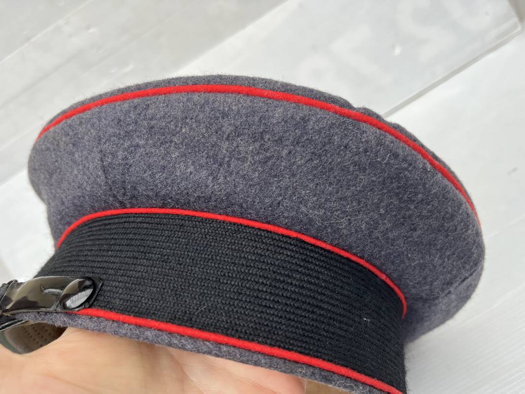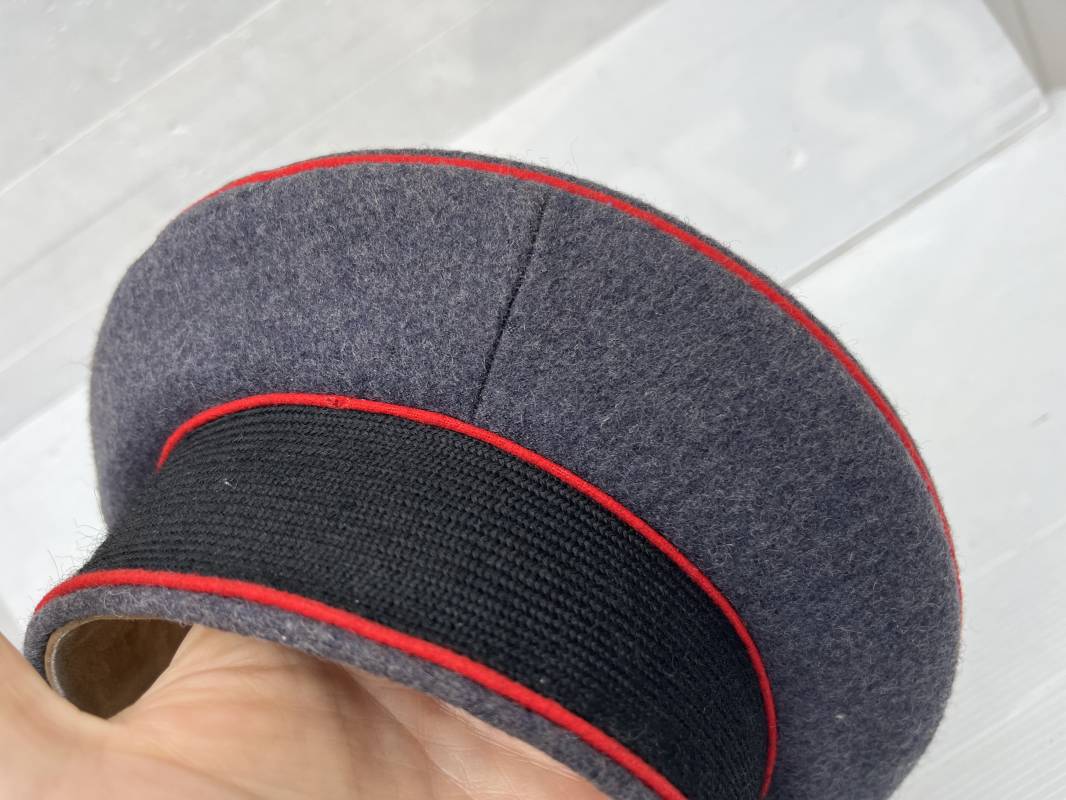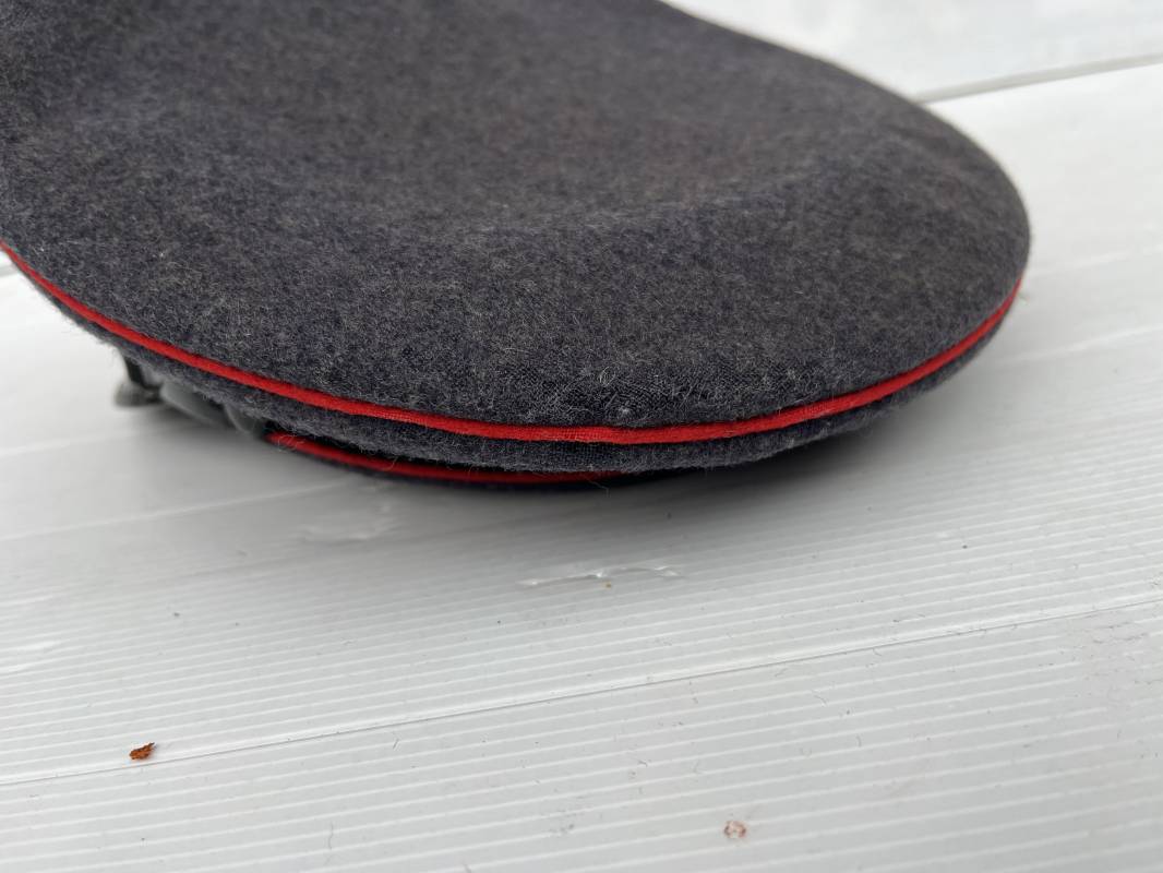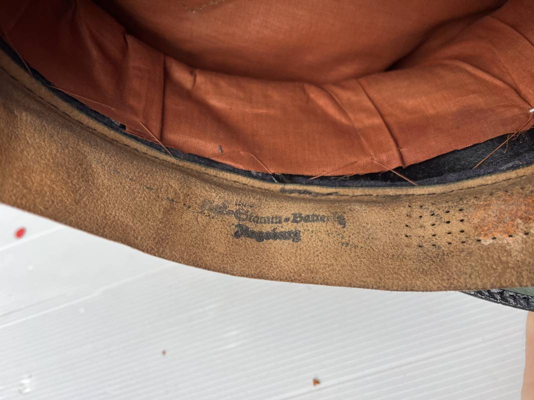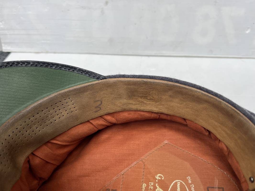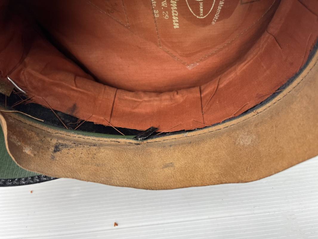 Trés belle casquette d'un sous officier de l artillerie de la Luftwaffe. Casquette en drap gris/bleu, liseré rouge de l'Artillerie. Belle forme (Sattel Form). Insignes en zinc : aigle modéle 1938 et cocarde. Bandeau de coiffe extérieur en coton satiné noir. Jugulaire en cuir vernis noir. Visière en fibre vulcanisée noire. Revers guilloché vert. Jonc sur le pourtour. Intèrieur doublé en coton brun rouille . Rhodoid avec marquage fabricant en fond : 'G. A. Hoffmann Berlin 1937 ' et logo. Bandeau de coiffe intèrieur en cuir marron , taille 56 &:é , Casquette légèrement portée en parfait état . Ref 19872