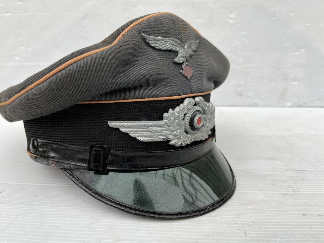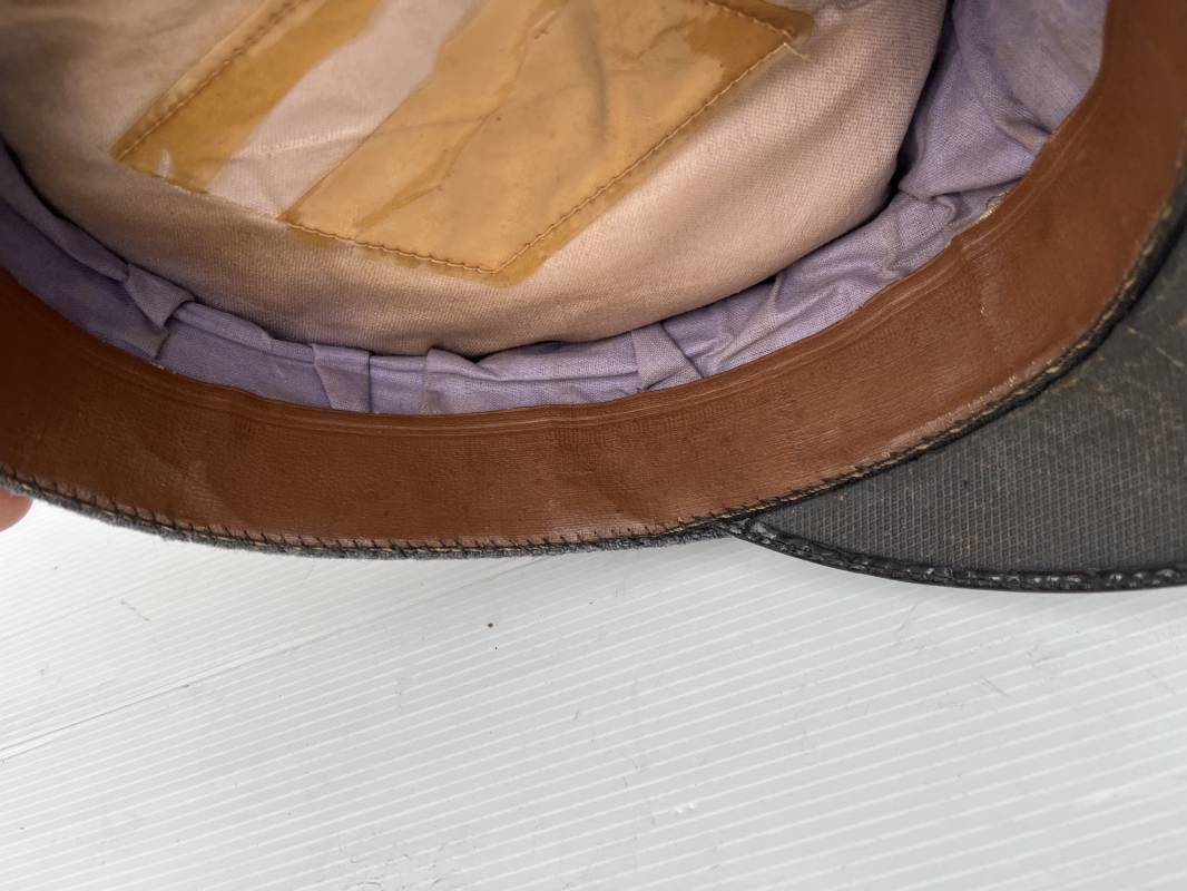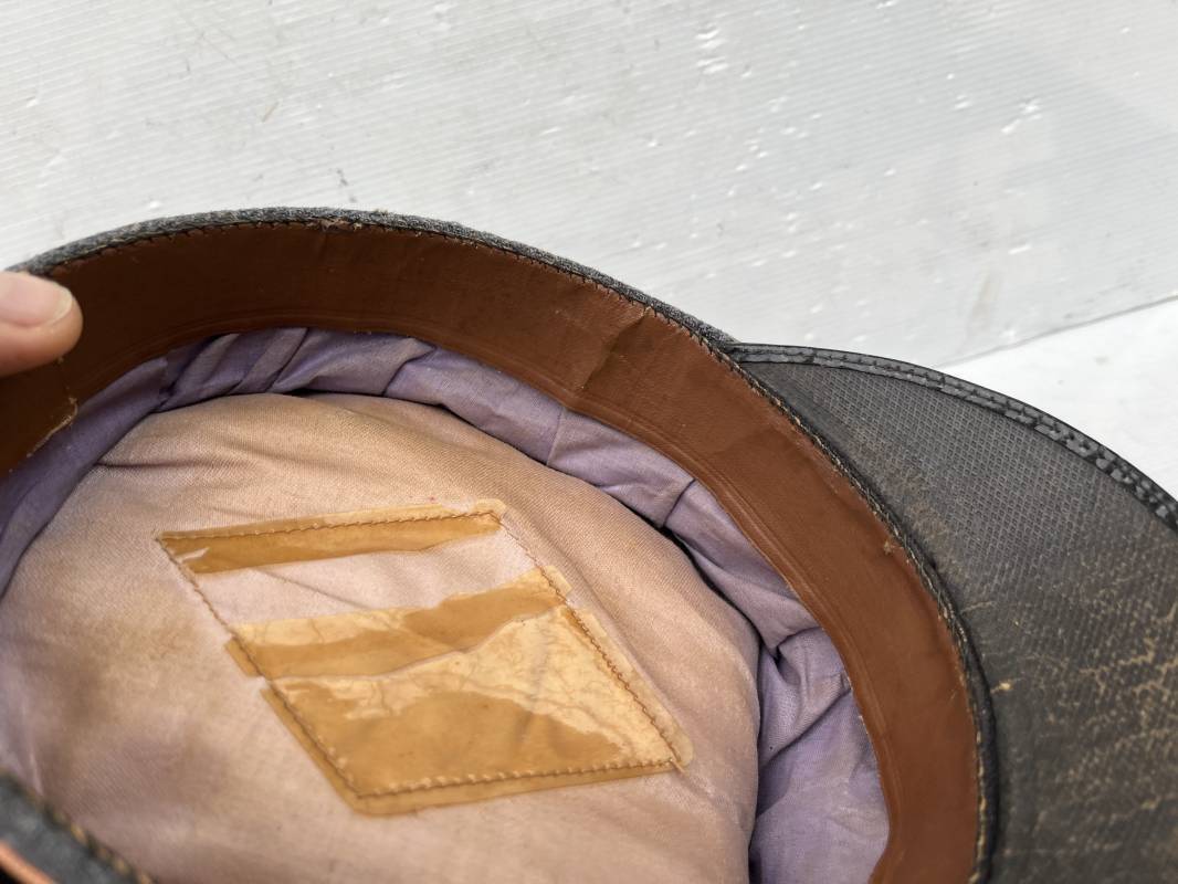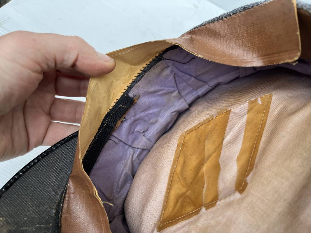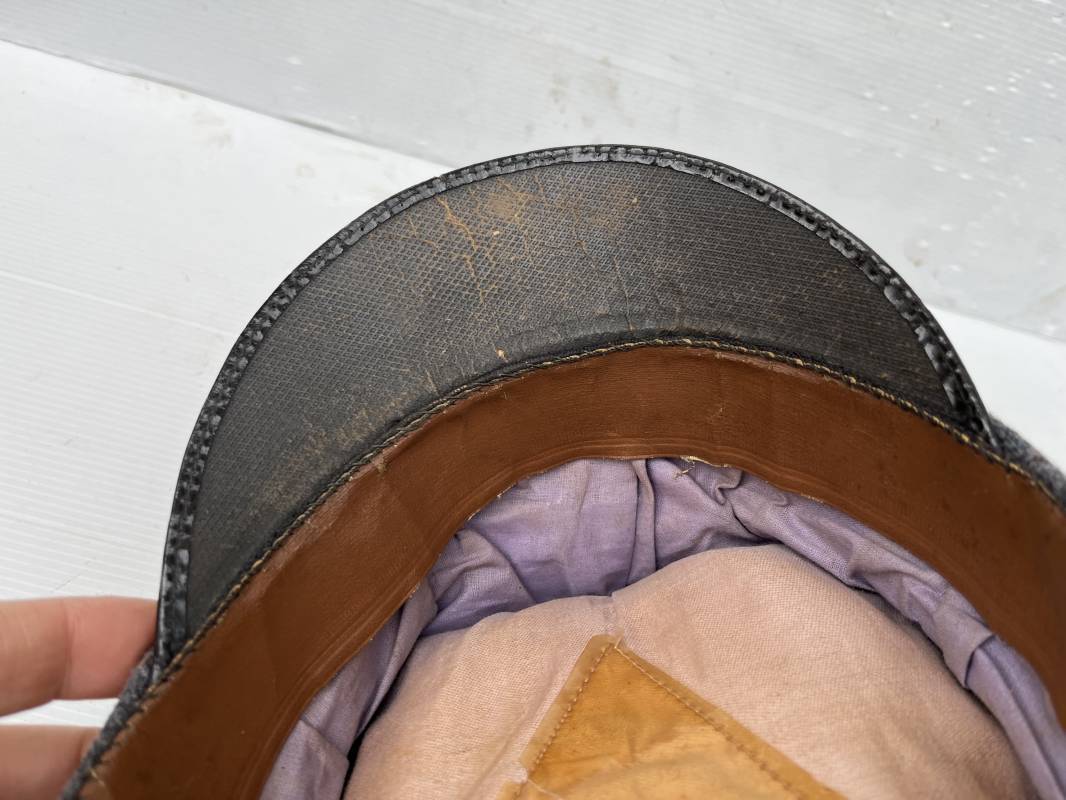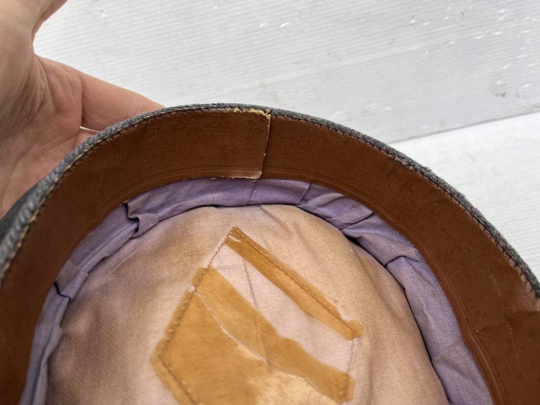 Belle casquette d'un sous officier des transmissions de la Luftwaffe . Casquette en toile de coton gris bleu . Insignes en zinc aigle et cocarde . Aigle modele 1938 . Liseré marron des transmissions . Jugulaire en carton cuir noir verni . Bandeau de coiffe extérieur en coton rayé noir . Belle forme (sattel form) .Rare coiffe en toile de coton gris bleu . Visière en carton noir vernis sur le dessus , petit jonc . L'intérieur de la coiffe doublée en coton gris violacé rhodoid en forme de losange ( a noté petit manque ) . Bandeau de coiffe intérieur en carton cuir ( alkor ) marron . Taille 56 . Casquette portée en bel état . Fabrication fin de guerre 1943/45 Belle casquette de service d'un transmetteur de la Luftwaffe Ref 19731