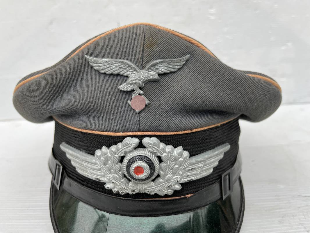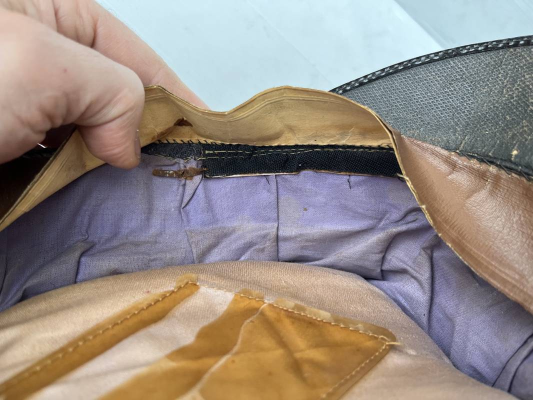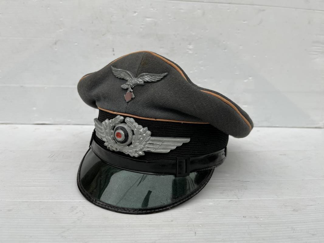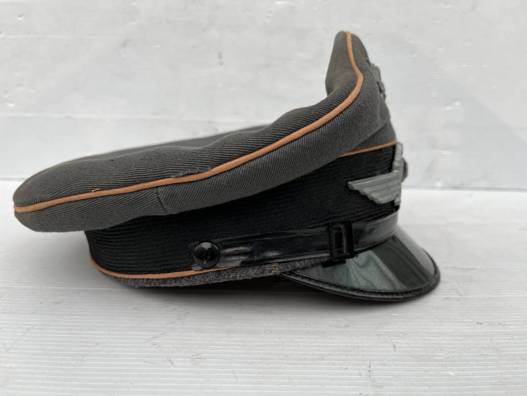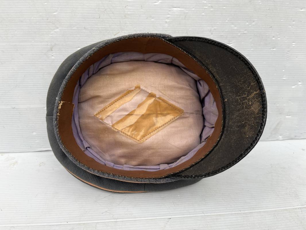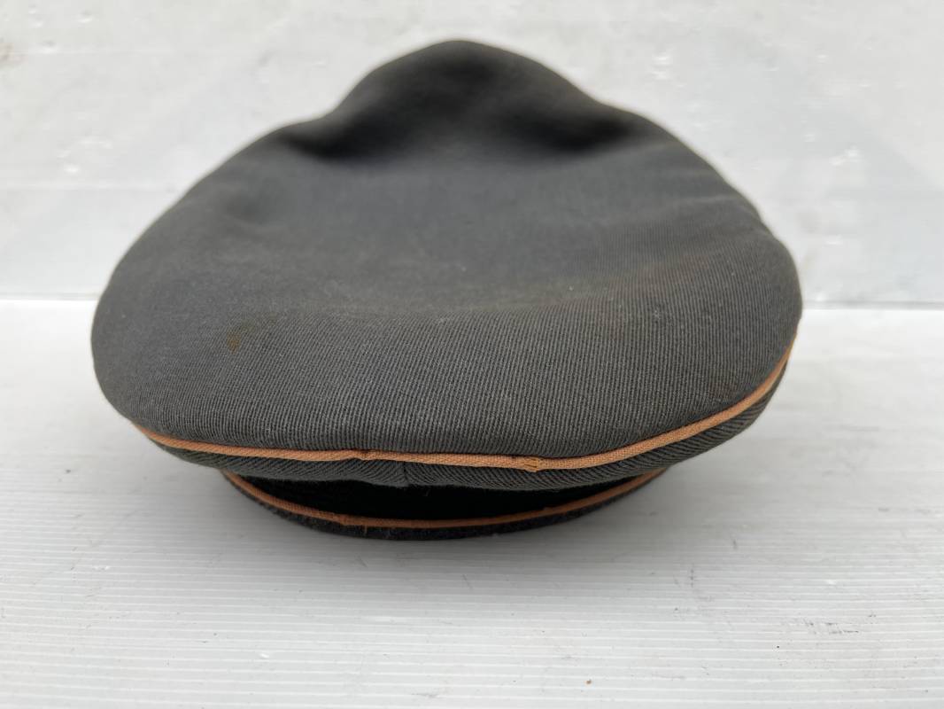 Belle casquette d'un sous officier des transmissions de la Luftwaffe . Casquette en toile de coton gris bleu . Insignes en zinc aigle et cocarde . Aigle modele 1938 . Liseré marron des transmissions . Jugulaire en carton cuir noir verni . Bandeau de coiffe extérieur en coton rayé noir . Belle forme (sattel form) .Rare coiffe en toile de coton gris bleu . Visière en carton noir vernis sur le dessus , petit jonc . L'intérieur de la coiffe doublée en coton gris violacé rhodoid en forme de losange ( a noté petit manque ) . Bandeau de coiffe intérieur en carton cuir ( alkor ) marron . Taille 56 . Casquette portée en bel état . Fabrication fin de guerre 1943/45 Belle casquette de service d'un transmetteur de la Luftwaffe Ref 19731