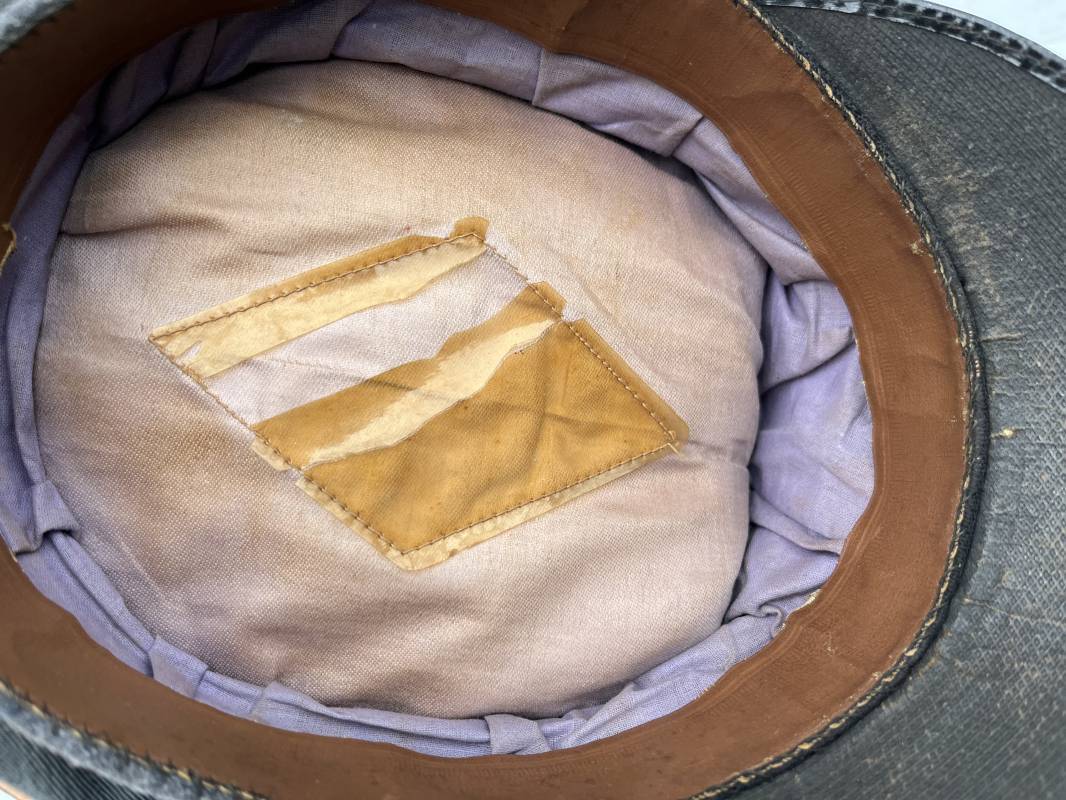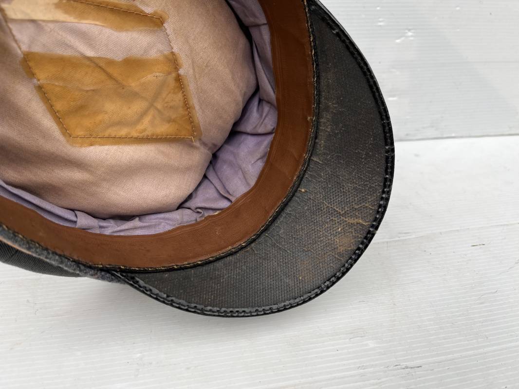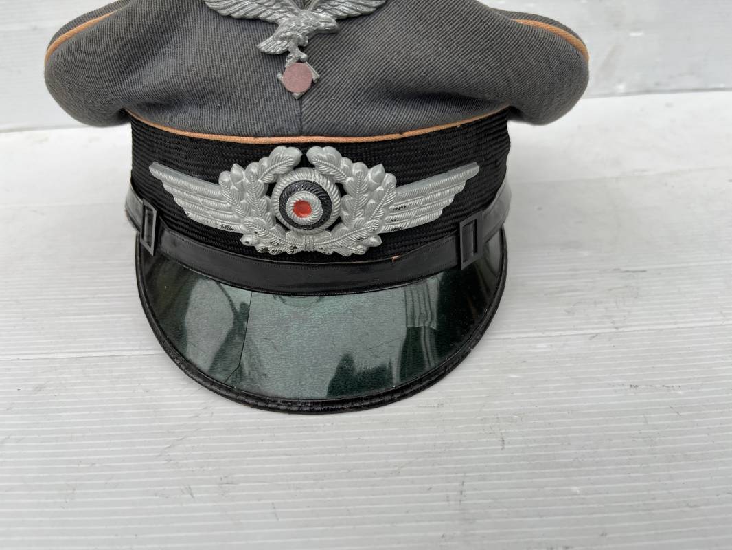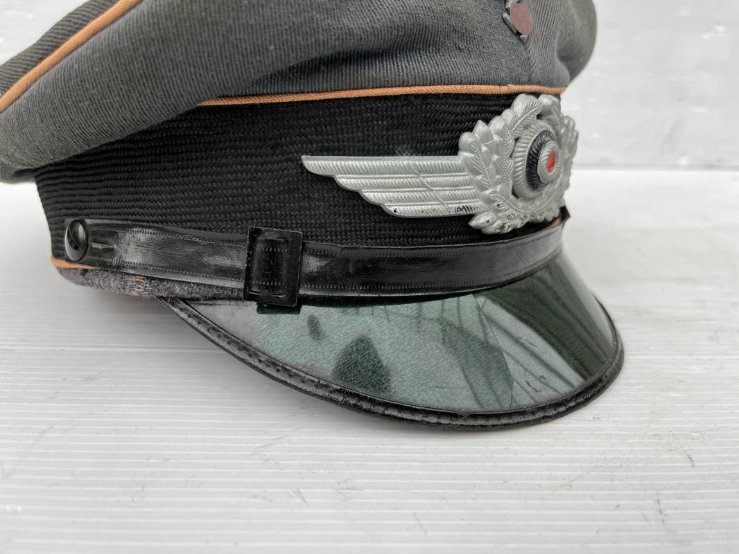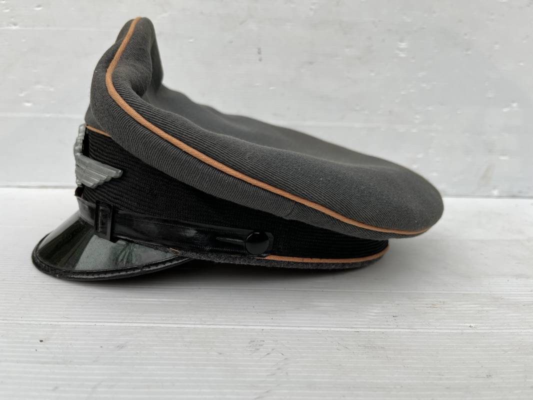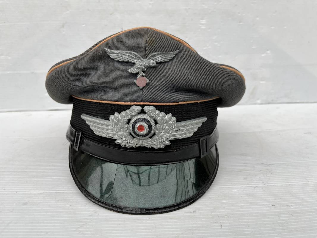 Belle casquette d'un sous officier des transmissions de la Luftwaffe . Casquette en toile de coton gris bleu . Insignes en zinc aigle et cocarde . Aigle modele 1938 . Liseré marron des transmissions . Jugulaire en carton cuir noir verni . Bandeau de coiffe extérieur en coton rayé noir . Belle forme (sattel form) .Rare coiffe en toile de coton gris bleu . Visière en carton noir vernis sur le dessus , petit jonc . L'intérieur de la coiffe doublée en coton gris violacé rhodoid en forme de losange ( a noté petit manque ) . Bandeau de coiffe intérieur en carton cuir ( alkor ) marron . Taille 56 . Casquette portée en bel état . Fabrication fin de guerre 1943/45 Belle casquette de service d'un transmetteur de la Luftwaffe Ref 19731