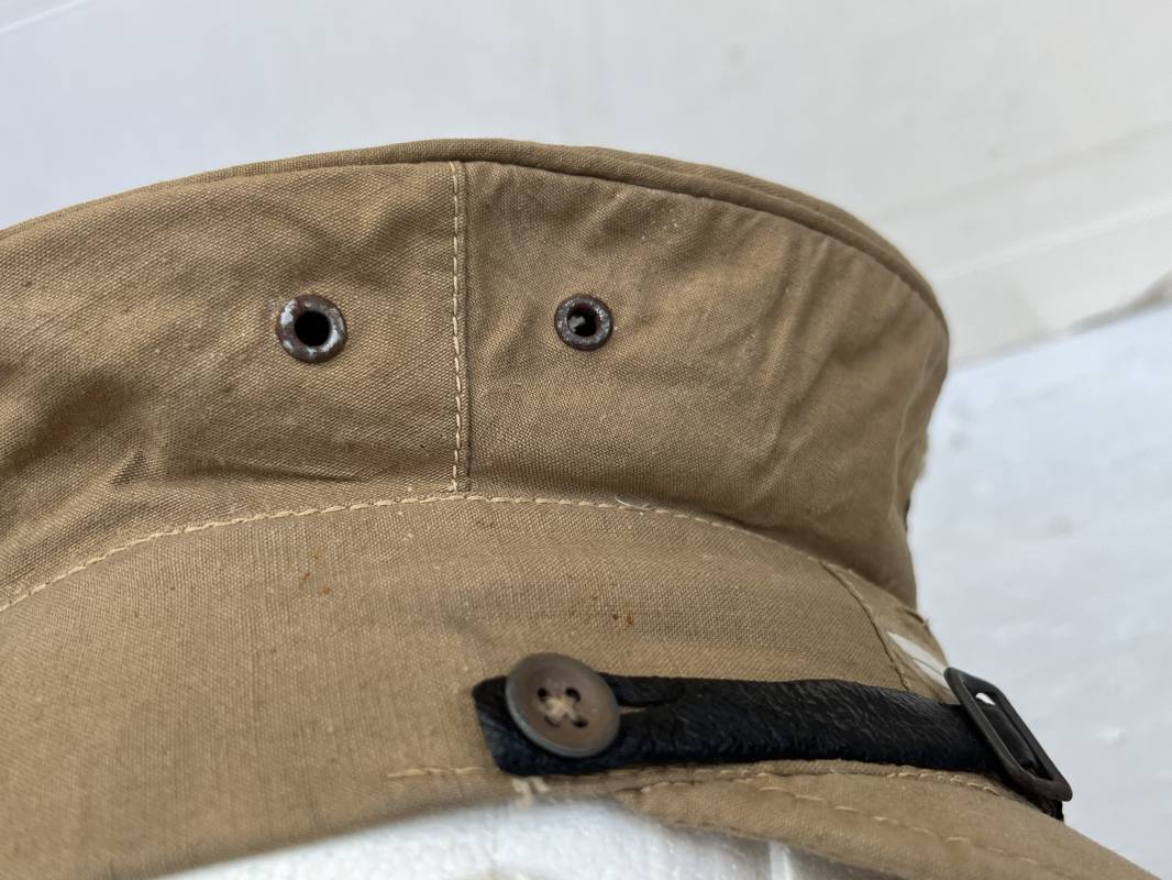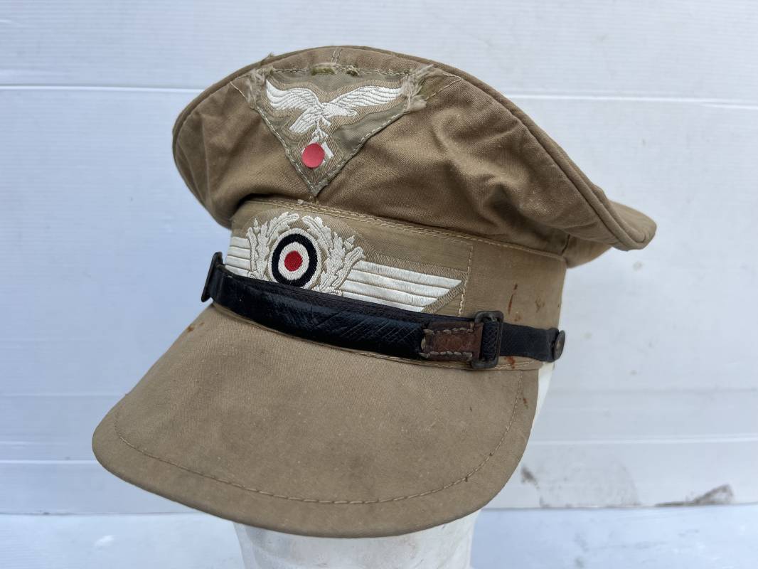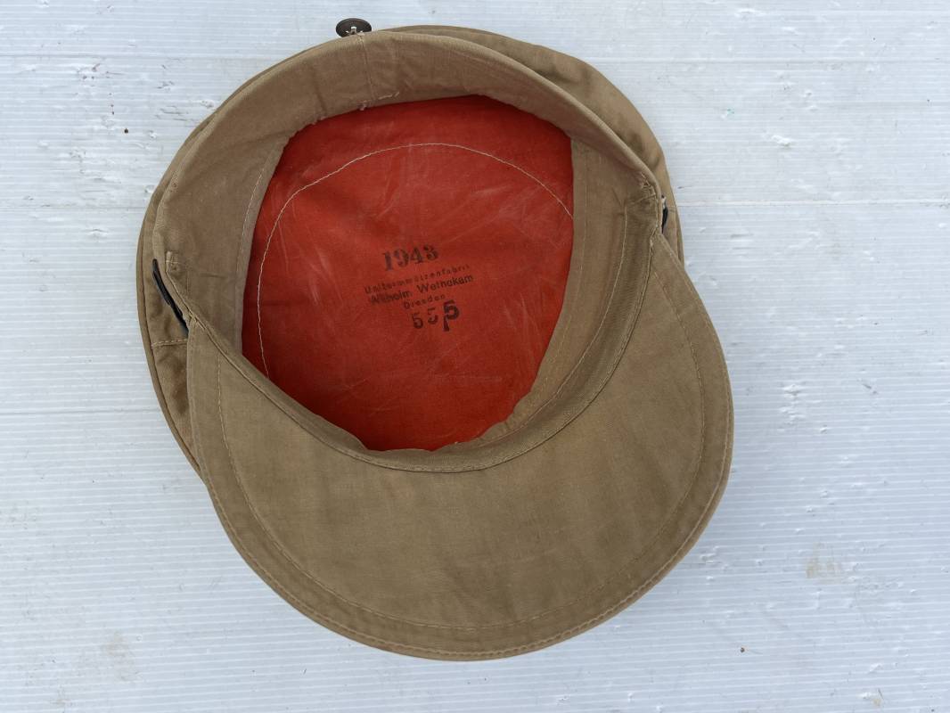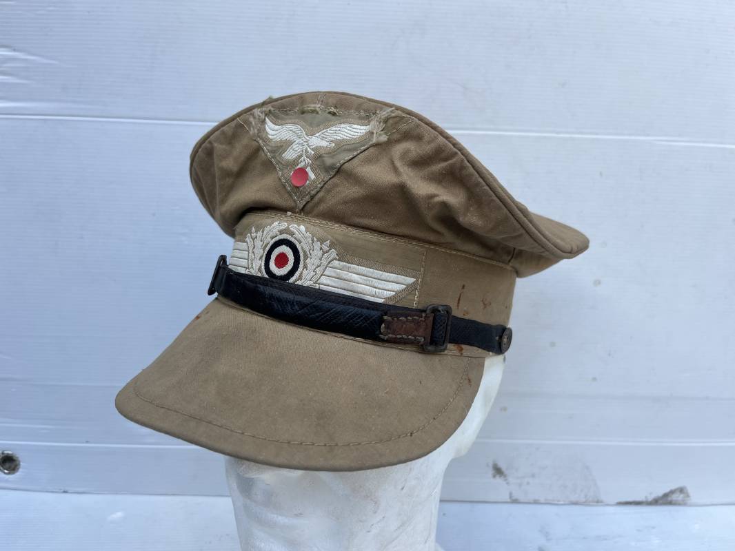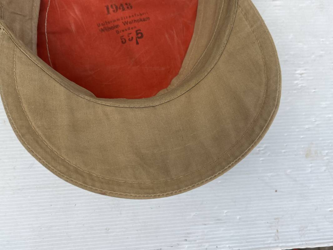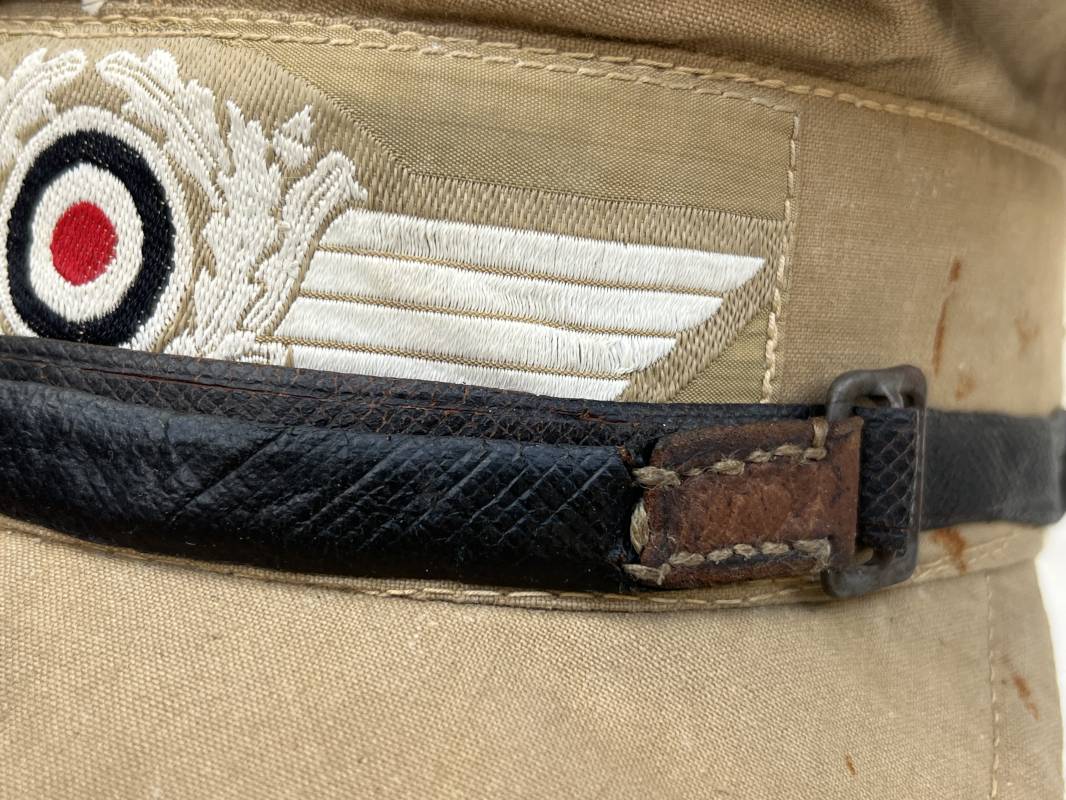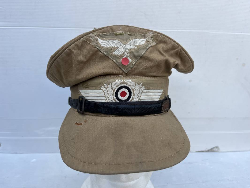 Trés rare casquette tropicale Mdle 1941 de la Luftwaffe . Casquette à visière toute arme . Confection de dotation en toile de coton jaune sable . Insignes ; aigle et cocarde montés machine d origine . Modèle spécifique a cette coiffure en tissé bevo . Visière cuir recouverte toile , jugulaire cuir noir du modéle specifique avec deux boucles métalliques . Boutons en zinc peints en jaune pour le port de la jugulaire et de la nuquière tissu ( ici manquante ) Intérieur doublé en toile de coton rouge , marquage fabricant 'Wilhem Wethekam 1943 Taille 55,5' . Casquette portée en bel état . Trés belle patine générale . 100 % nature et totalement intouchée . Rare casquette tropicale de la LW 1941/44 Ref 21882