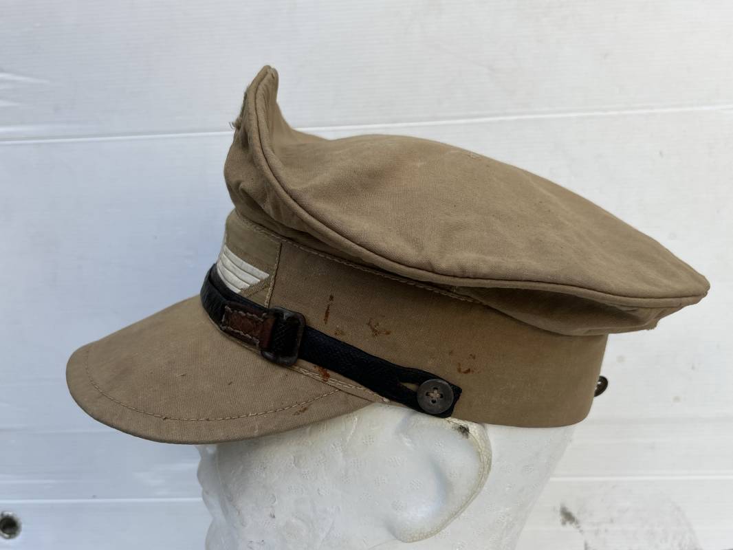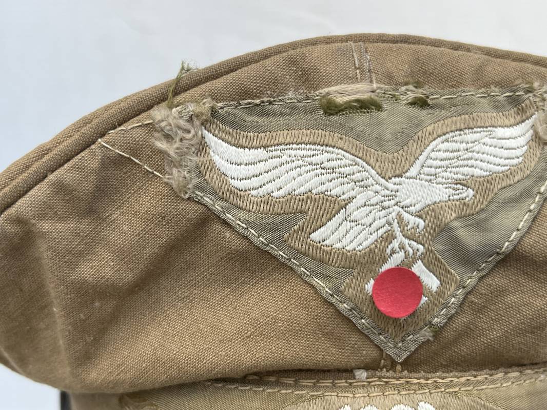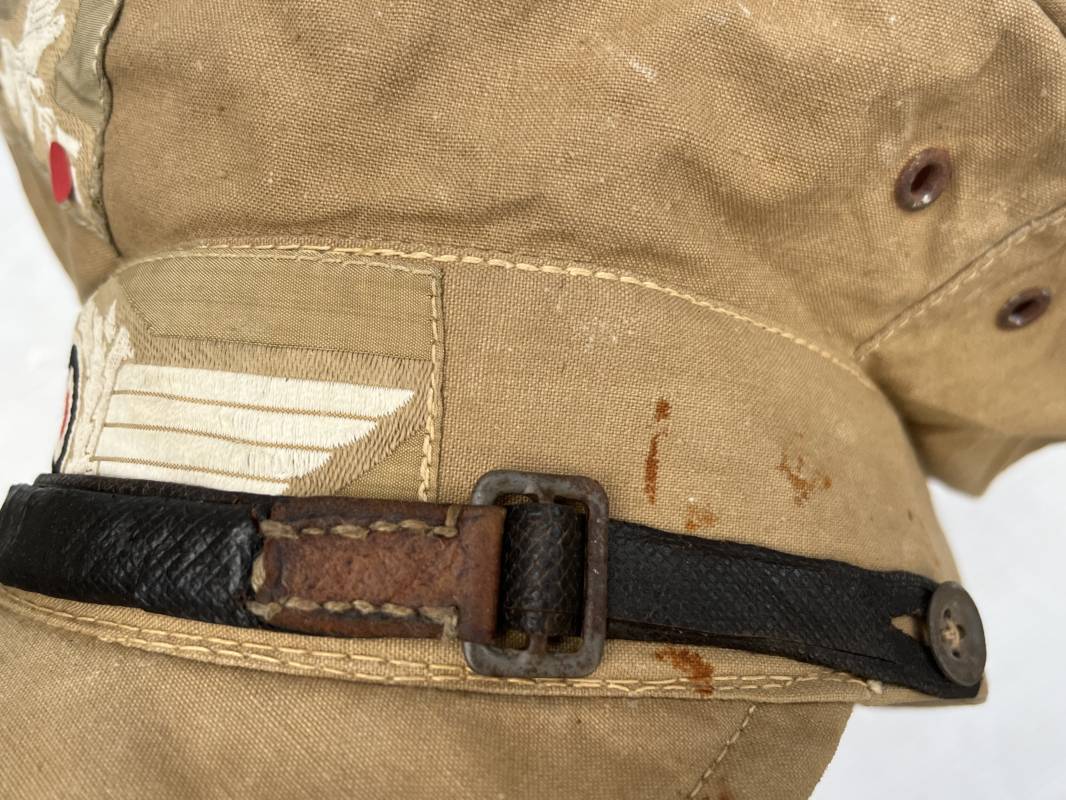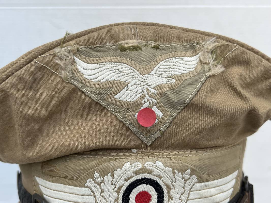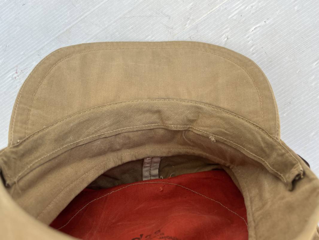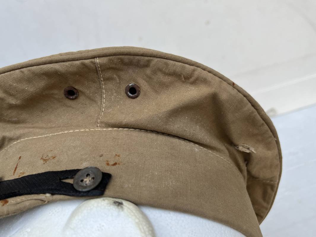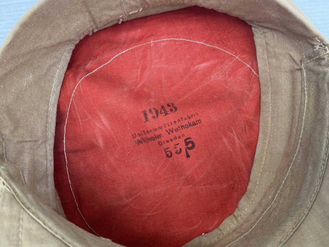 Trés rare casquette tropicale Mdle 1941 de la Luftwaffe . Casquette à visière toute arme . Confection de dotation en toile de coton jaune sable . Insignes ; aigle et cocarde montés machine d origine . Modèle spécifique a cette coiffure en tissé bevo . Visière cuir recouverte toile , jugulaire cuir noir du modéle specifique avec deux boucles métalliques . Boutons en zinc peints en jaune pour le port de la jugulaire et de la nuquière tissu ( ici manquante ) Intérieur doublé en toile de coton rouge , marquage fabricant 'Wilhem Wethekam 1943 Taille 55,5' . Casquette portée en bel état . Trés belle patine générale . 100 % nature et totalement intouchée . Rare casquette tropicale de la LW 1941/44 Ref 21882
