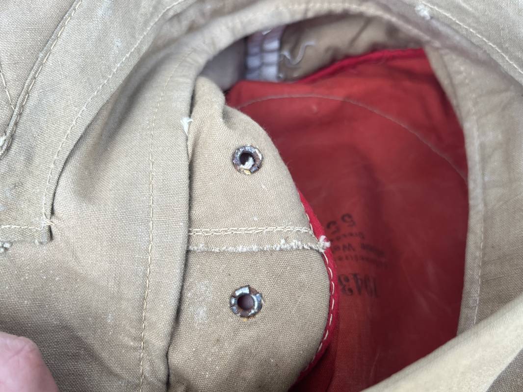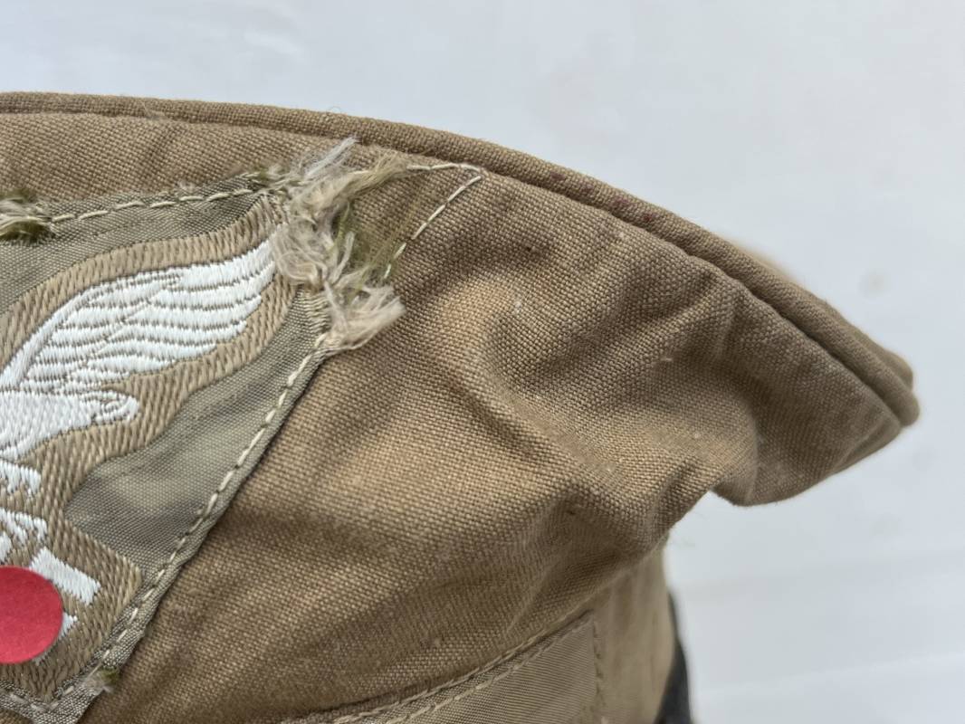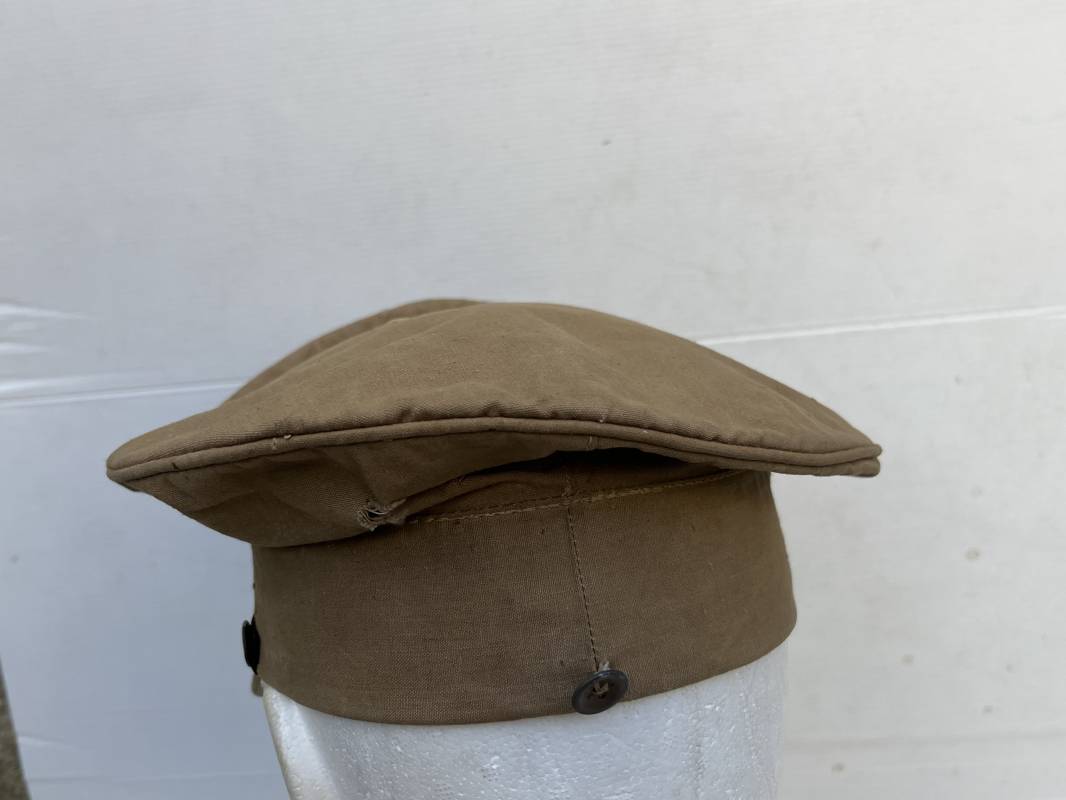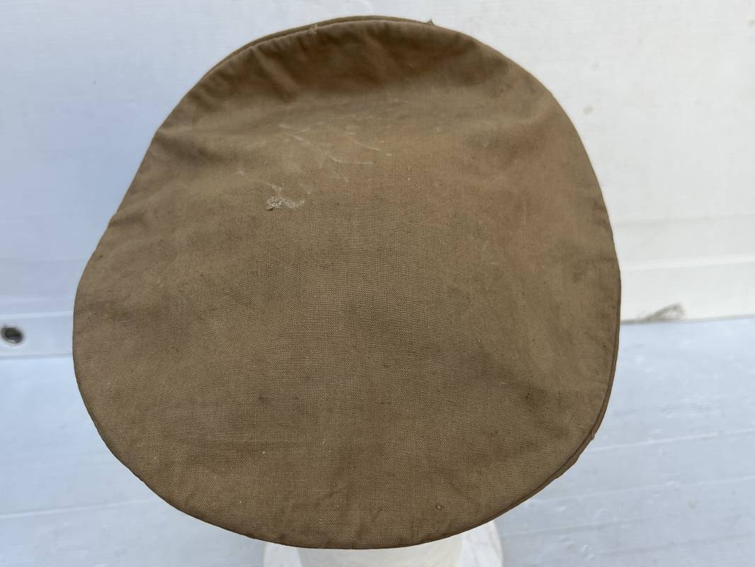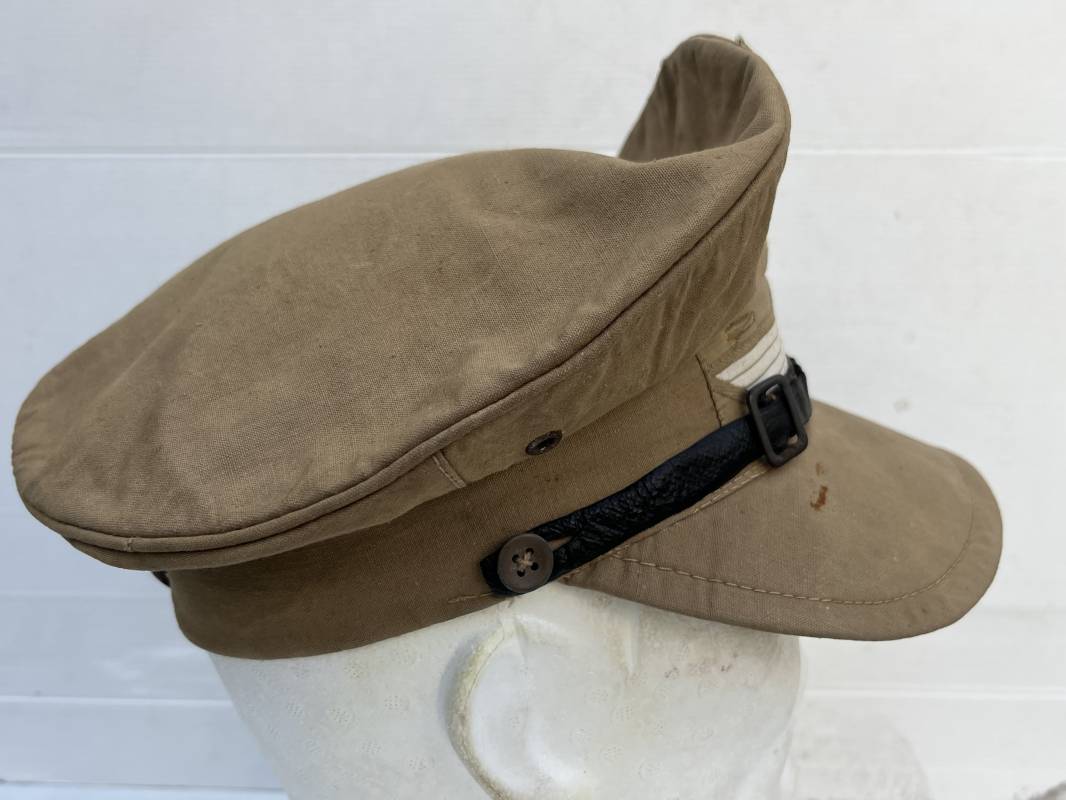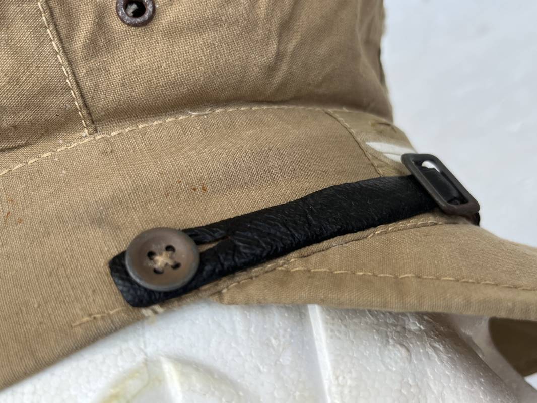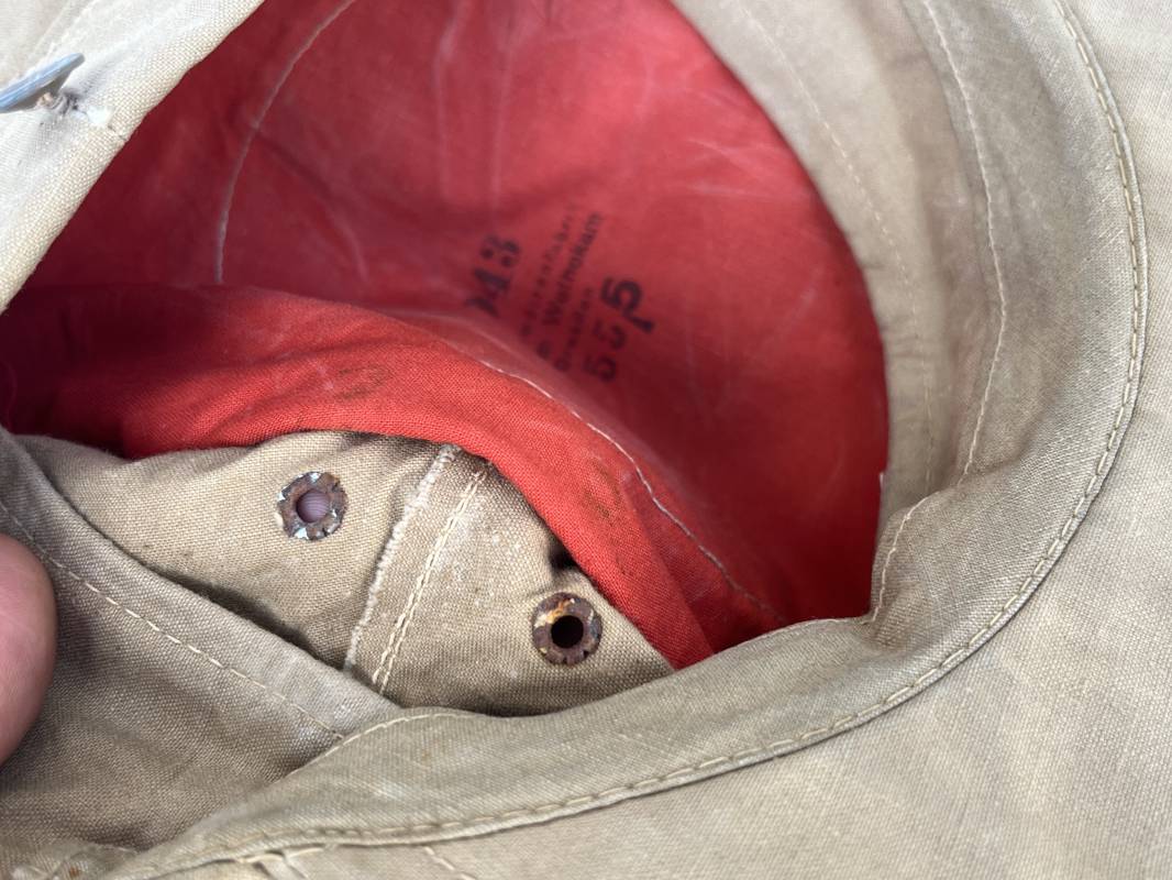 Trés rare casquette tropicale Mdle 1941 de la Luftwaffe . Casquette à visière toute arme . Confection de dotation en toile de coton jaune sable . Insignes ; aigle et cocarde montés machine d origine . Modèle spécifique a cette coiffure en tissé bevo . Visière cuir recouverte toile , jugulaire cuir noir du modéle specifique avec deux boucles métalliques . Boutons en zinc peints en jaune pour le port de la jugulaire et de la nuquière tissu ( ici manquante ) Intérieur doublé en toile de coton rouge , marquage fabricant 'Wilhem Wethekam 1943 Taille 55,5' . Casquette portée en bel état . Trés belle patine générale . 100 % nature et totalement intouchée . Rare casquette tropicale de la LW 1941/44 Ref 21882