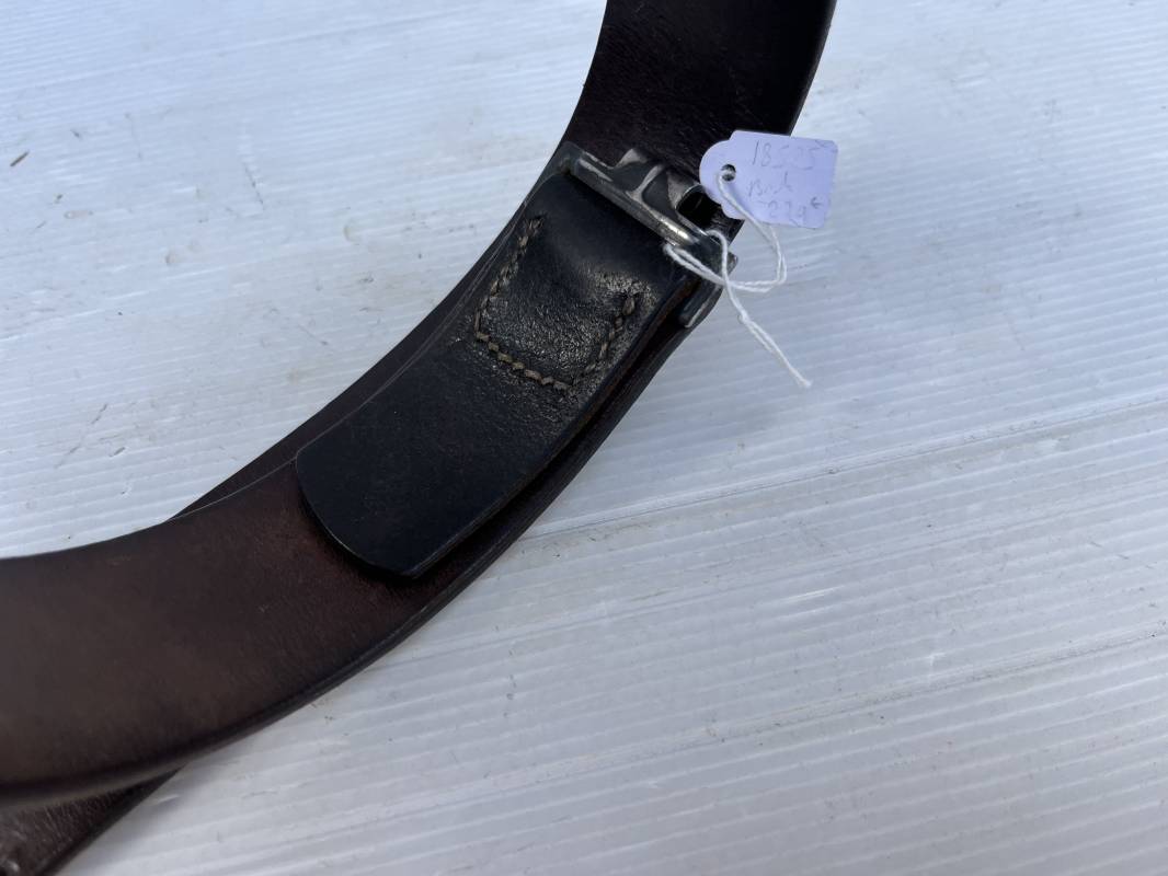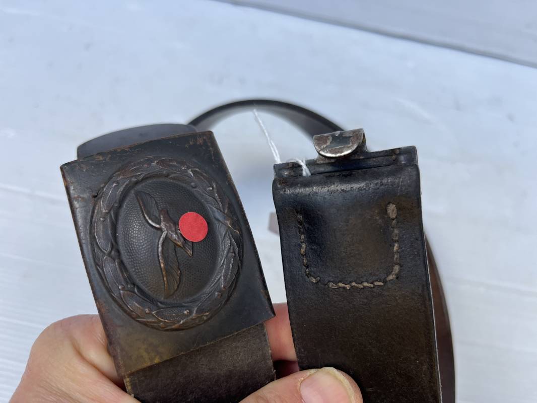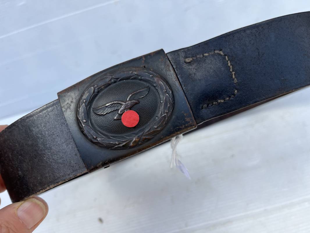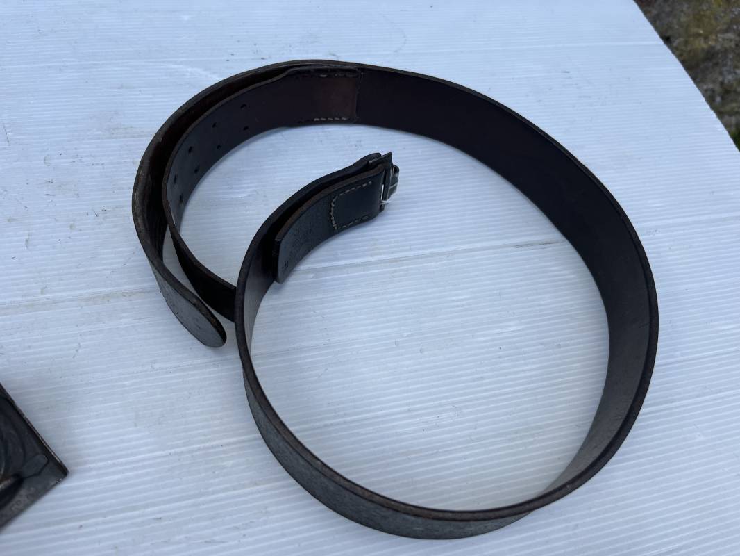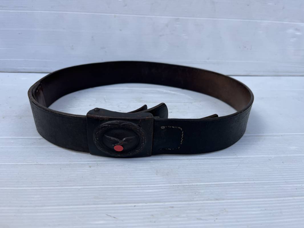 Très beau ceinturon Troupe de la Luftwaffe modéle 1940 . Boucle fer modèle 1940 , peinture gris bleu d'origine. Passant et crochet fer . Marquage fabricant au dos de la boucle DF Co 42 . Ceinturon troupe en cuir noir retourné du modéle spécifique a la LW avec coutures exterieures de languette non apparentes . . Marquage fabricant sur la languette daté 1941 . Crochet fer peint en gris bleu . Languette intèrieure en cuir .Cuir souple,. longueur 90 cm. Trés bel ensemble légèrement porté et en trés bel état . Ceinturon et boucles ont été trouvés ensemble en brocante en Normandie dans le secteur de lisieux ( 14 ) Re 21958