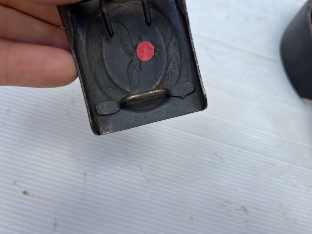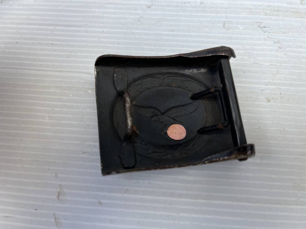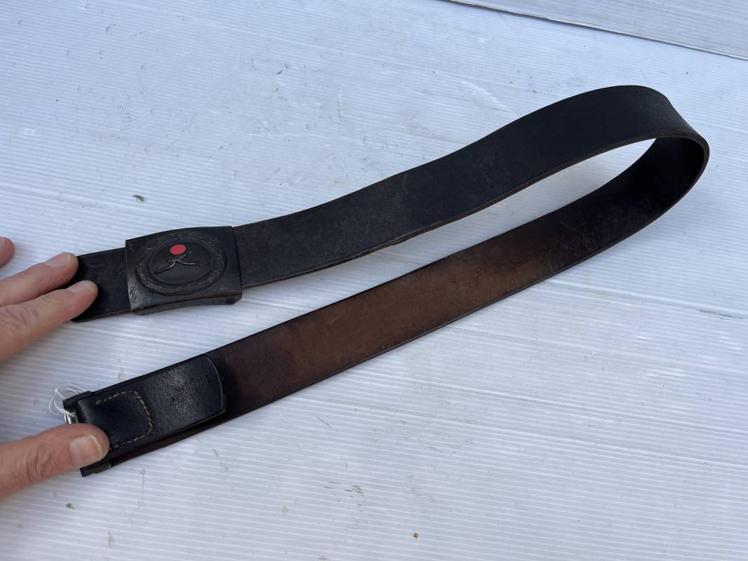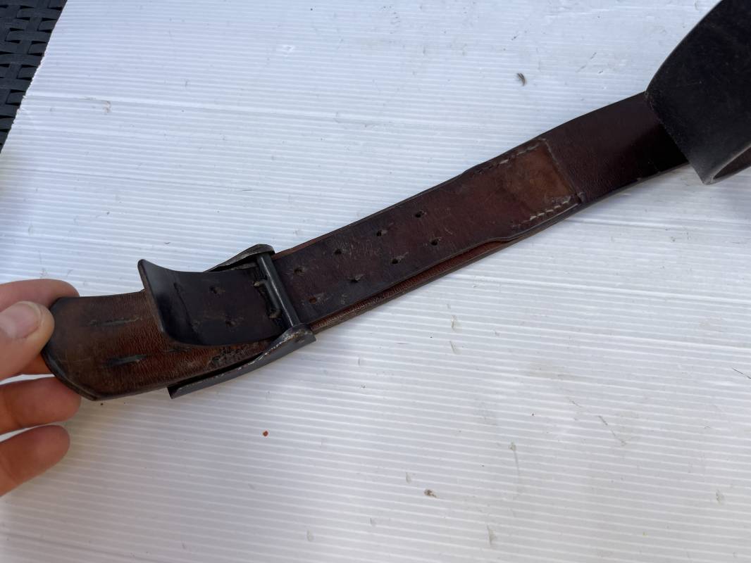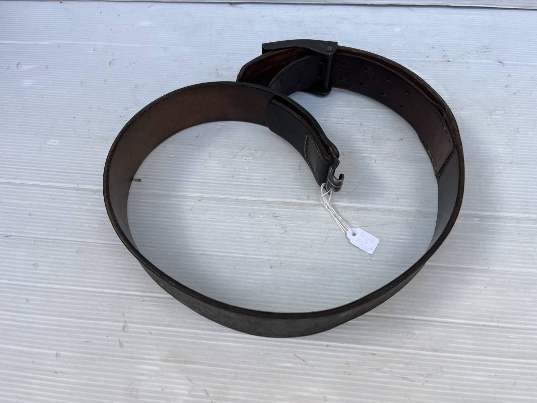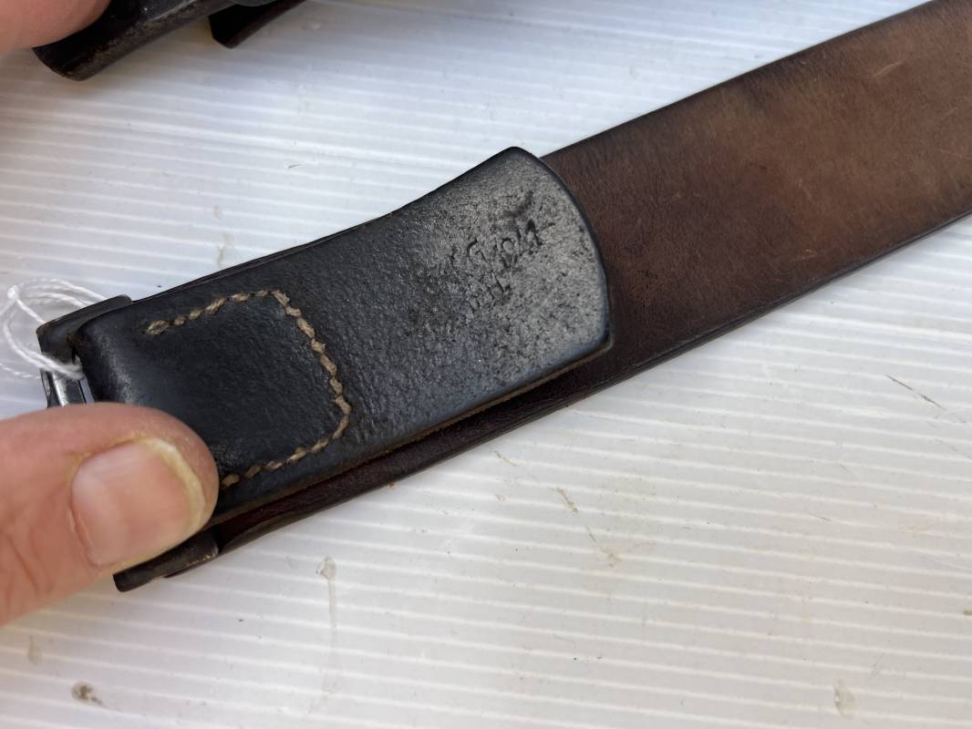 Très beau ceinturon Troupe de la Luftwaffe modéle 1940 . Boucle fer modèle 1940 , peinture gris bleu d'origine. Passant et crochet fer . Marquage fabricant au dos de la boucle DF Co 42 . Ceinturon troupe en cuir noir retourné du modéle spécifique a la LW avec coutures exterieures de languette non apparentes . . Marquage fabricant sur la languette daté 1941 . Crochet fer peint en gris bleu . Languette intèrieure en cuir .Cuir souple,. longueur 90 cm. Trés bel ensemble légèrement porté et en trés bel état . Ceinturon et boucles ont été trouvés ensemble en brocante en Normandie dans le secteur de lisieux ( 14 ) Re 21958