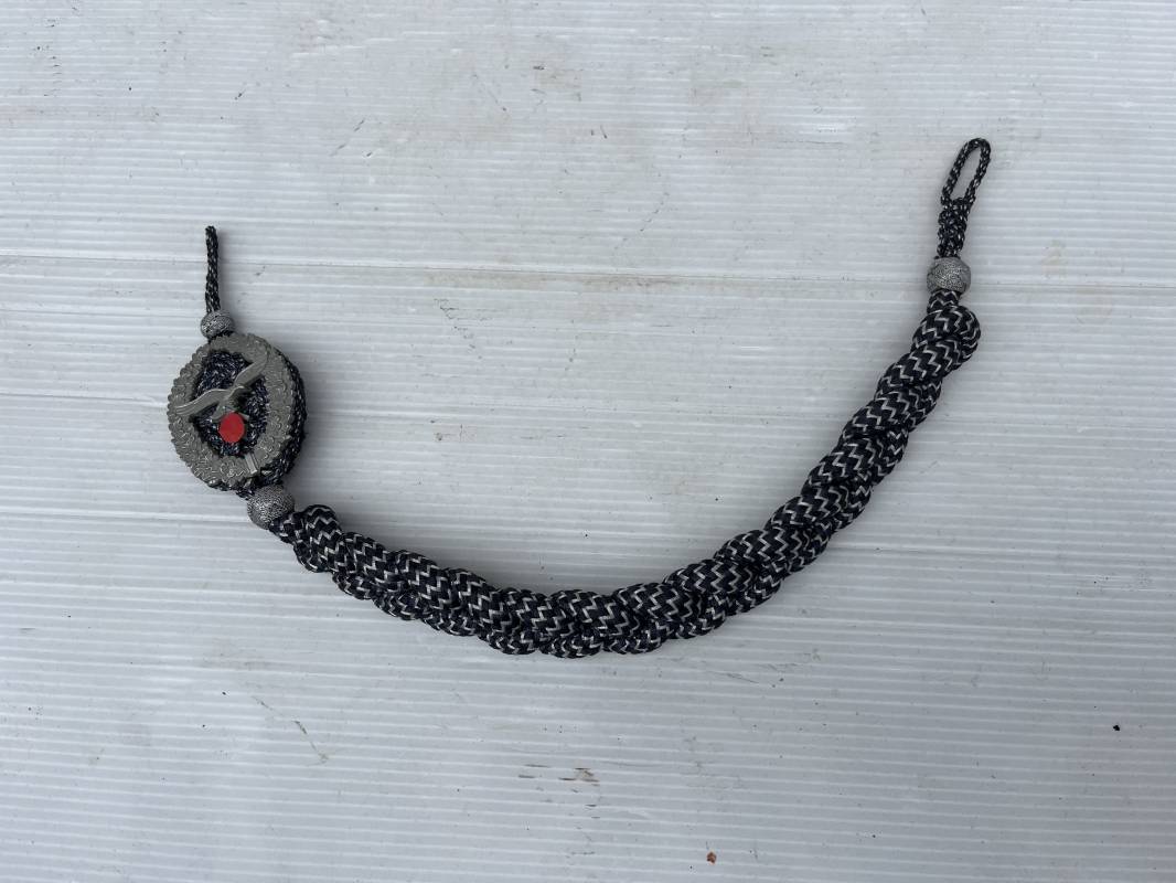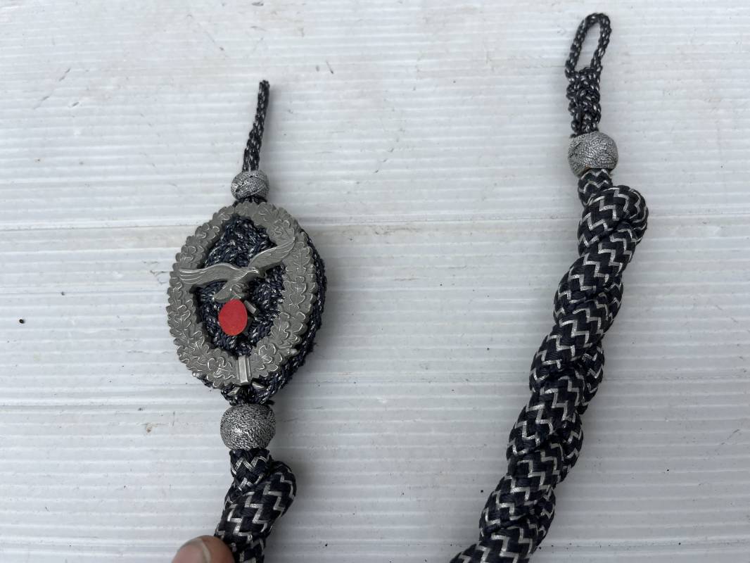 Trés beau cordon de tireur de la Luftwaffe . Cordon en coton tressé coton gris bleu . Ecu métallique avec aigle et feuilles de chène . Boutonnières . Légérement porté en parfait état Ref 22003