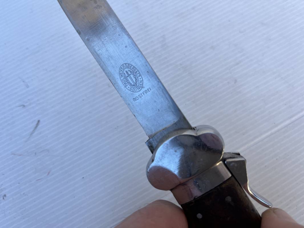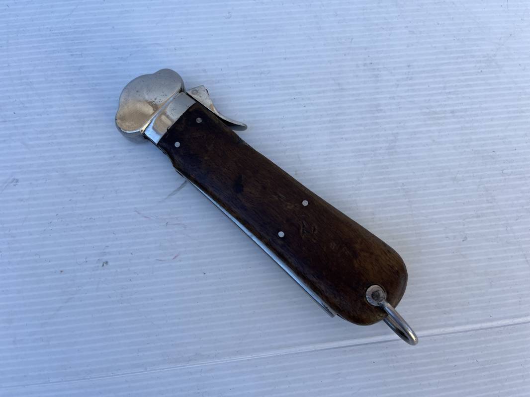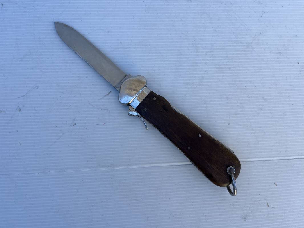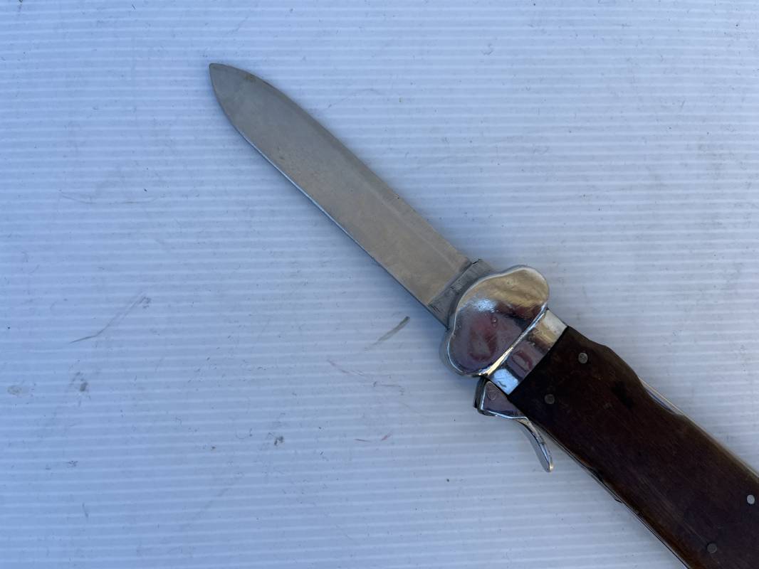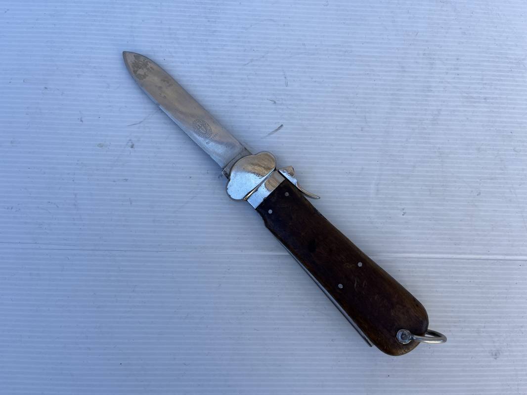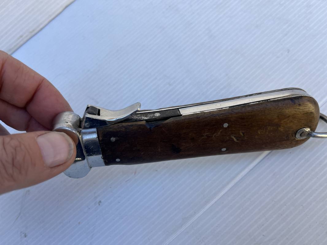 Trés beau couteau à gravité d'un navigant ou chasseur paachutiste de la Luftwaffe . Plaquette en bois rivetées . Anneau métallique pour fixation de la dragonne . Pointe basculante avec marquage de réception L5 . Lévier pour déverroullage de la lame marquage '48' . Lame acier avec marquage et logo fabricantPaul Weyersberg & Co Solingen Rostfrei .Aucune trace de corrosion sur la lame . Trés beau couteau à gravité de la Luftwaffe en parfait état Ref 19787