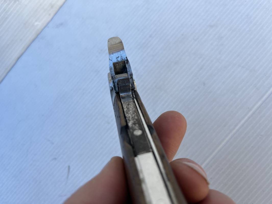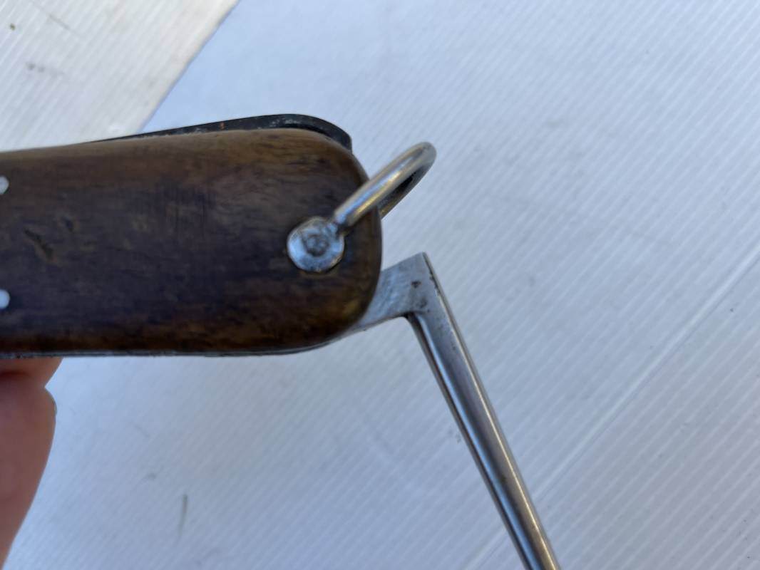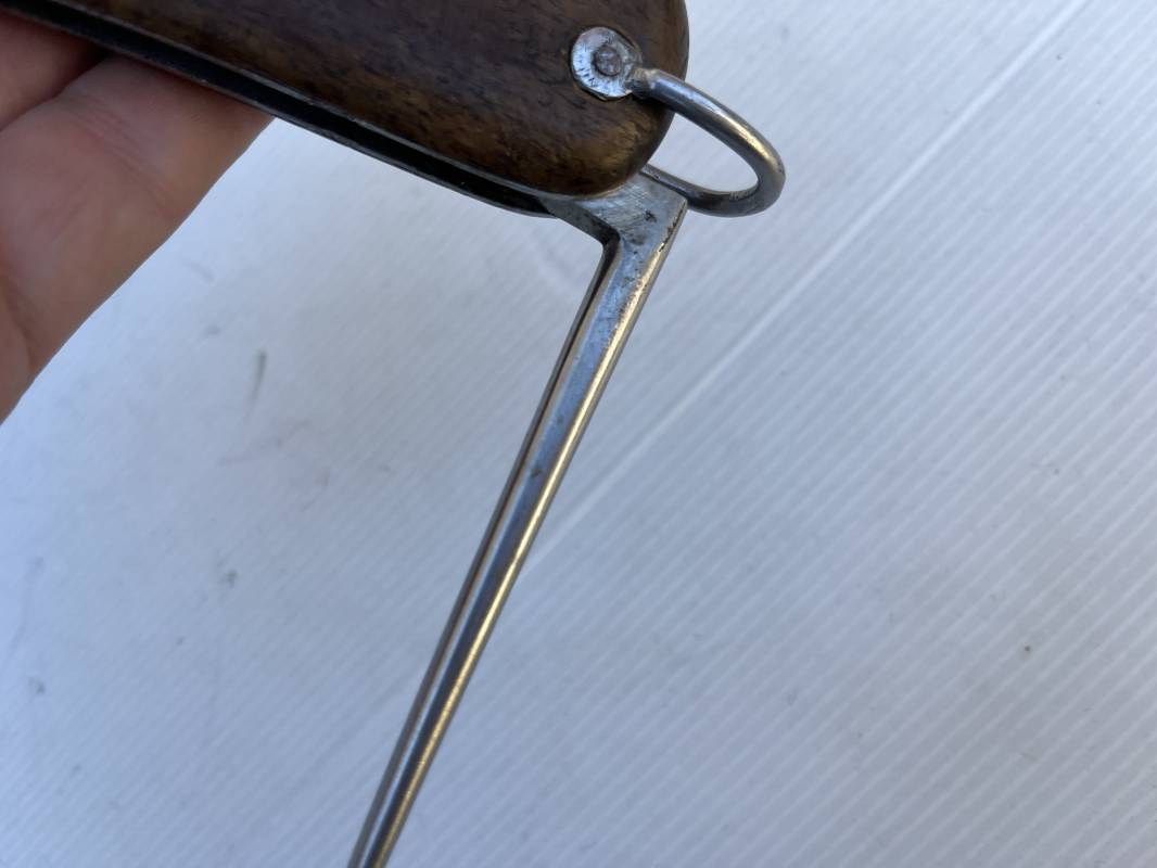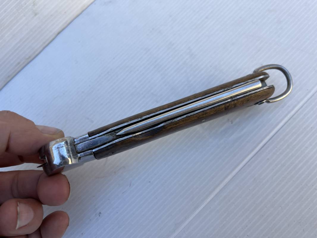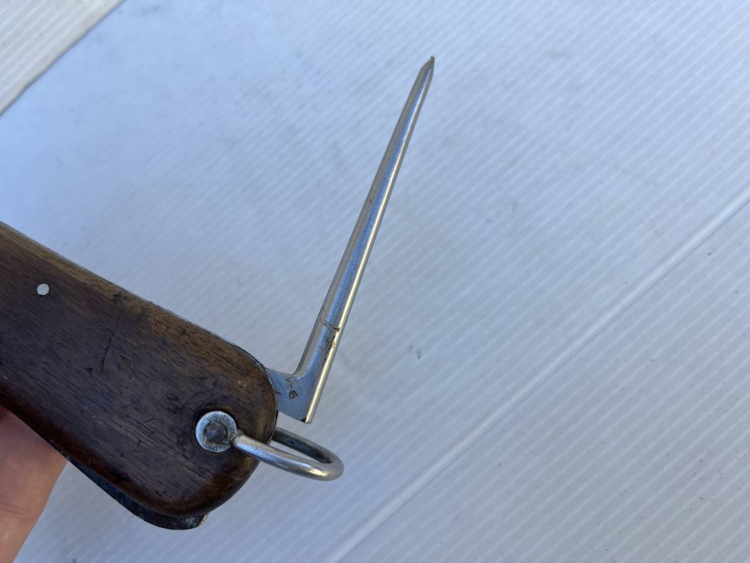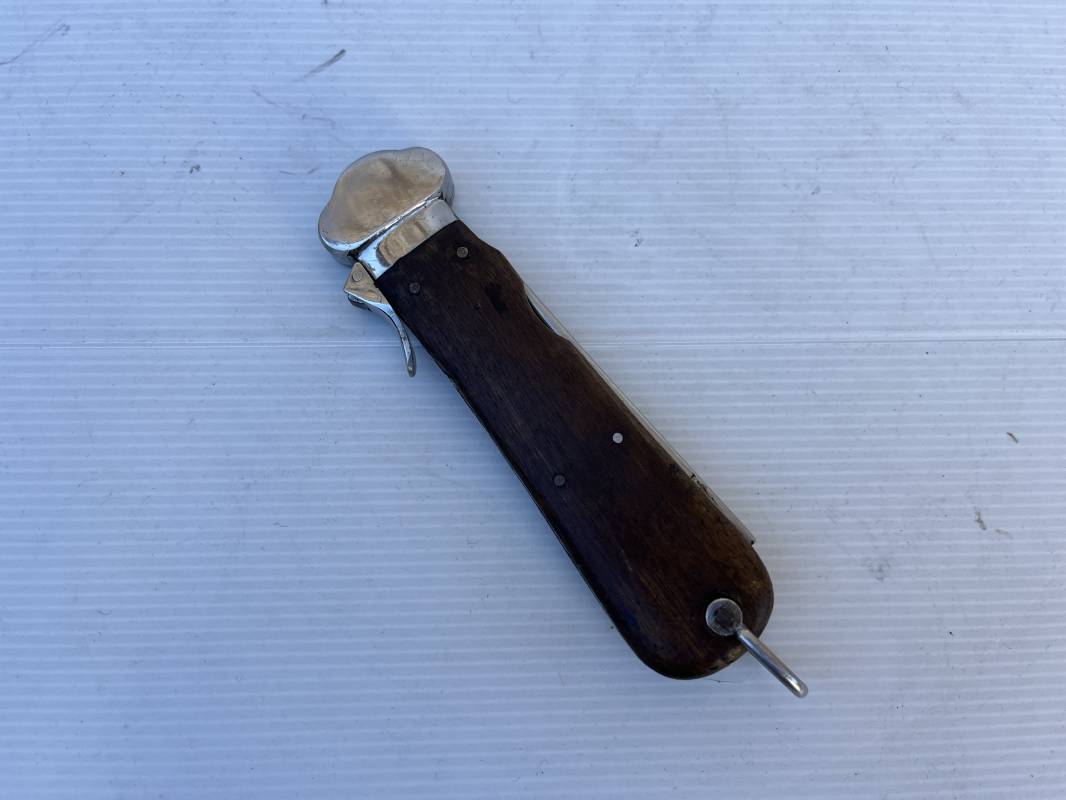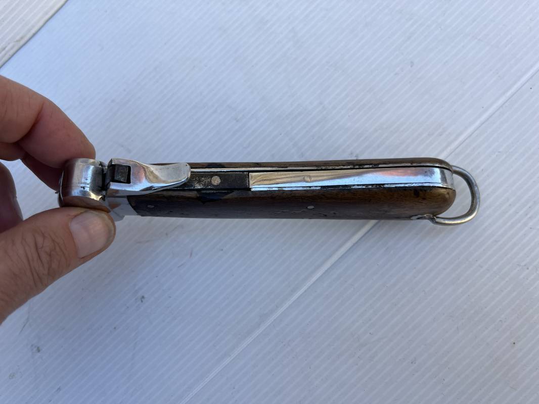 Trés beau couteau à gravité d'un navigant ou chasseur paachutiste de la Luftwaffe . Plaquette en bois rivetées . Anneau métallique pour fixation de la dragonne . Pointe basculante avec marquage de réception L5 . Lévier pour déverroullage de la lame marquage '48' . Lame acier avec marquage et logo fabricantPaul Weyersberg & Co Solingen Rostfrei .Aucune trace de corrosion sur la lame . Trés beau couteau à gravité de la Luftwaffe en parfait état Ref 19787