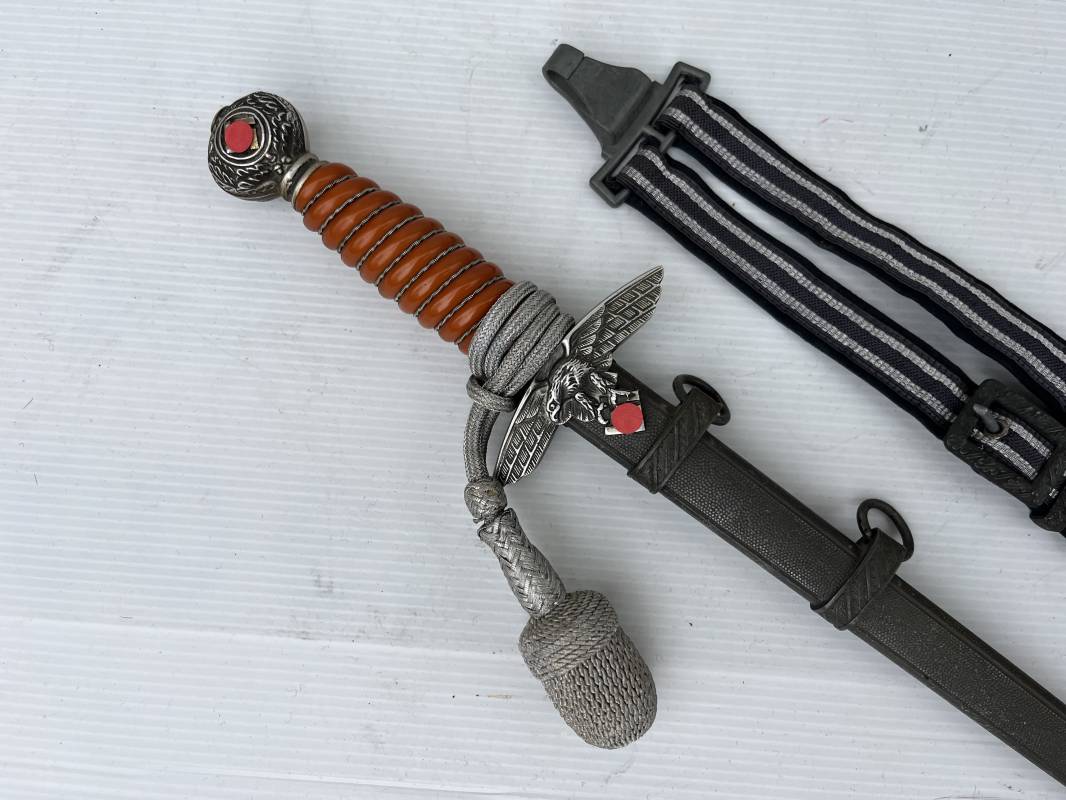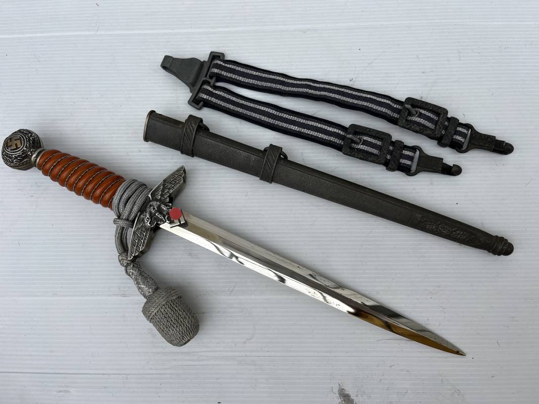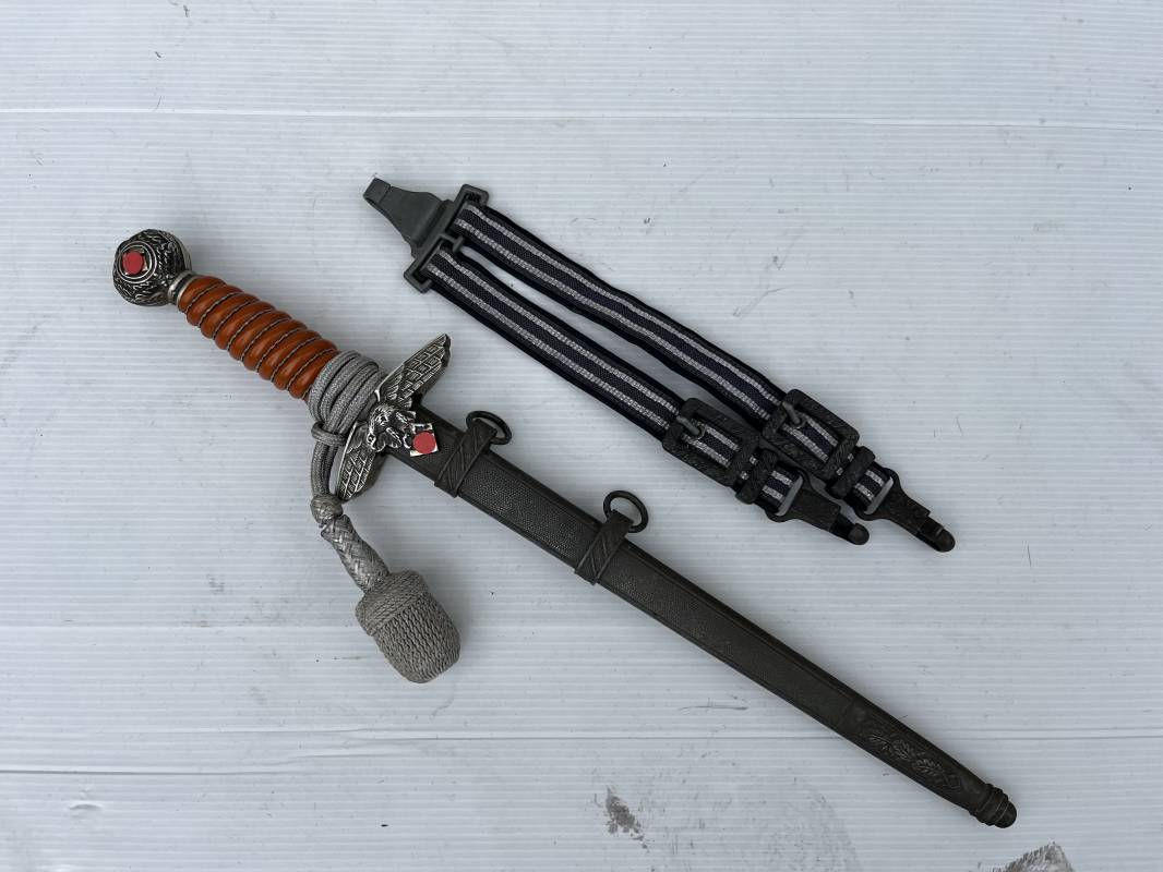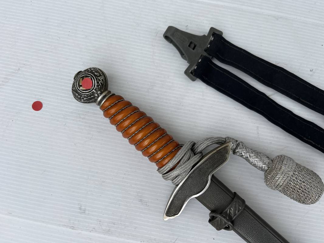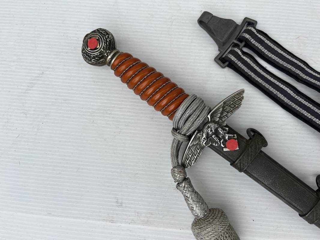 Très belle dague modèle 1937 de la Luftwaffe avec dragonne et bélière. Marquage fabricant Paul Weyersberg Solingen Marquage de reception L/5 sous logo fabricant .Poignée orange avec filigrane. Pommeau avec feuilles de chêne et croix. La croix du pommeau est dorée Garde stylisée avec aigle de la Luftwaffe. Très belle lame aciier avec marquage et logo du fabricant . Dragonne de la Luftwaffe en fil d'aluminium, gland cannetille argent. Longueur totale 35cm. Fourreau en métal grenelé, bouterolle. Deux anneaux de fixation .Bélière modèle 1937 en fil de coton gris/bleu et fil d'aluminium. Revers en velours gris/bleu. Boucles et crochets avec ornements à feuilles de chêne. Crochets de suspension à ressorts métalliques marqués' Drgm' et code ' A ' Assmann . Très belle dague, légèrement portée en parfait état. 1937/45. Ref 21634