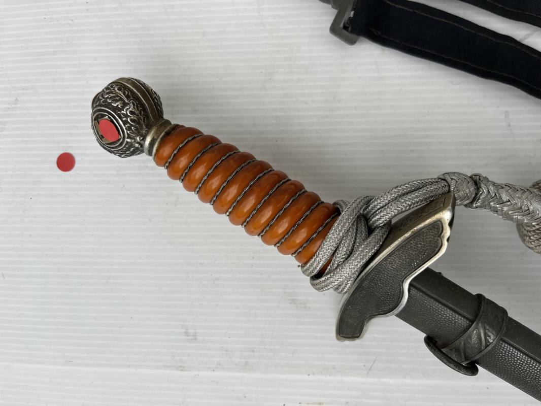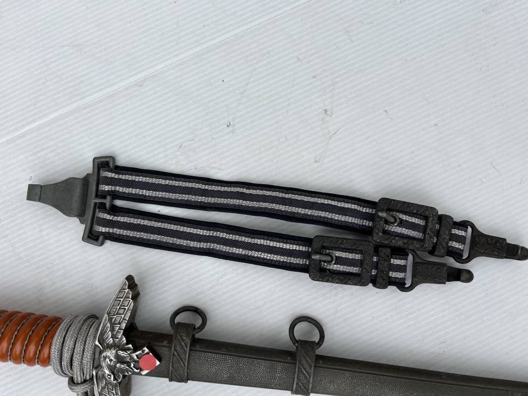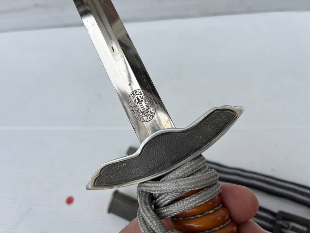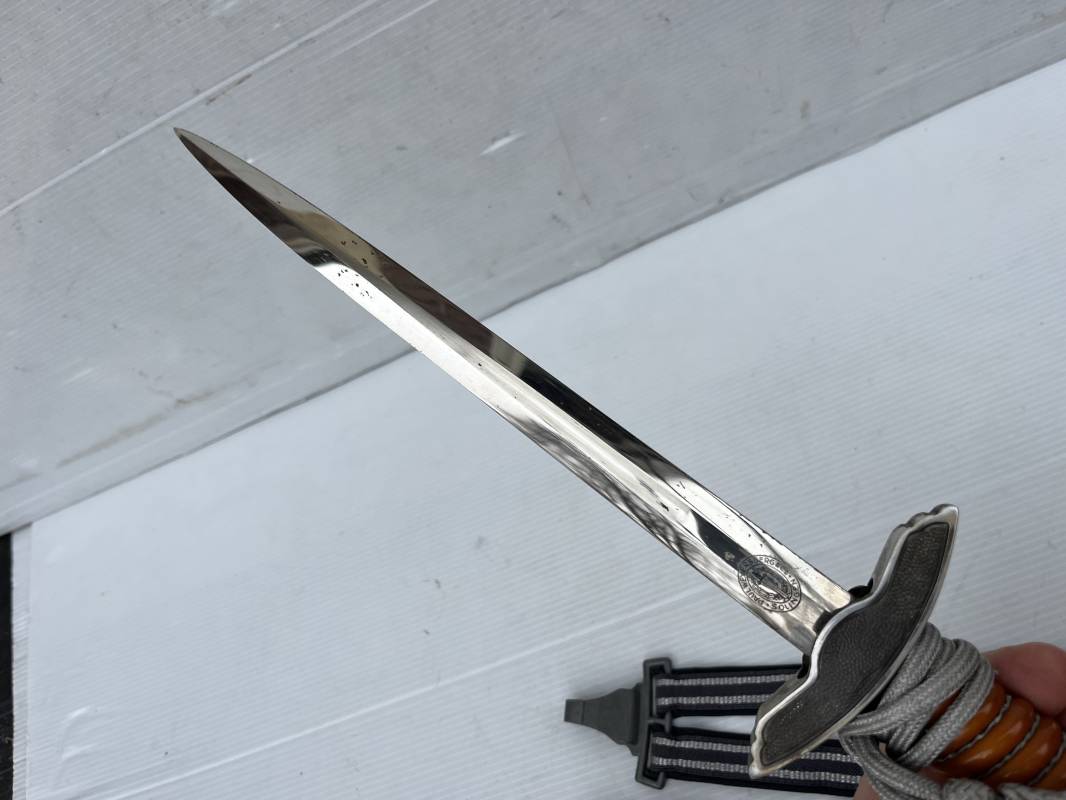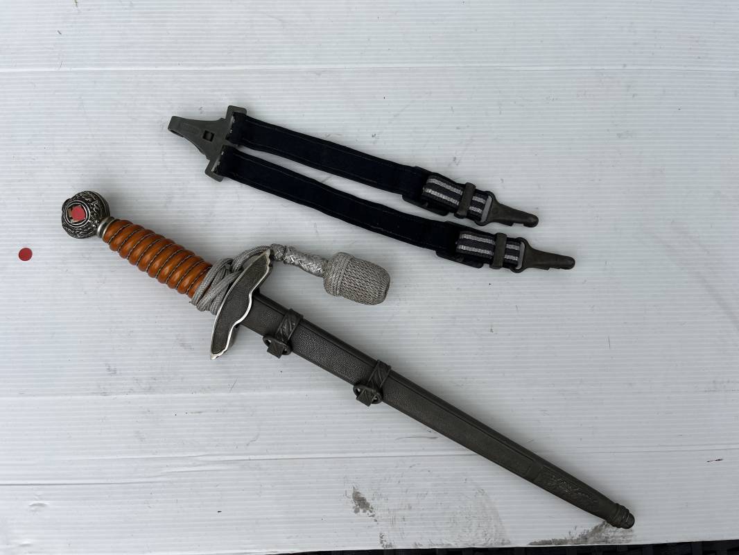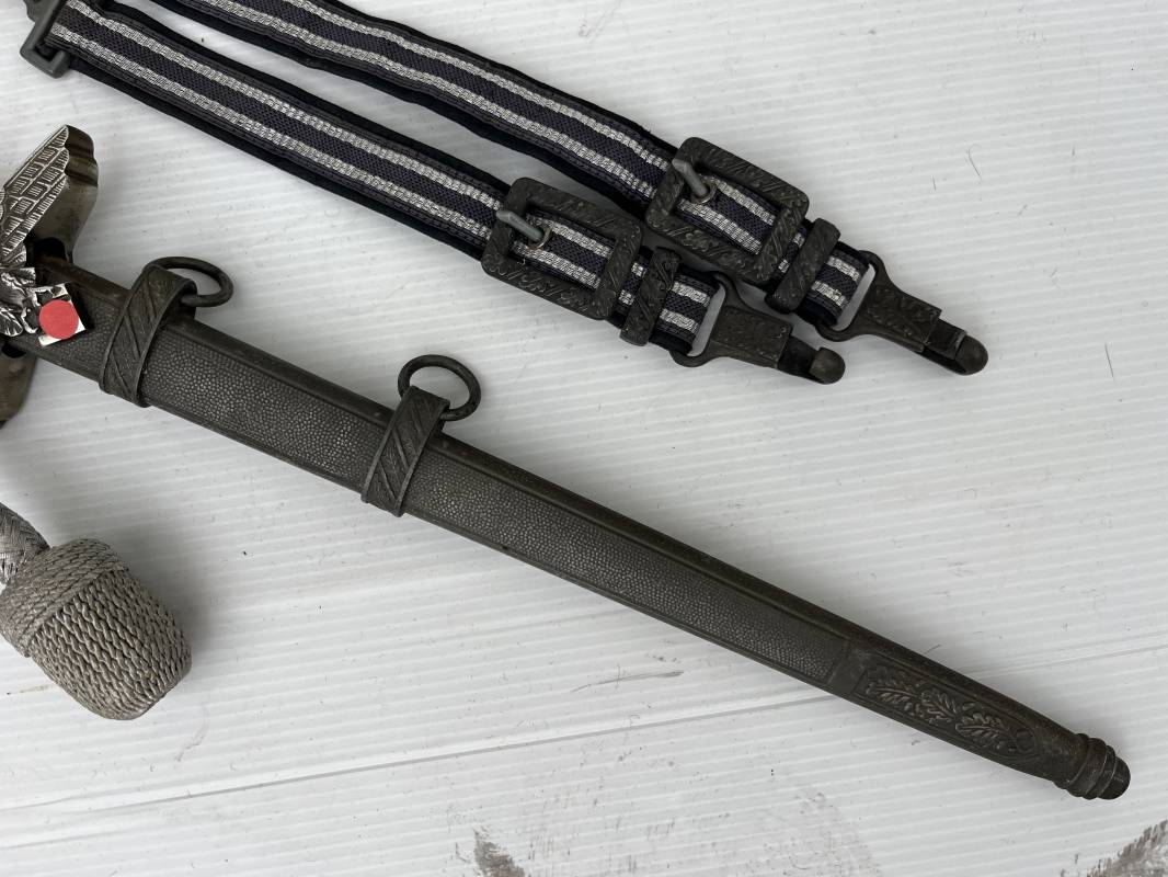 Très belle dague modèle 1937 de la Luftwaffe avec dragonne et bélière. Marquage fabricant Paul Weyersberg Solingen Marquage de reception L/5 sous logo fabricant .Poignée orange avec filigrane. Pommeau avec feuilles de chêne et croix. La croix du pommeau est dorée Garde stylisée avec aigle de la Luftwaffe. Très belle lame aciier avec marquage et logo du fabricant . Dragonne de la Luftwaffe en fil d'aluminium, gland cannetille argent. Longueur totale 35cm. Fourreau en métal grenelé, bouterolle. Deux anneaux de fixation .Bélière modèle 1937 en fil de coton gris/bleu et fil d'aluminium. Revers en velours gris/bleu. Boucles et crochets avec ornements à feuilles de chêne. Crochets de suspension à ressorts métalliques marqués' Drgm' et code ' A ' Assmann . Très belle dague, légèrement portée en parfait état. 1937/45. Ref 21634