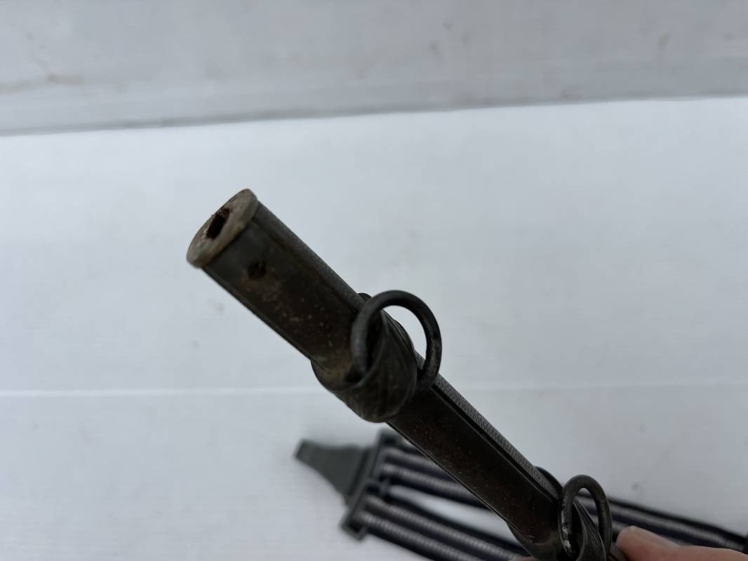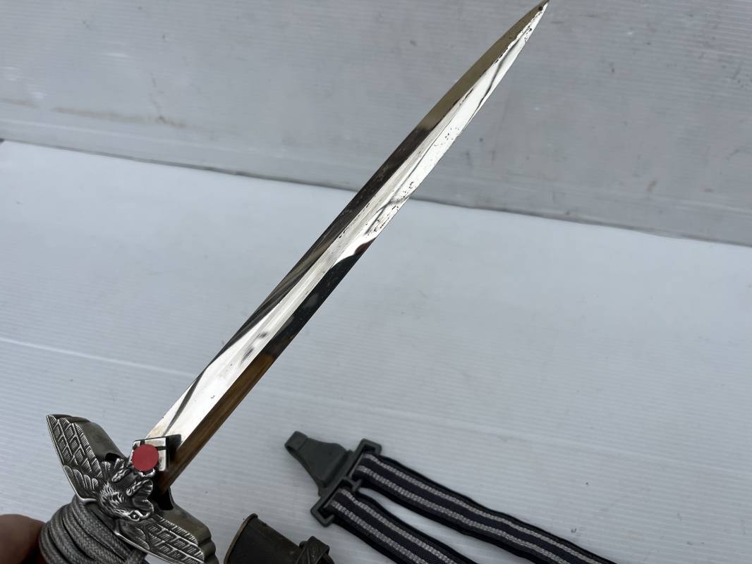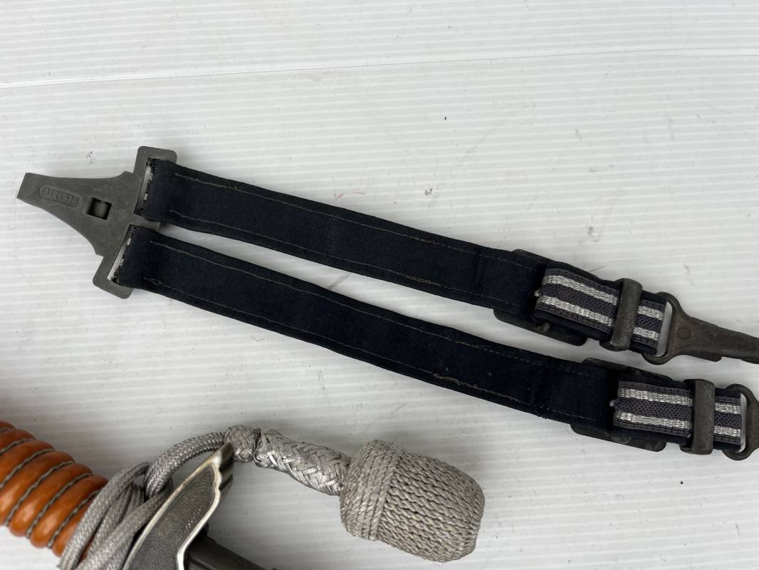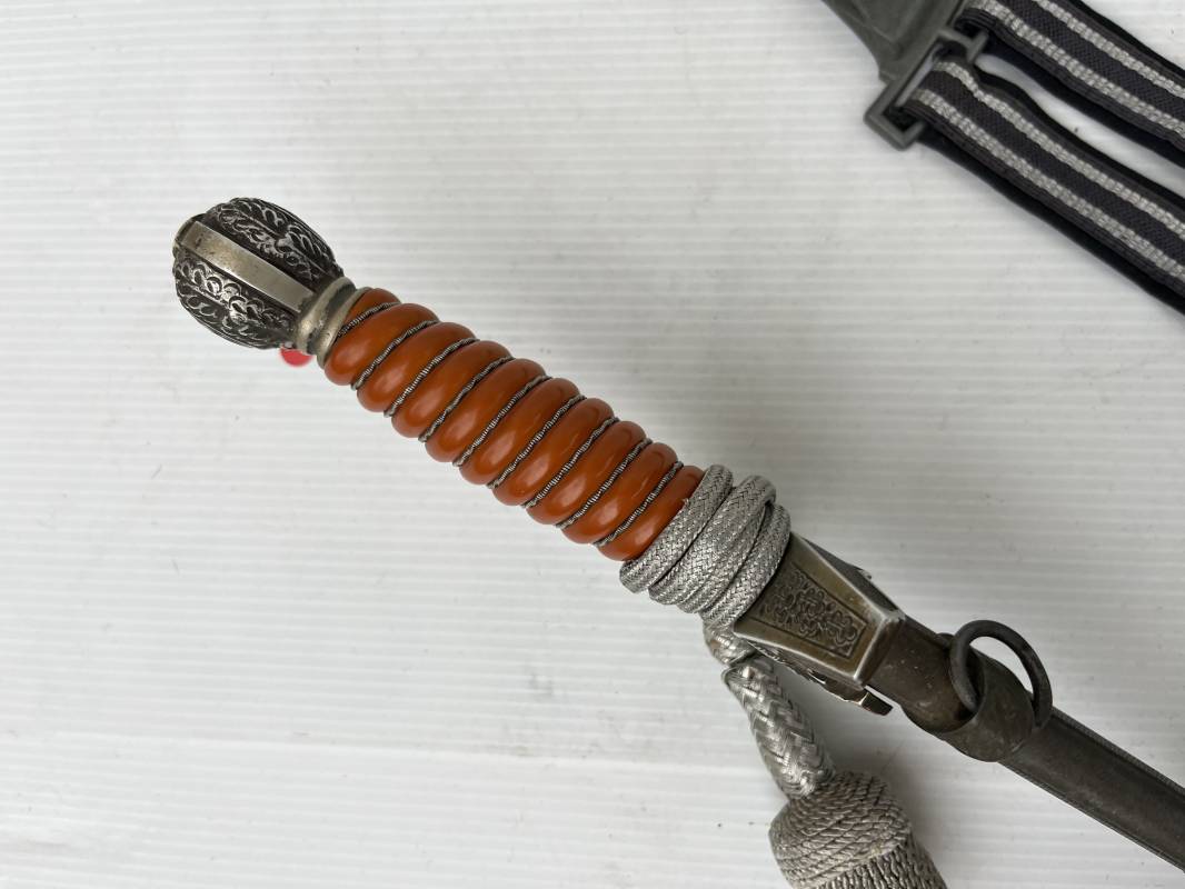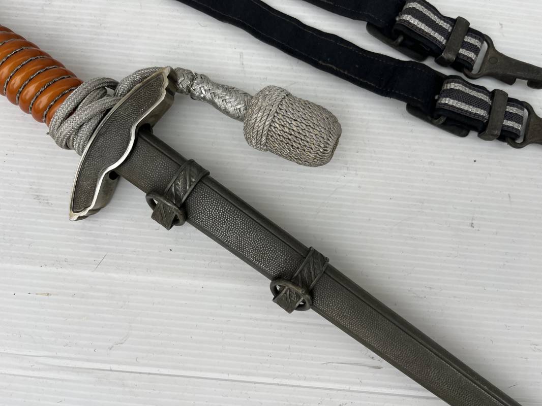 Très belle dague modèle 1937 de la Luftwaffe avec dragonne et bélière. Marquage fabricant Paul Weyersberg Solingen Marquage de reception L/5 sous logo fabricant .Poignée orange avec filigrane. Pommeau avec feuilles de chêne et croix. La croix du pommeau est dorée Garde stylisée avec aigle de la Luftwaffe. Très belle lame aciier avec marquage et logo du fabricant . Dragonne de la Luftwaffe en fil d'aluminium, gland cannetille argent. Longueur totale 35cm. Fourreau en métal grenelé, bouterolle. Deux anneaux de fixation .Bélière modèle 1937 en fil de coton gris/bleu et fil d'aluminium. Revers en velours gris/bleu. Boucles et crochets avec ornements à feuilles de chêne. Crochets de suspension à ressorts métalliques marqués' Drgm' et code ' A ' Assmann . Très belle dague, légèrement portée en parfait état. 1937/45. Ref 21634